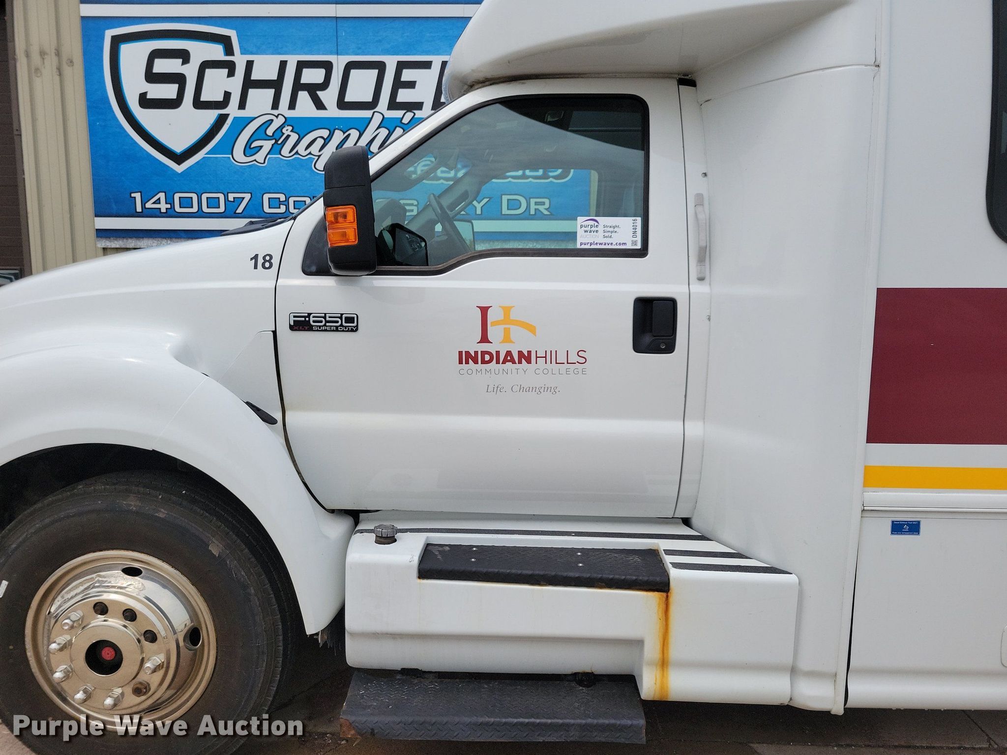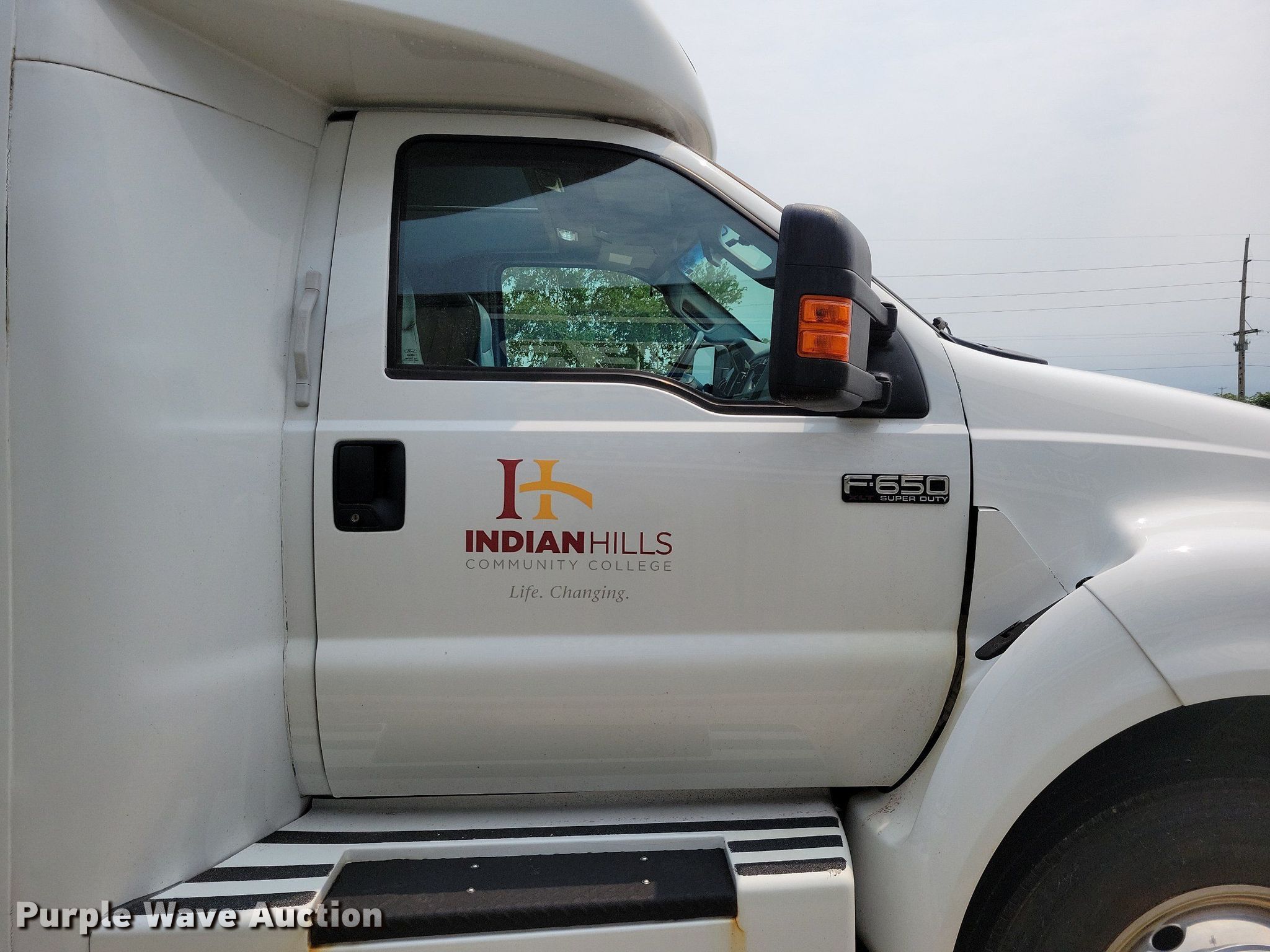 2015 Ford F650 Super Duty XLT coach bus. Miles: 198,322 on odometer, VIN: 3FRNF6FC9FV657245. Engine Cummins ISB 6.7, Serial: 73695407, Displacement: 6.7L, Cylinders: 6, Fuel type: Diesel, HP: 240. Transmission Automatic. Chassis Axles: Single, Suspension: Air, Brakes: Hydraulic, GVWR: 25,999 lbs, Wheelbase: 260". Interior AC, Heat, Heated mirrors, Cruise control, Auxiliary controls, Passengers: 36, Adult seats: 37. Tires Size: 10R22.5. Iowa title. Seller is a government entity who will be assigning and distributing the title. Please contact the seller for distribution questions. Indian Hills Community College. 525 Grandview Ave. Ottumwa, IA 52501