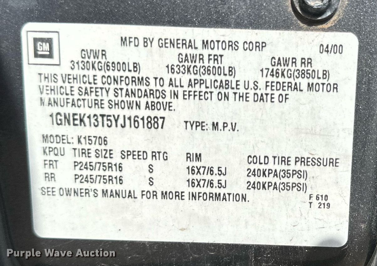 Purple Wave is selling a used Passenger Vehicle in Texas. This item is a 2000 Chevrolet Tahoe SUV with the following: Miles: 162,792 on odometer, VIN: 1GNEK13T5YJ161887