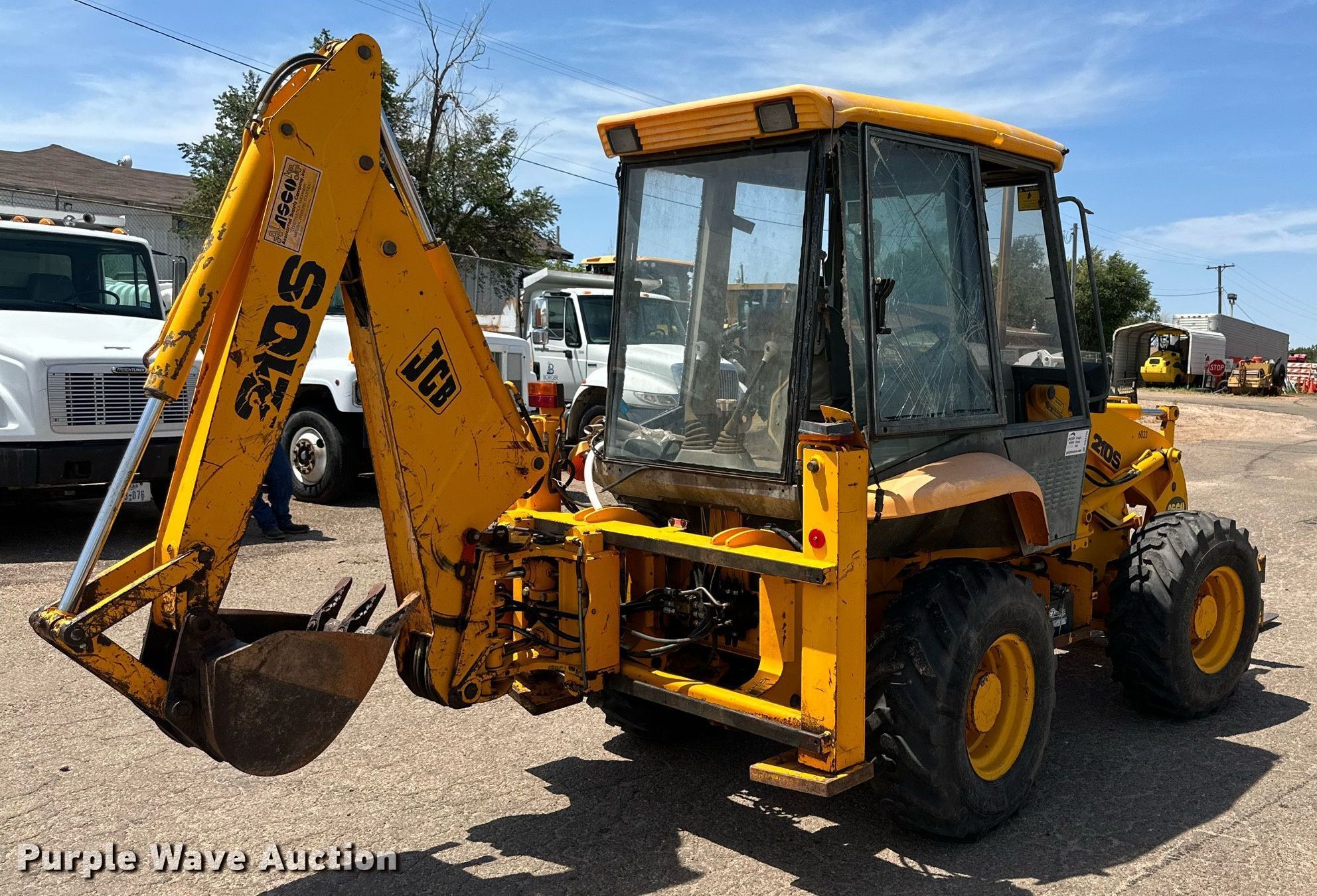 1997 JCB 210S backhoe. Hours: 4,329 on meter, Serial: 0760855. Engine Perkins, Cylinders: 4, Fuel type: Diesel. Transmission Powershift, 4F - 4R. Chassis Four wheel drive. Operators station OROPS, Backhoe controls: Wobble stick / two stick. Features Loader Auxiliary hydraulics, Bucket Width: 72", Cutting edge: Bolt-on, Forks JCB, Length: 48", Backhoe Bucket Width: 17", Cutting edge: Bolt-on, Teeth: 3.. Tires Size: 340/80-18. Notes Glass cracked, Hydraulic leak, Door missing. City of Borger. 801 N Florida St. Borger, TX 79007
