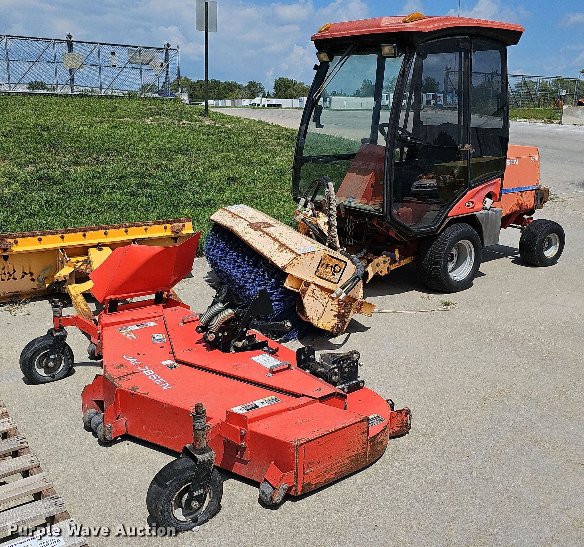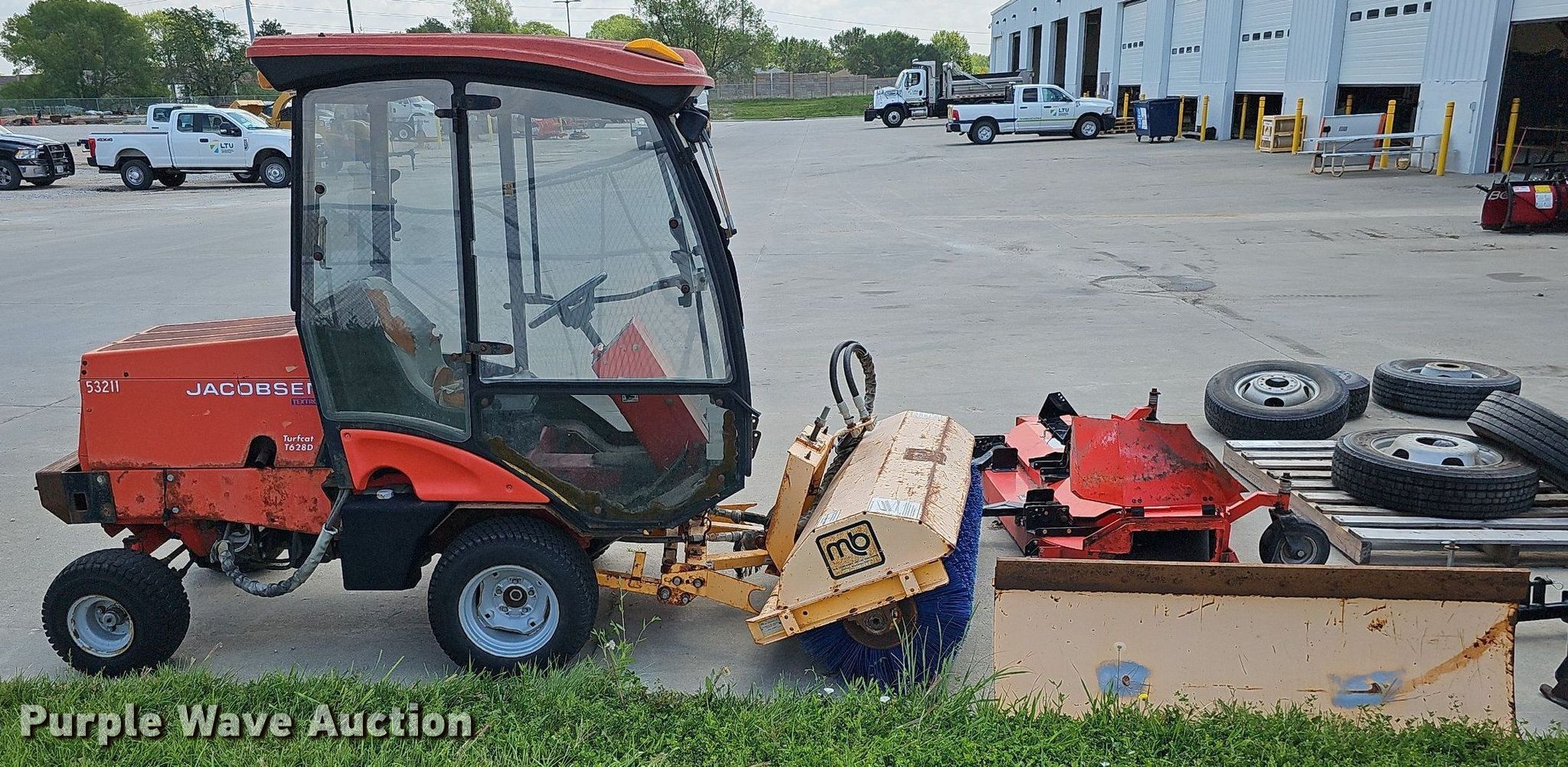 Jacobsen Turfcat T628D lawn mower. Hours: 1,469 on meter, Serial: 94671300585, Unit #: 53211. Engine Kubota, Cylinders: 3, Fuel type: Diesel. Transmission Hydrostatic. Operators station Enclosed cab. Features Counter weights, Front blade MB, Width: 60", Mower deck Jacobsen, Width: 72", Broom MB, Width: 60". Tires Front: 23x10.5-12, Rear: 18x8.50-8. Notes Unknown operating condition. Lincoln Fleet Services. 901 West Bond Street. Lincoln, NE 68521