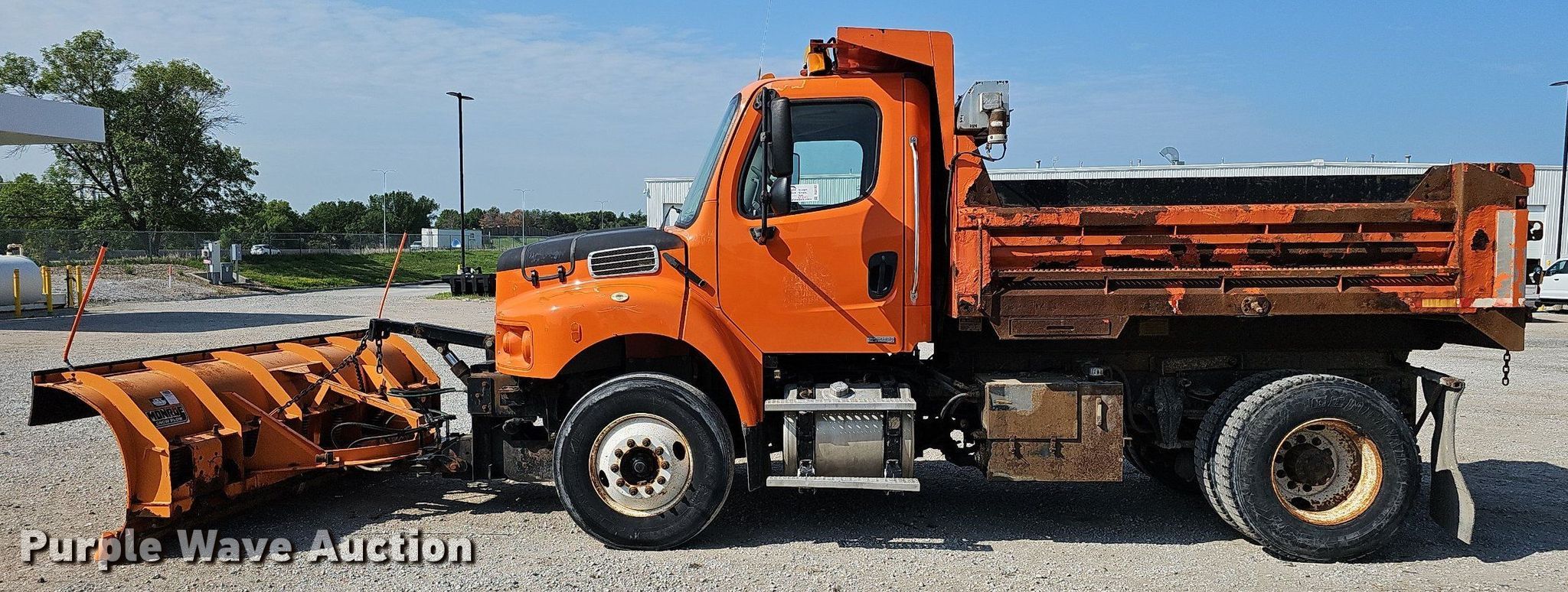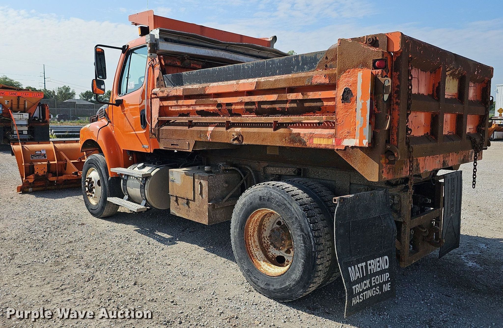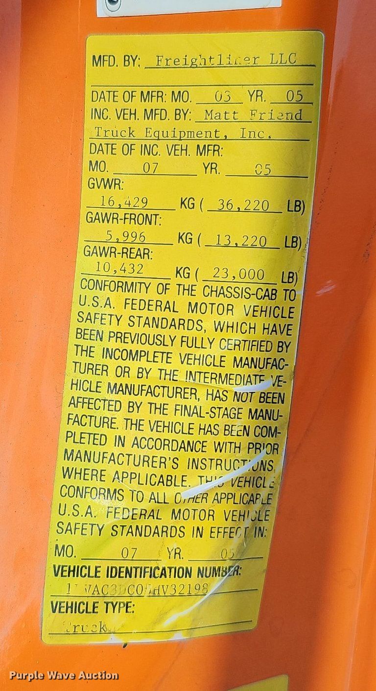 2005 Freightliner Business Class M2 106 dump truck. Miles: 76,104 on odometer, Hours: 9,338 on meter, VIN: 1FVAC3DC05HV32198, Unit #: 24089. Engine Displacement: 7.2L, Cylinders: 6, Fuel type: Diesel. Transmission Automatic. Chassis Axles: Single, Differential lock: Inter-axle, Suspension: Spring, Brakes: Air, PTO, GVWR: 36,220 lbs FAWR: 13,220 lbs, RAWR: 23,000 lbs, Wheelbase: 152". Interior Heat, Cruise control. Features Dump bed 10' L x 96" W, Side height: 24", Side board height: 6", Bed type: Steel, Bed vibrator, Roll tarp, Ram: Single , End gate: Air operated, Plow Monroe, Width: 120". Tires Size: 11R22.5. Notes Dead battery, Hydraulic pump leak. Nebraska title. Title distribution may be delayed up to 14 days from verification of funds. Lincoln Fleet Services. 901 West Bond Street. Lincoln, NE 68521