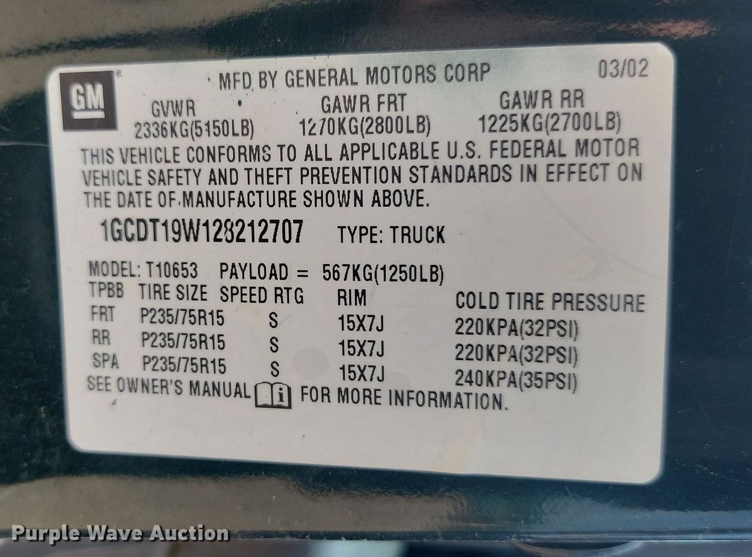 Purple Wave is selling a used Compact Pickup or Van in South Dakota. This item is a 2002 Chevrolet S10 Ext. Cab pickup truck with the following: Miles: 89,312 on odometer, VIN: 1GCDT19W128212707