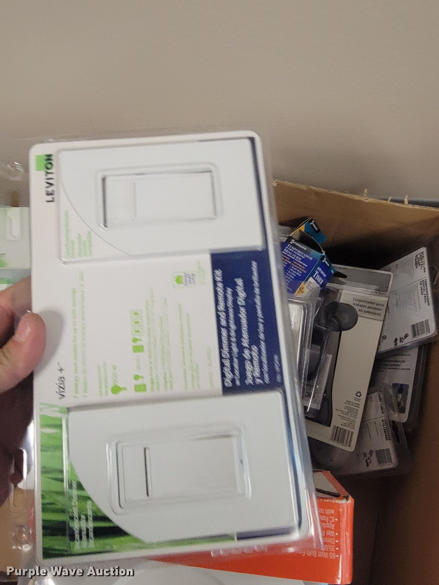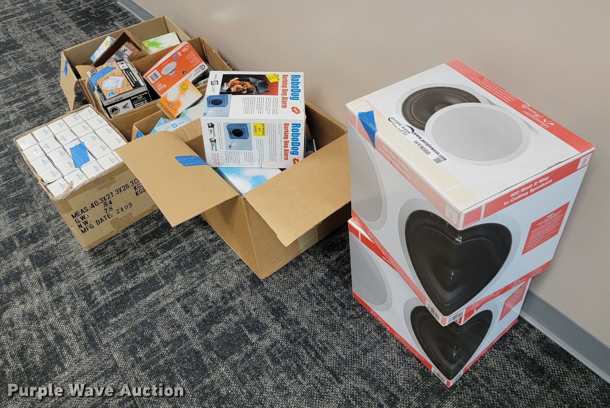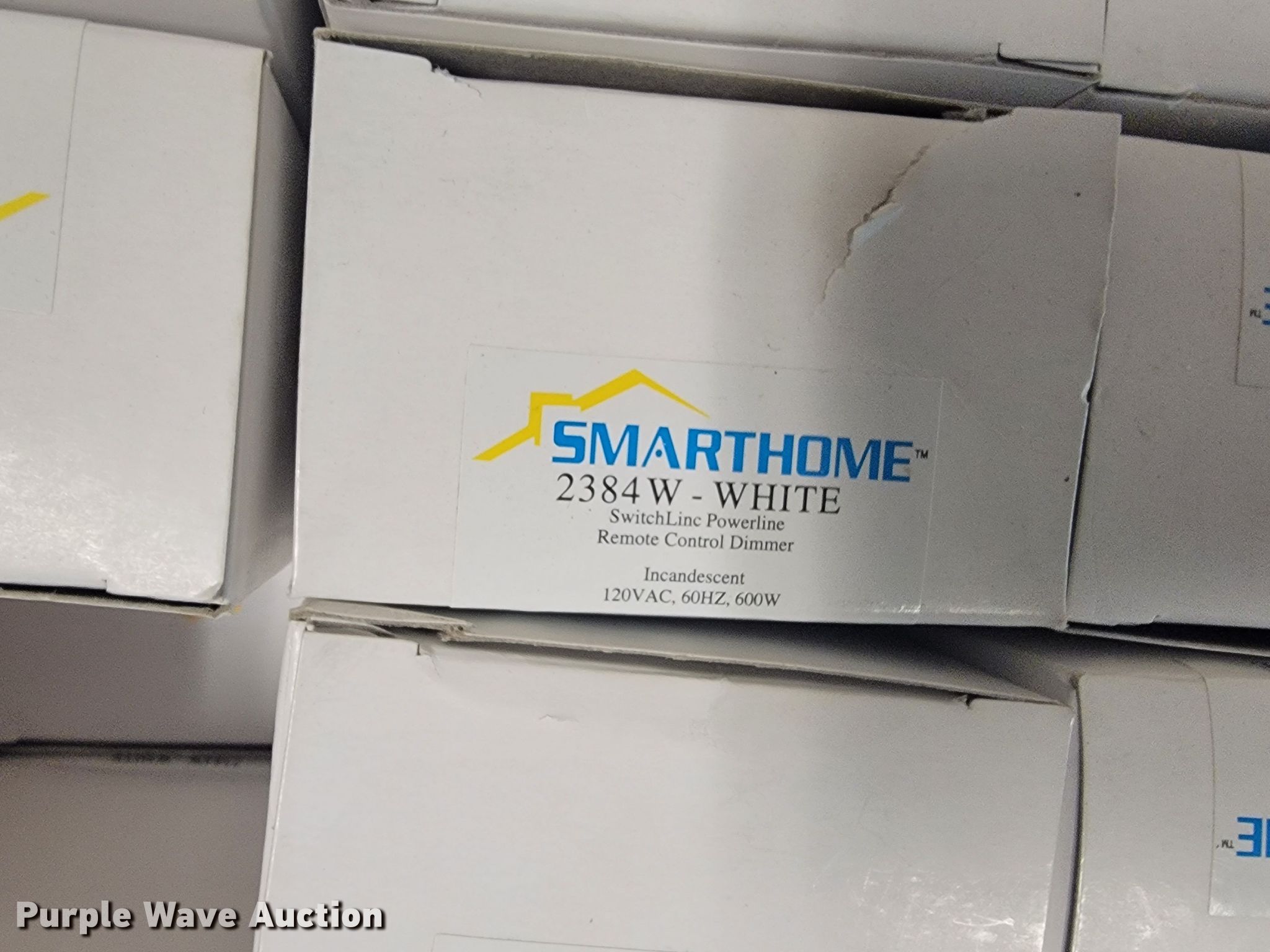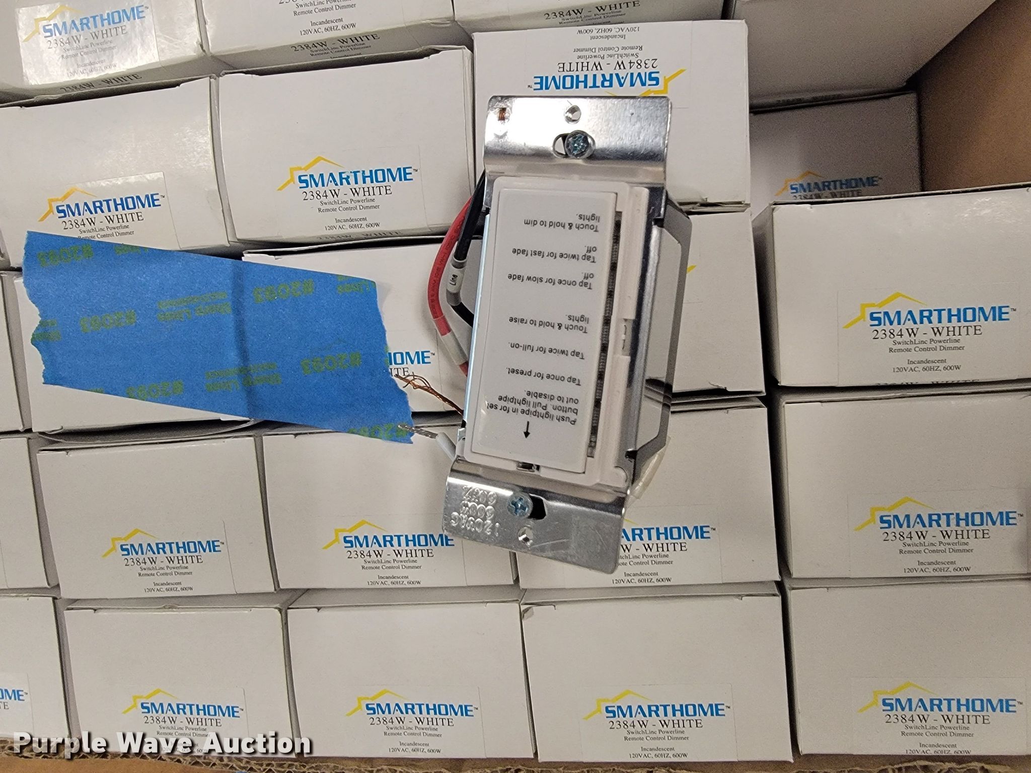 Purple Wave is selling a used Building Materials in Kansas. This item is a Building materials with the following: (2) in-ceiling speakers, Barking dog alarm, Dual band responders, Thermostat, Approx. 50 dimmer switches, Lights, Outdoor outlet timers, Security cameras and more