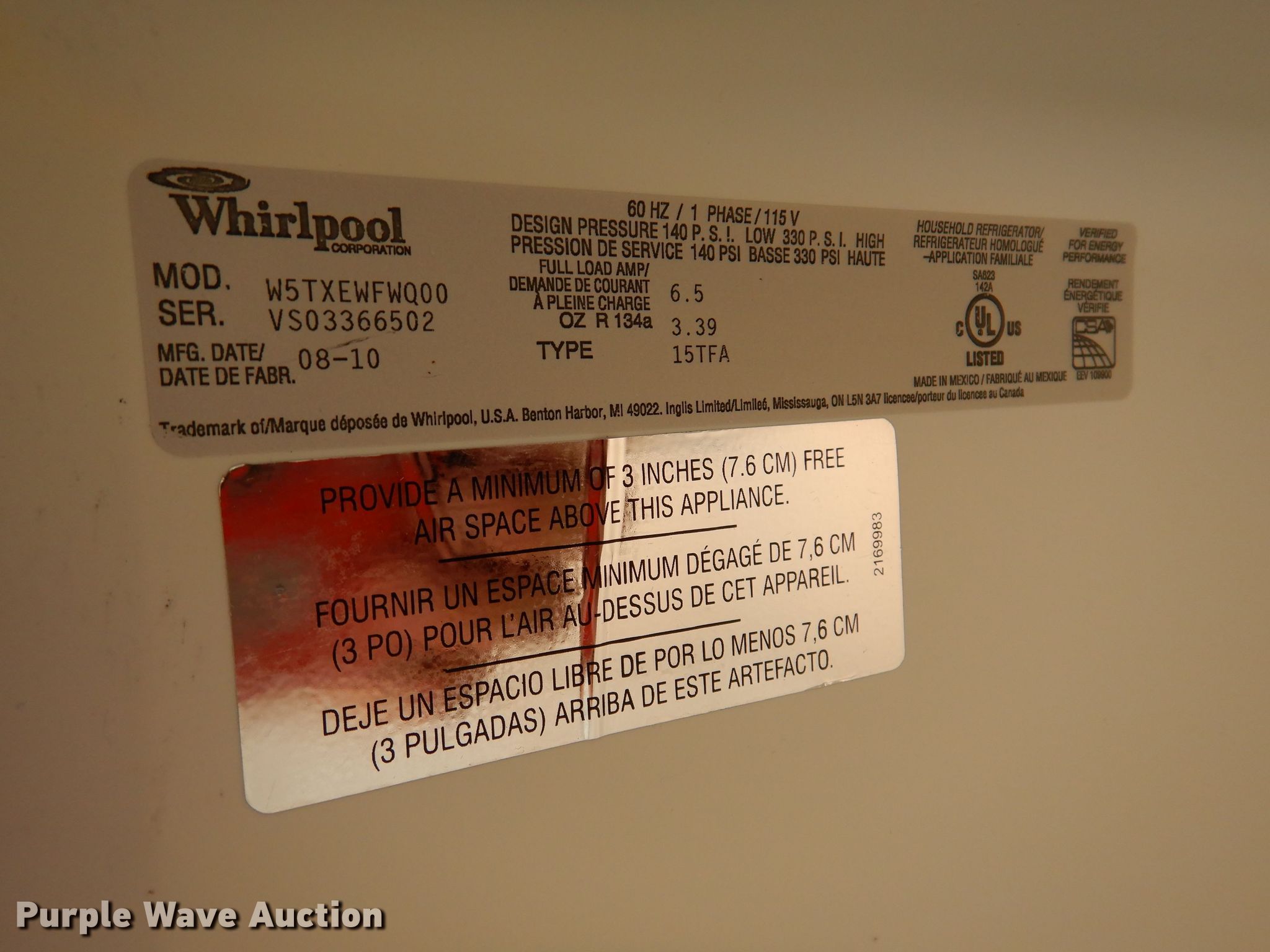 Purple Wave is selling a used Appliances in Iowa. This item is a 2010 Whirlpool refrigerator with the following: Volts: 115, Phase: Single, Serial: VS03366502