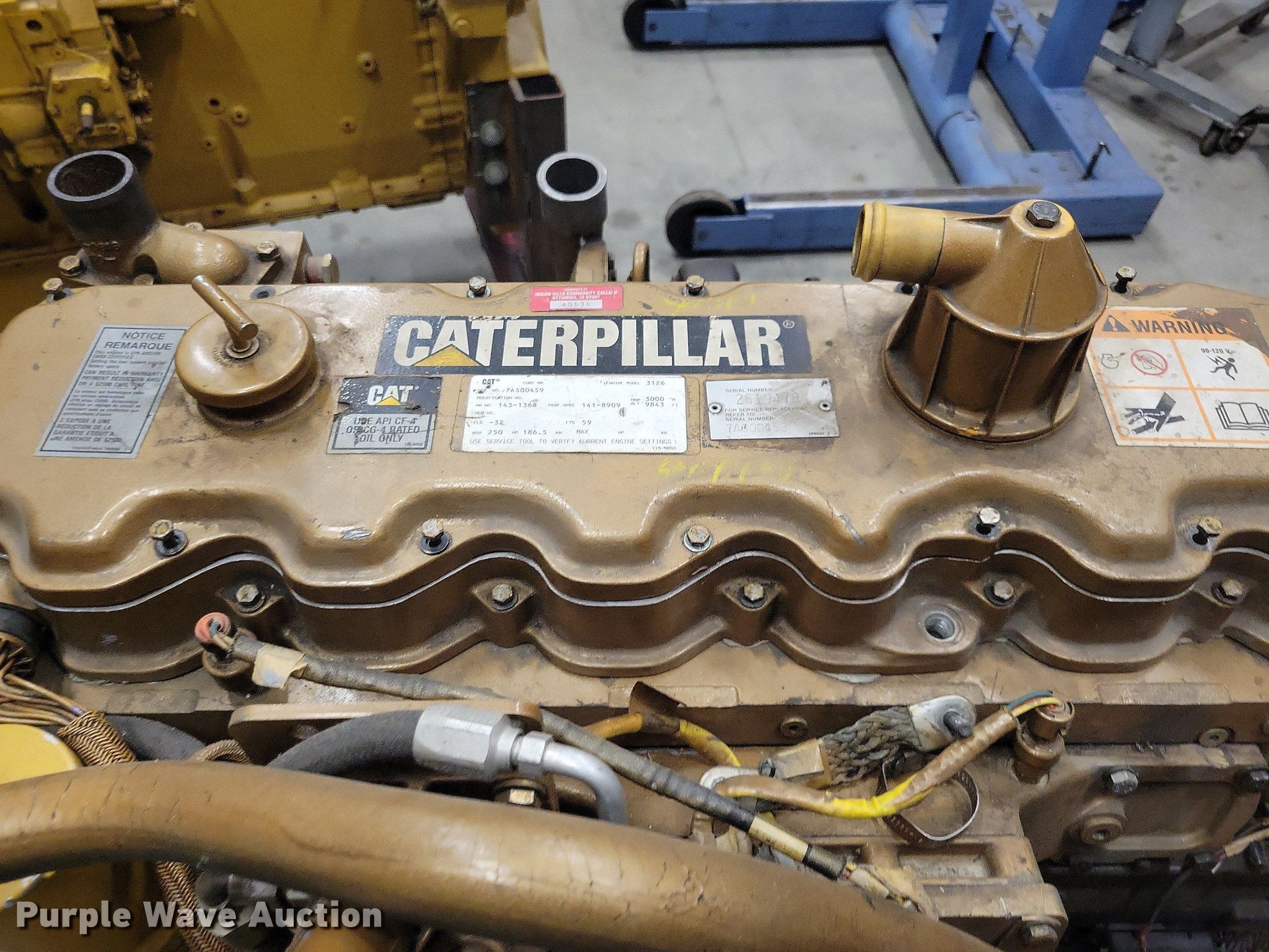 Caterpillar 3126 engine. Serial: 7AS00459, Displacement: 7.2L, Cylinders: 6, Fuel type: Diesel, HP: 250. Features Engine stand. Notes Unknown operating condition. Indian Hills Community College. 14282 College Ave. Ottumwa, IA 52501