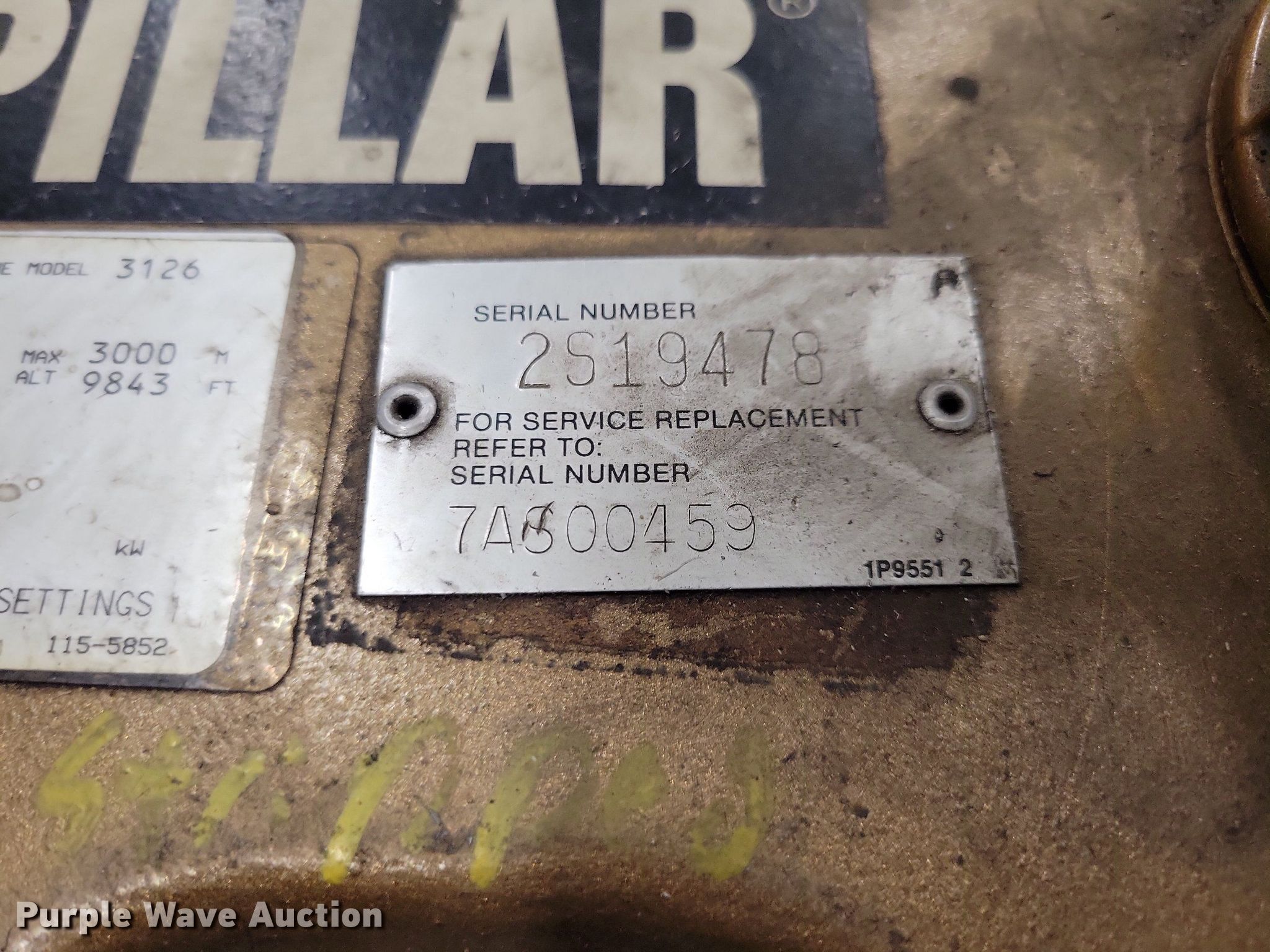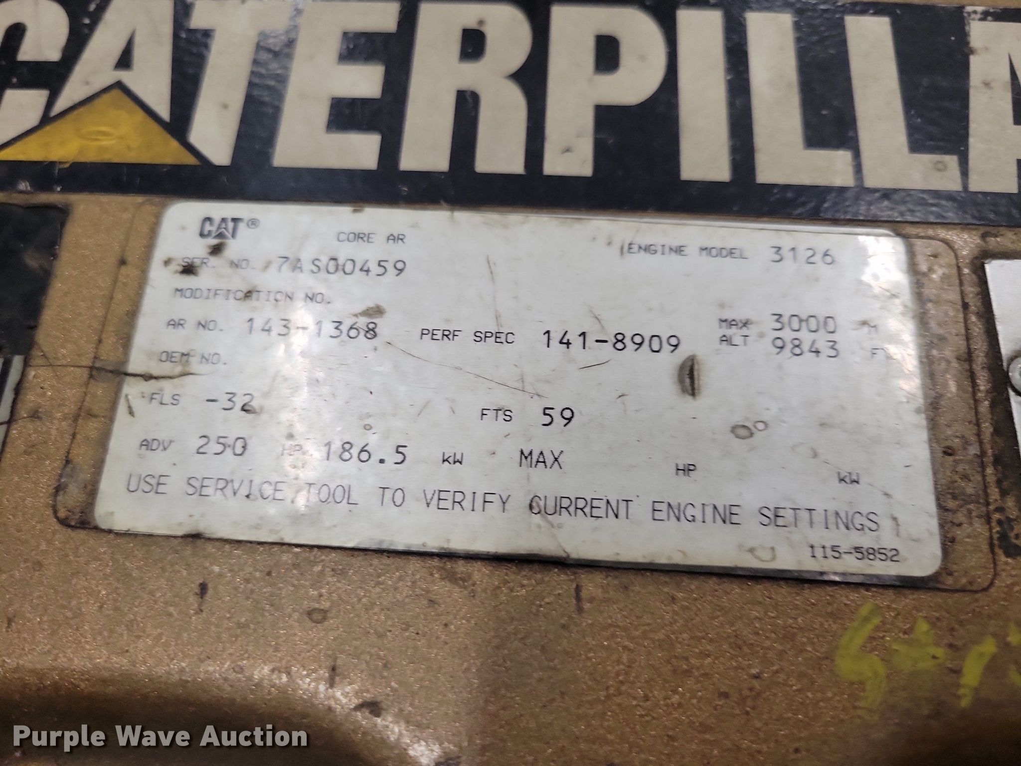 Purple Wave is selling a used Engine in Iowa. This item is a Caterpillar 3126 engine with the following: Serial: 7AS00459, Displacement: 7.2L, Cylinders: 6, Fuel type: Diesel, HP: 250
