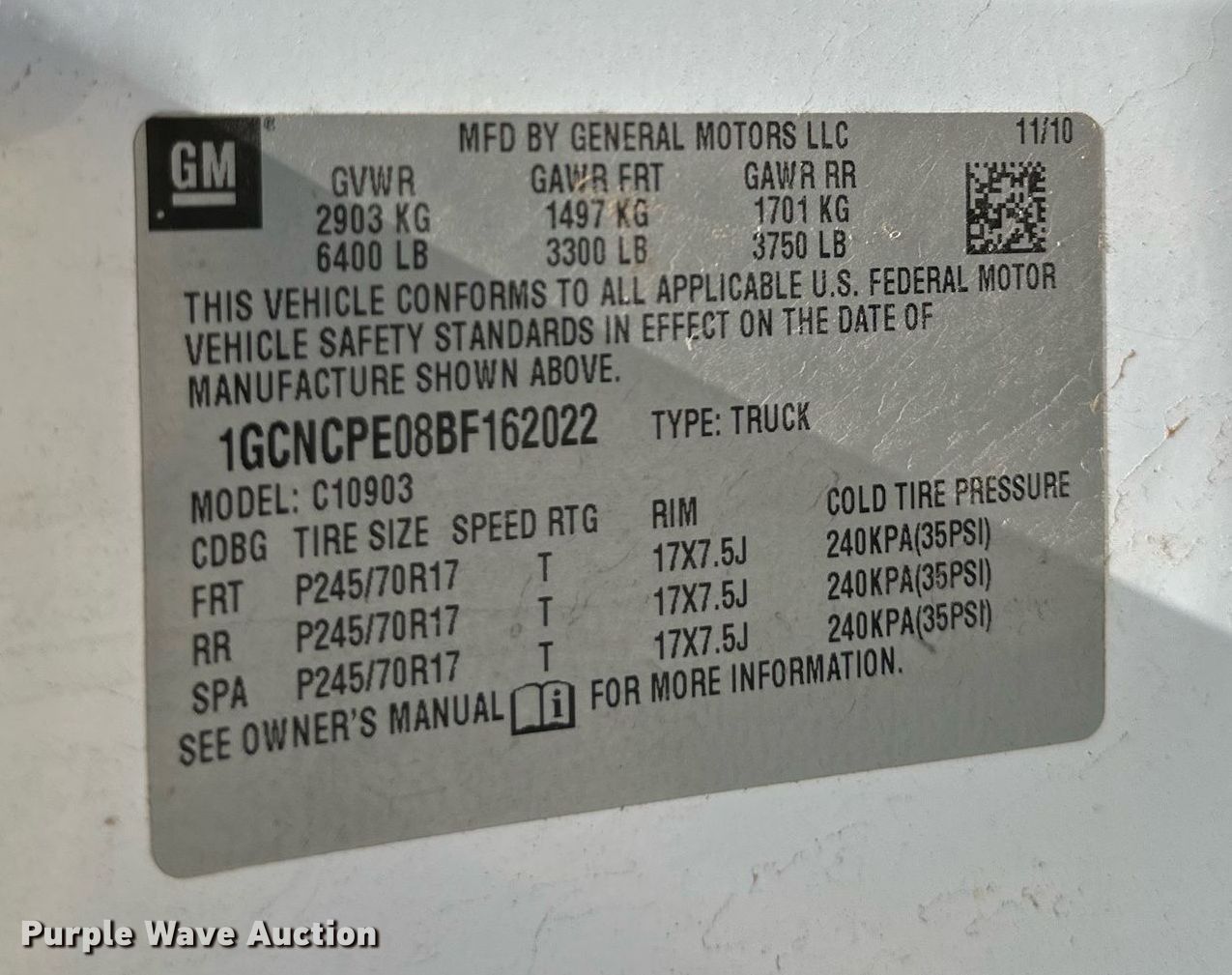 2011 Chevrolet Silverado 1500 pickup truck. Miles: 128,731 on odometer, VIN: 1GCNCPE08BF162022. Engine Displacement: 5.3L V8 OHV, Cylinders: 8, Fuel type: Gas. Transmission Automatic. Interior AC, Heat, Power windows, Power locks, Cruise control. Tires Size: 245/70R17. Notes Dash warning indicator: TPMS, Traction control. Texas title. Title distribution may be delayed up to 14 days from verification of funds. Hockley County, TX. 2320 U.S. 385. Levelland, TX 79336