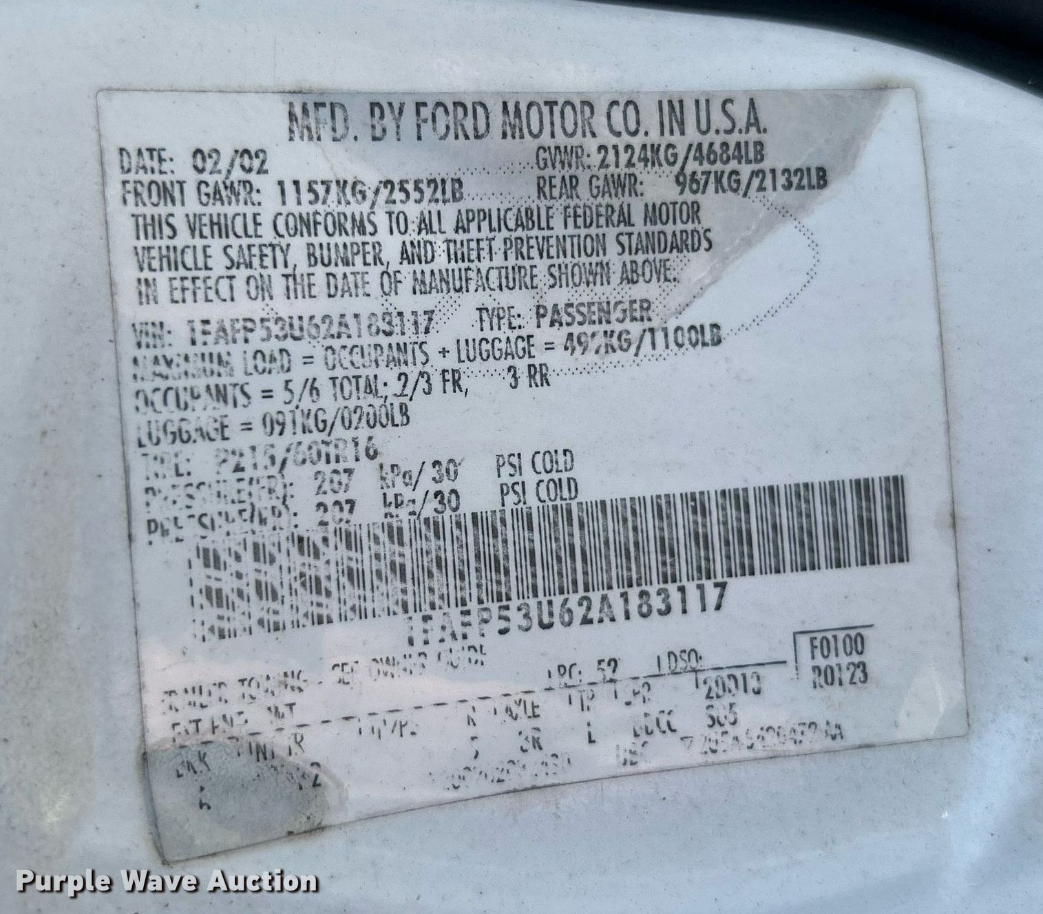 • VIN: 1FAFP53U62A183117