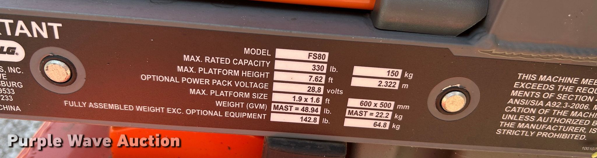 Purple Wave is selling a used Scissor or Vertical Lift in Oklahoma. This item is a JLG FS80 Liftpod vertical lift with the following: Unit #: 224