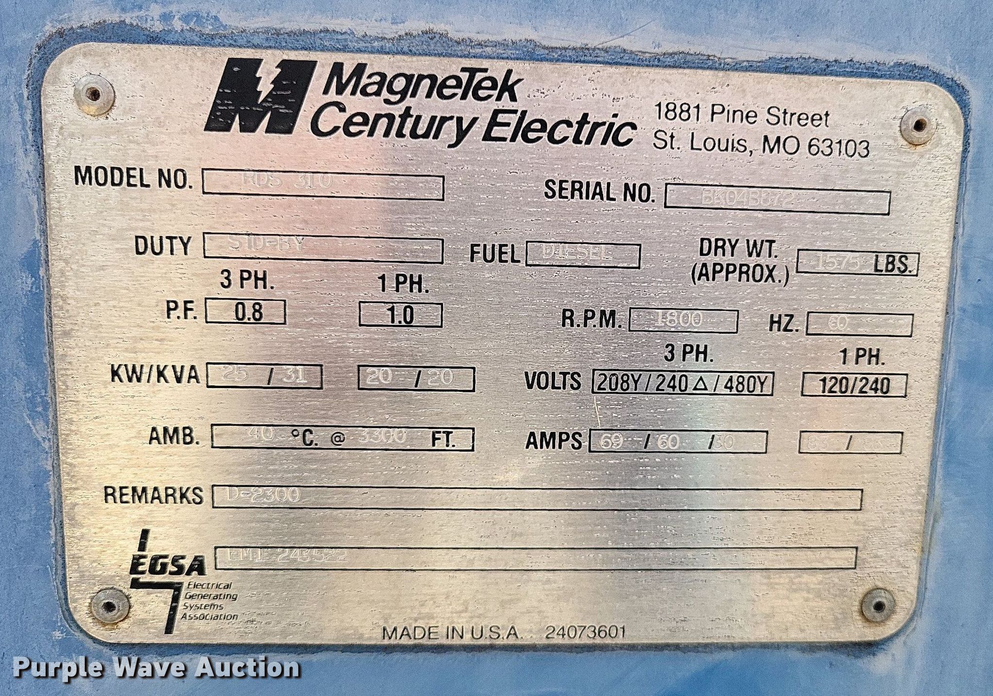 Purple Wave is selling a used Generator Set in Missouri. This item is a Genesys RDS310 generator with the following: Hours: 158 on meter, Serial: BK04B872