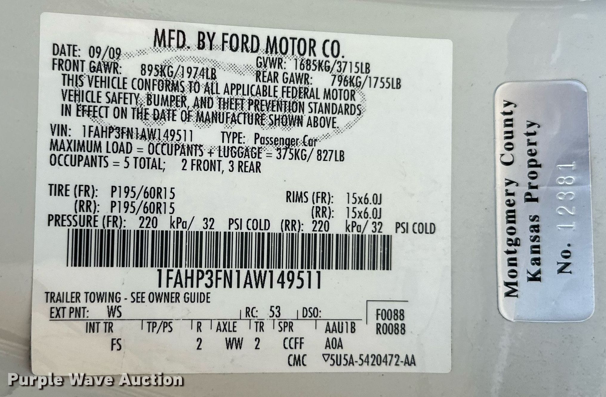 2010 Ford Focus SE. Miles: 73,588 on odometer, VIN: 1FAHP3FN1AW149511. Engine Displacement: 2.0L L4 DOHC, Cylinders: 4, Fuel type: Gas. Transmission Automatic. Interior AC, Heat, Heated mirrors, Power windows, Power locks, Cruise control. Tires Size: 215/45R17. Notes Dash warning indicator: TPMS. Kansas title. Title distribution may be delayed up to 14 days from verification of funds. Montgomery County Sheriff Department. Independence, KS 67301
