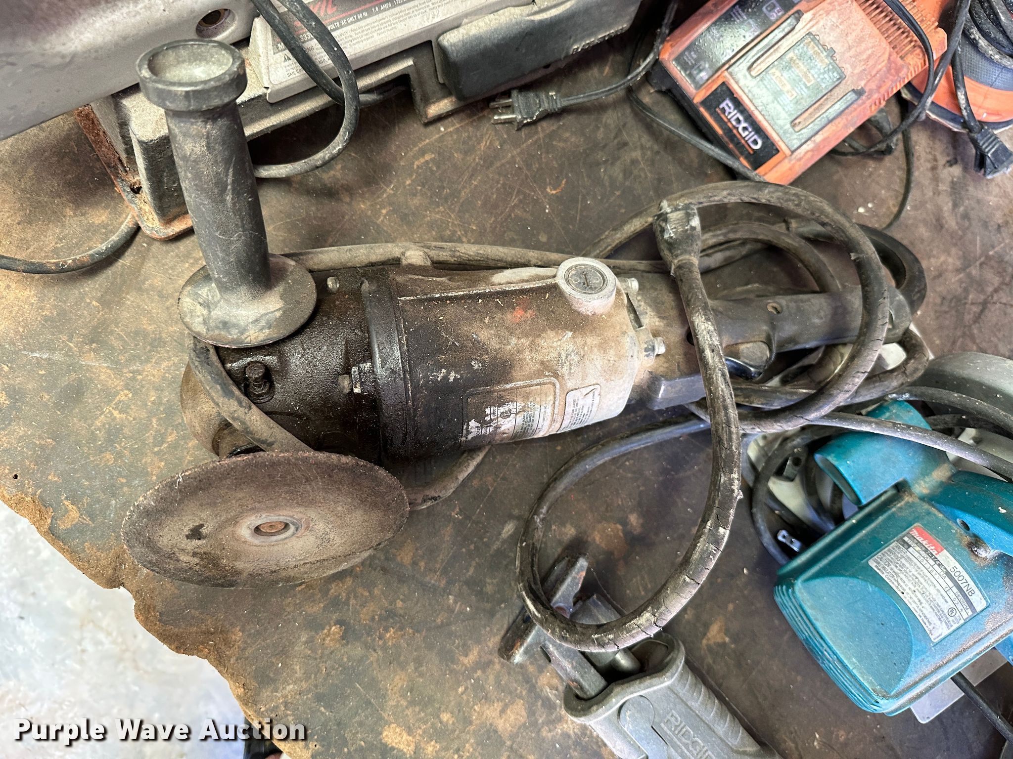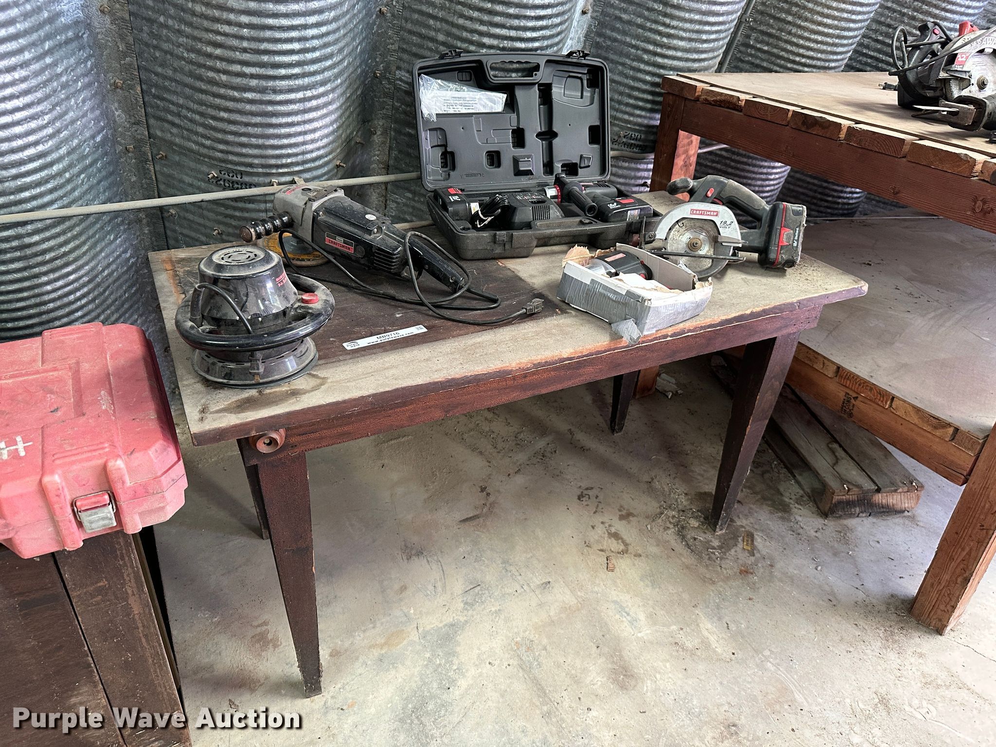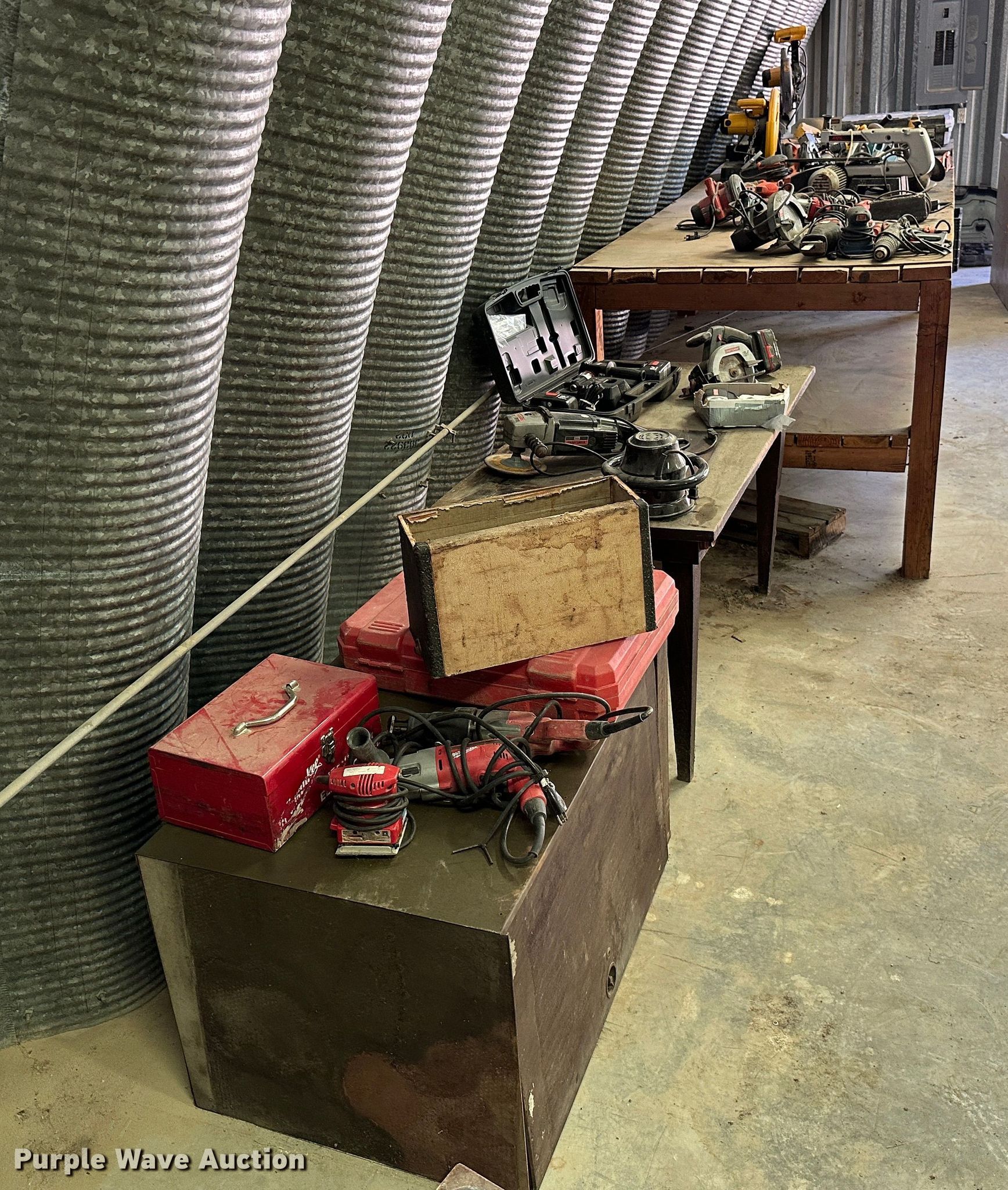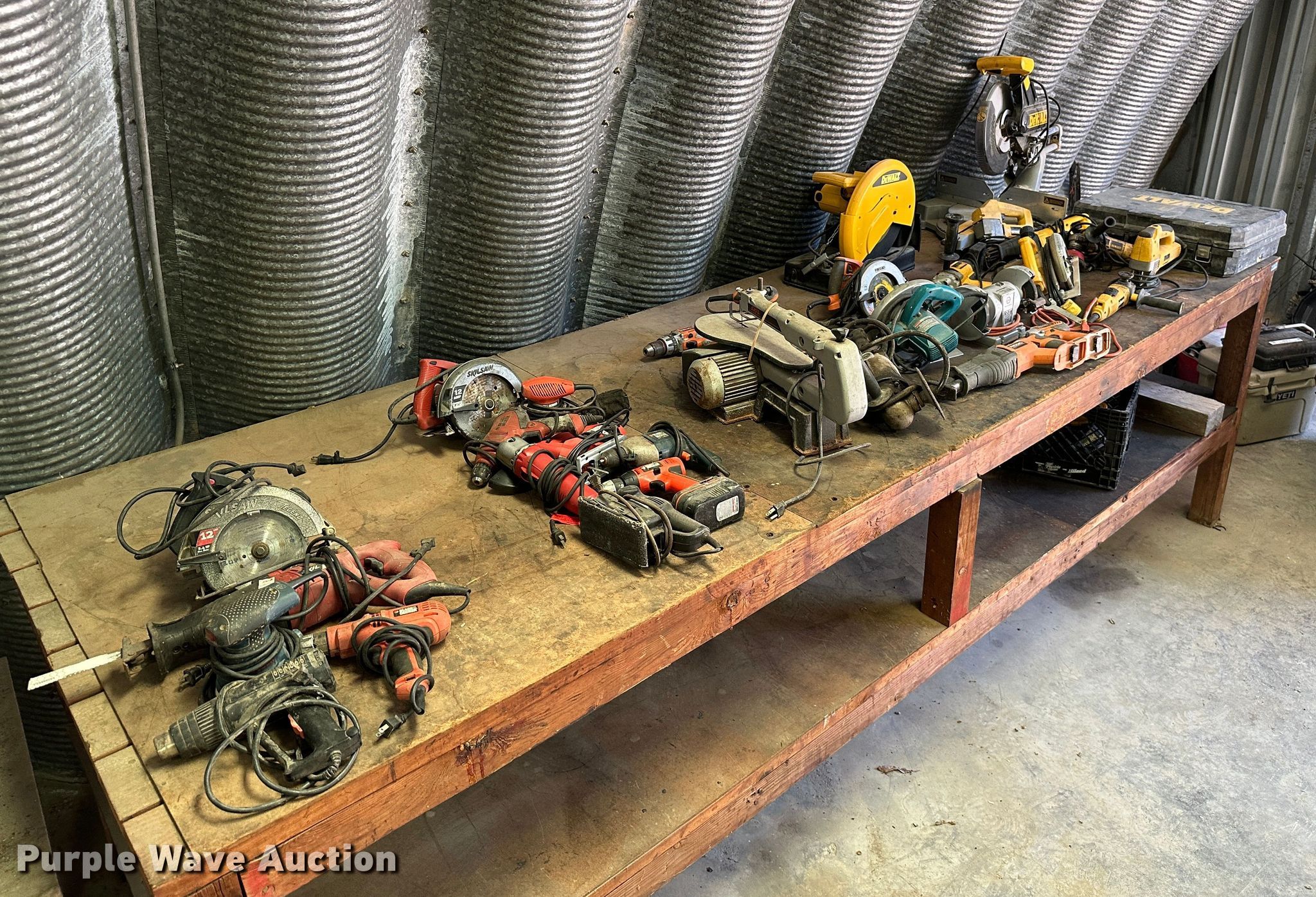 Purple Wave is selling a used Tools in Kansas. This item is a Tools with the following: Milwaukee Sawzall, Milwaukee hammer drill, (2) Milwaukee electric sander, Milwaukee drill, Craftsmen 9 in buffer, Craftsman grinder, Craftsman drill, Craftsman 19.2V saw, Craftsman impact drill, (3) Black and Decker electric drill, Skilsaw reciprocating saw, (2) Skilsaw circular saw, (2) Black and Decker electric sander, Black and Decker impact drill, Black and Decker grinder, Black and Decker 5" bench grinder, (2) Ridgid impact drill, (2) Ridgid electric sander, Makita circular saw, Ridgid reciprocating saw, (2) Dewalt circular saw, Dewalt electric drill, (2) Dewalt grinder, Dewalt miter saw, Dewalt reciprocating saw, Dewalt electric sander, Dewalt hammer drill, Batteries, Chargers, Table, Workbench not included