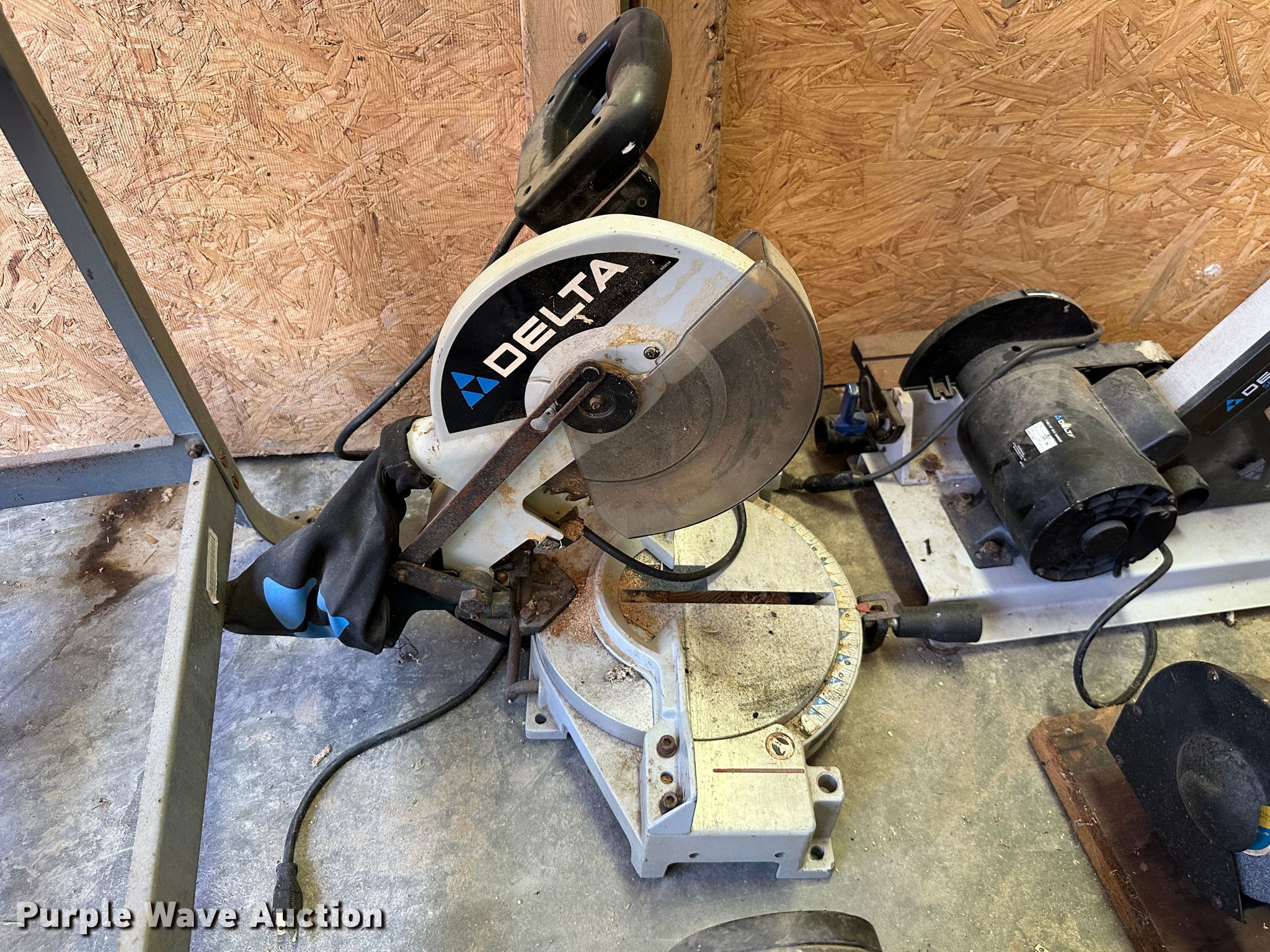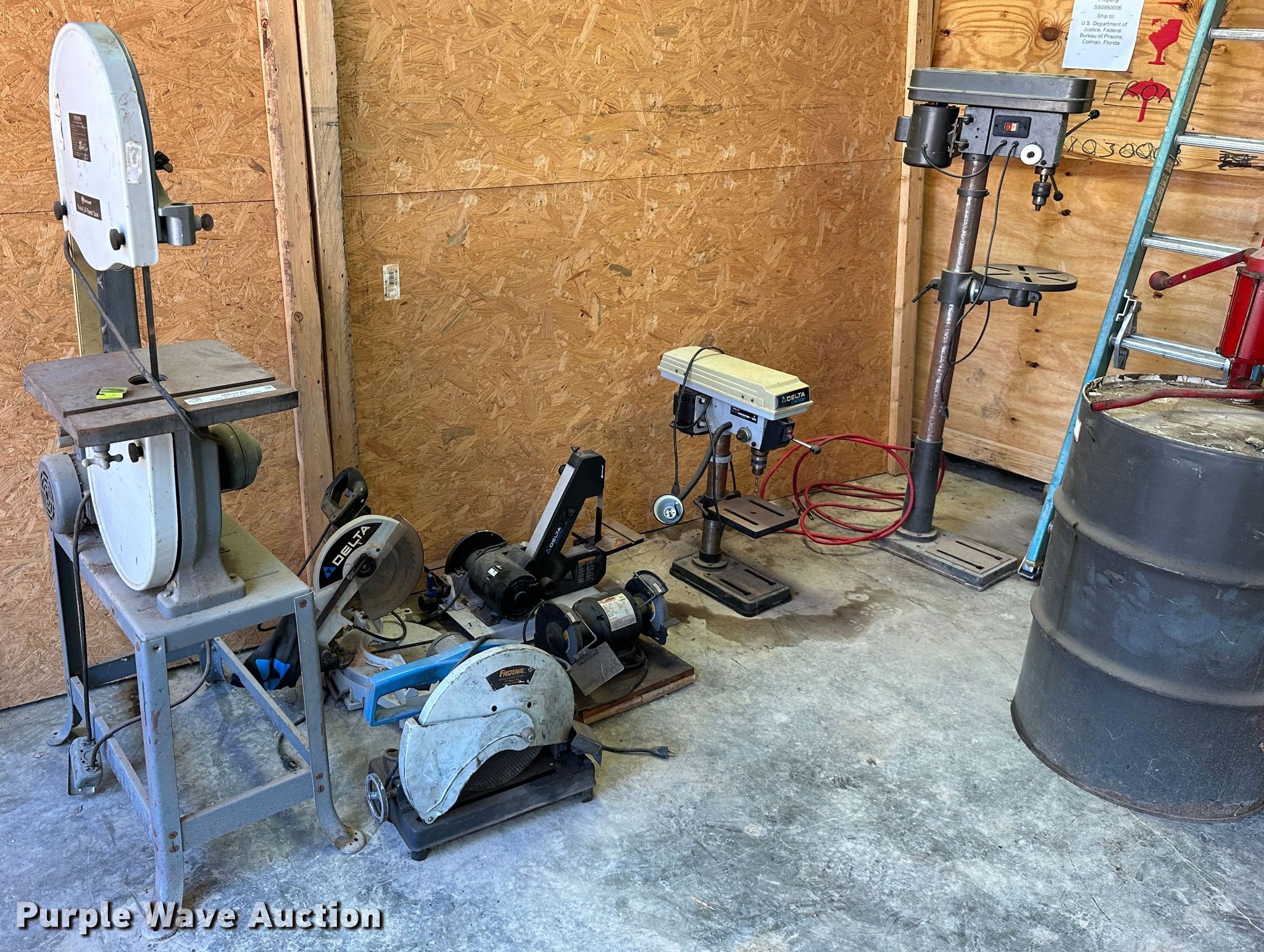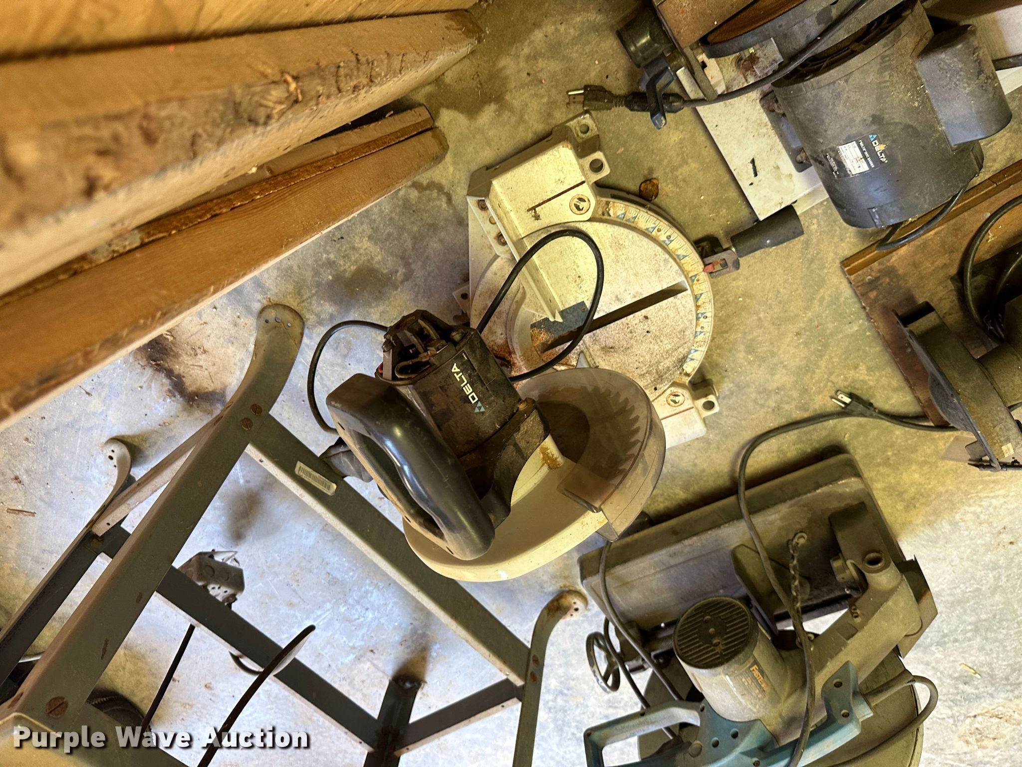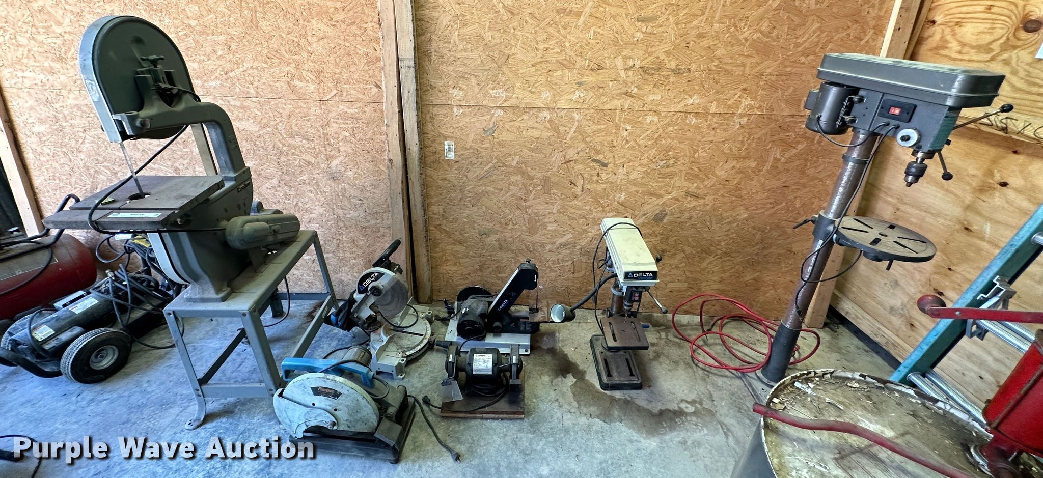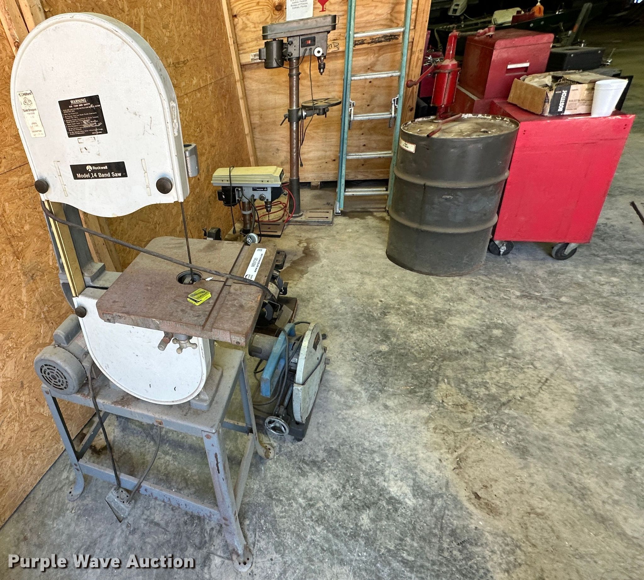 Purple Wave is selling a used Tools in Kansas. This item is a Tools with the following: Rockwell 14 band saw, Delta miter saw, Fastenal miter saw, Benchtop 6" bench grinder, Delta sander, Delta Shopmaster 10" drill press, Homier 16 speed drill press