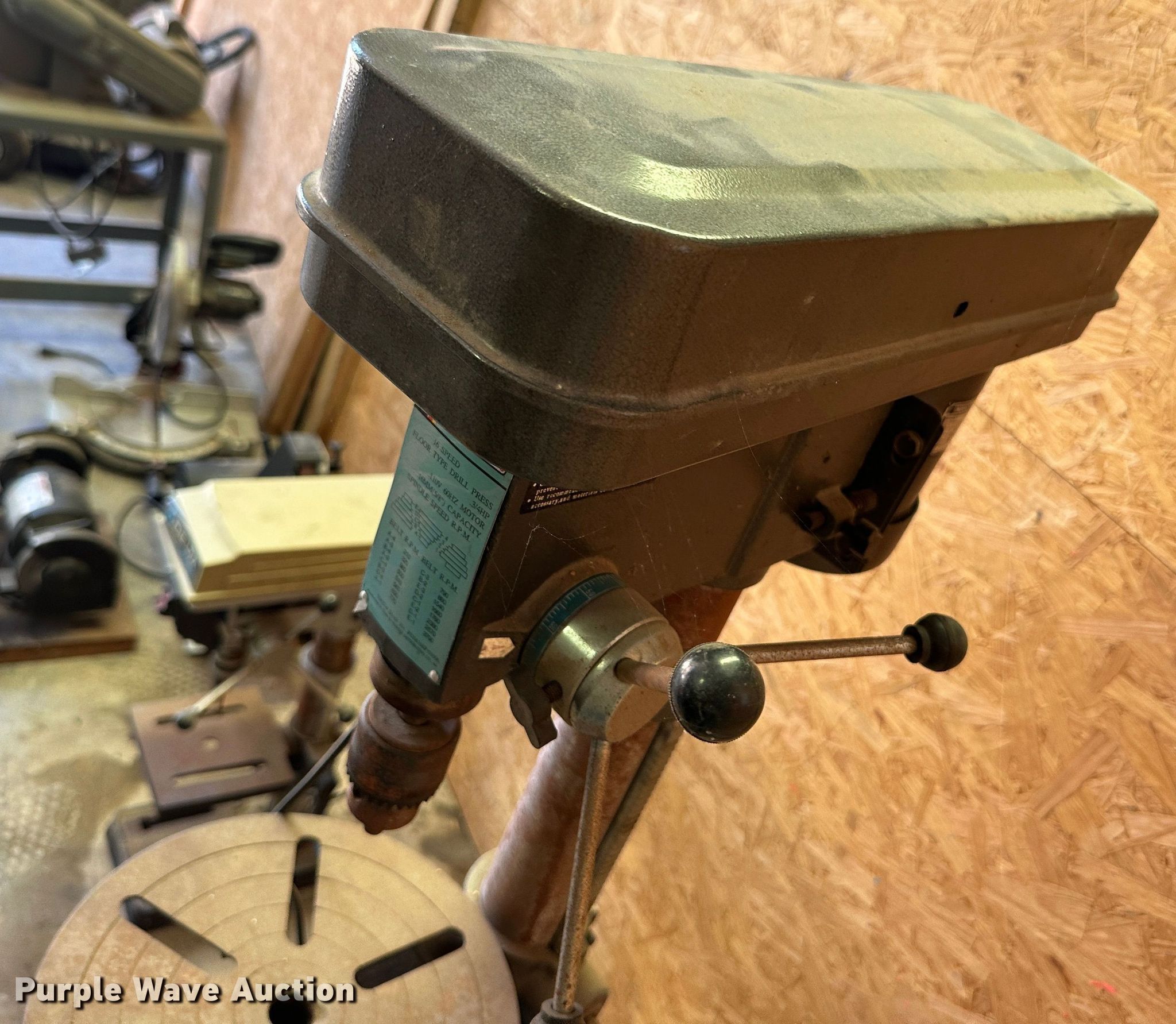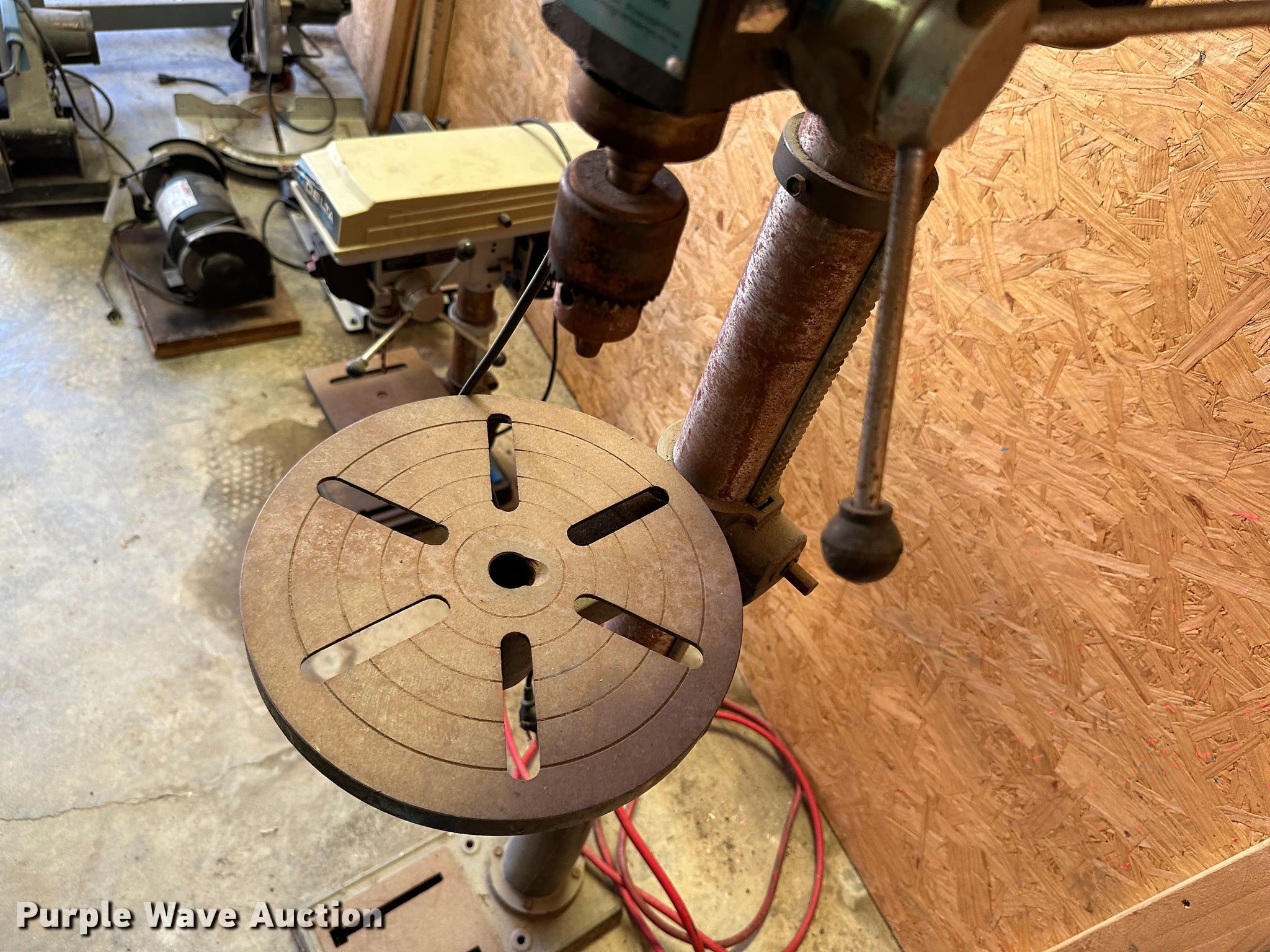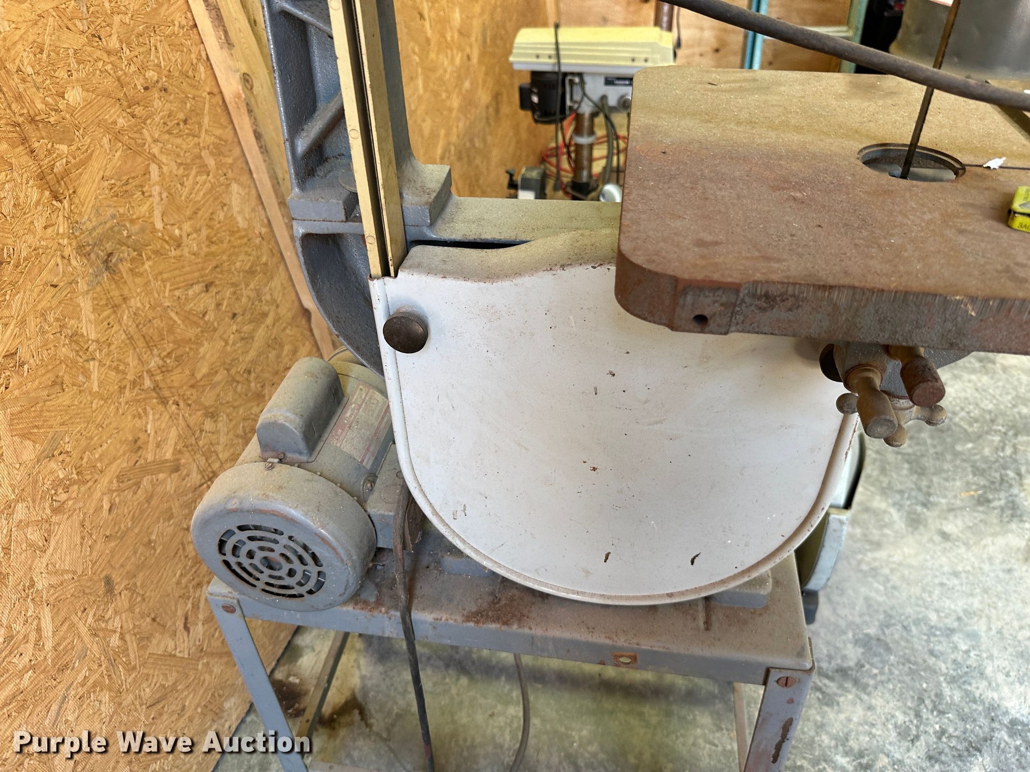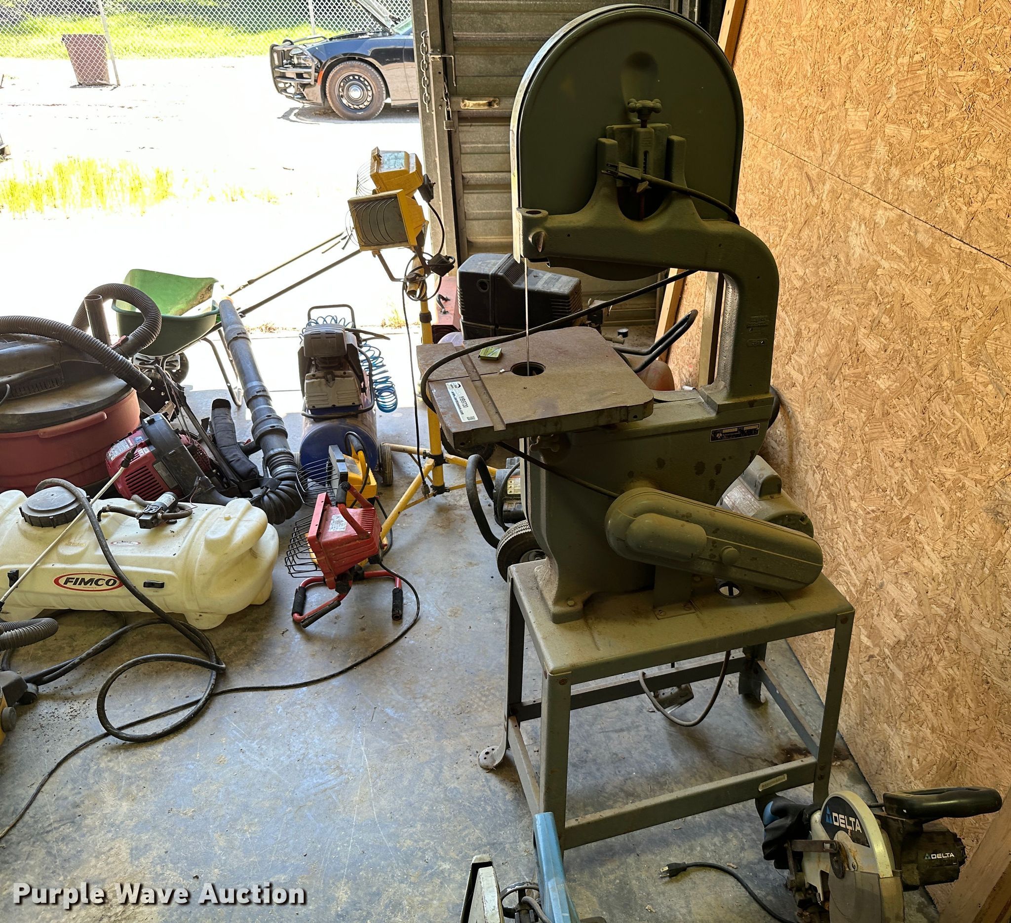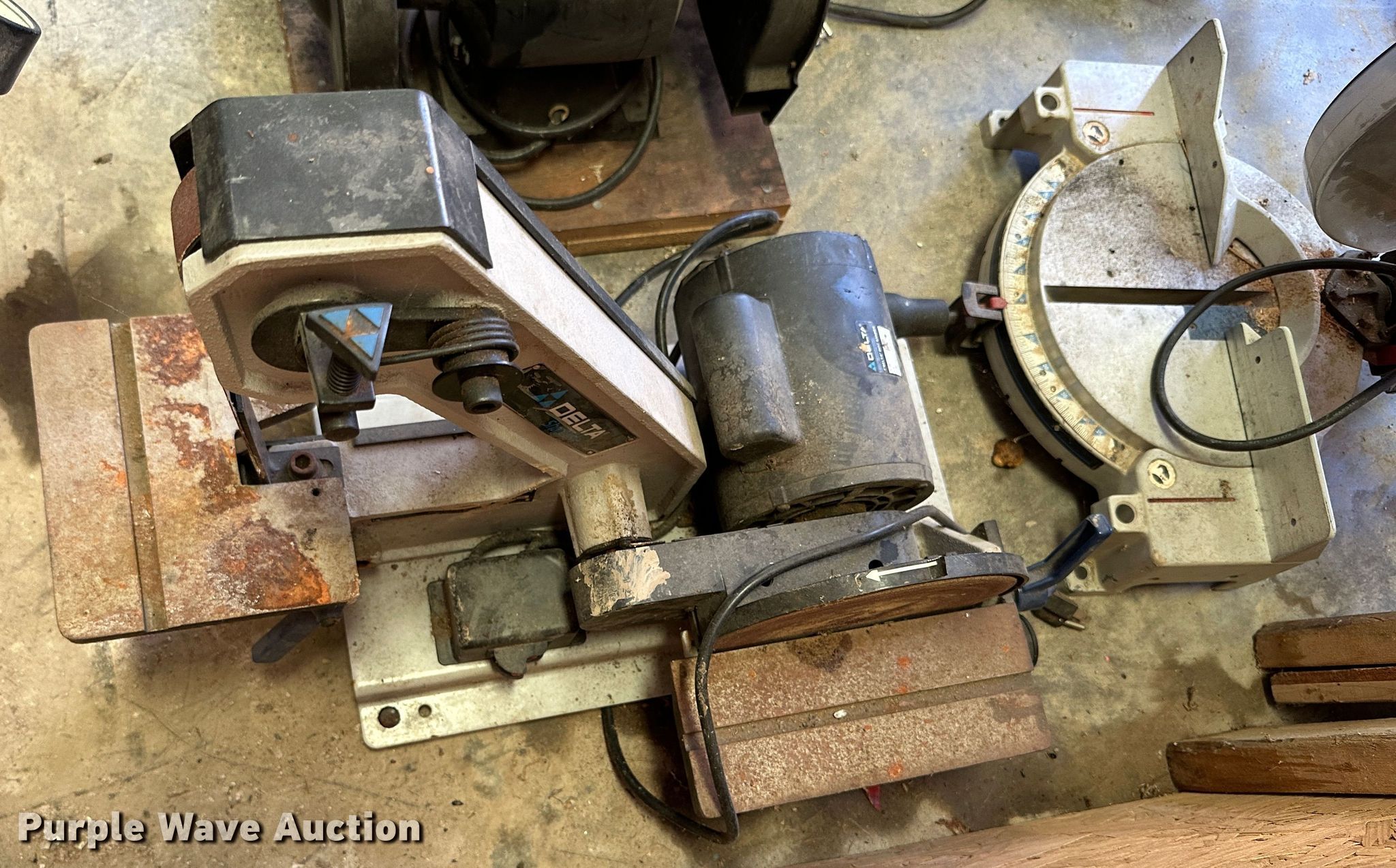 Purple Wave is selling a used Tools in Kansas. This item is a Tools with the following: Rockwell 14 band saw, Delta miter saw, Fastenal miter saw, Benchtop 6" bench grinder, Delta sander, Delta Shopmaster 10" drill press, Homier 16 speed drill press