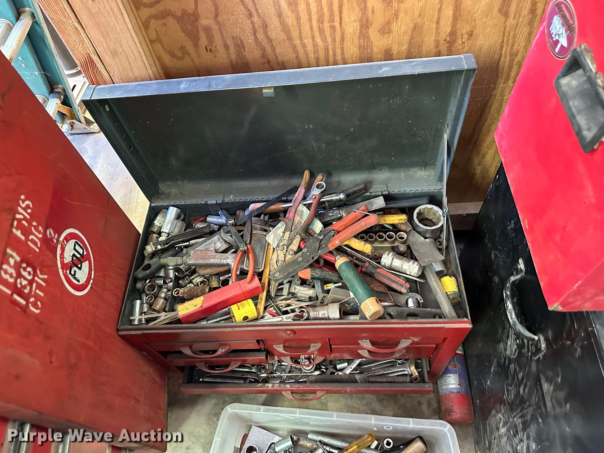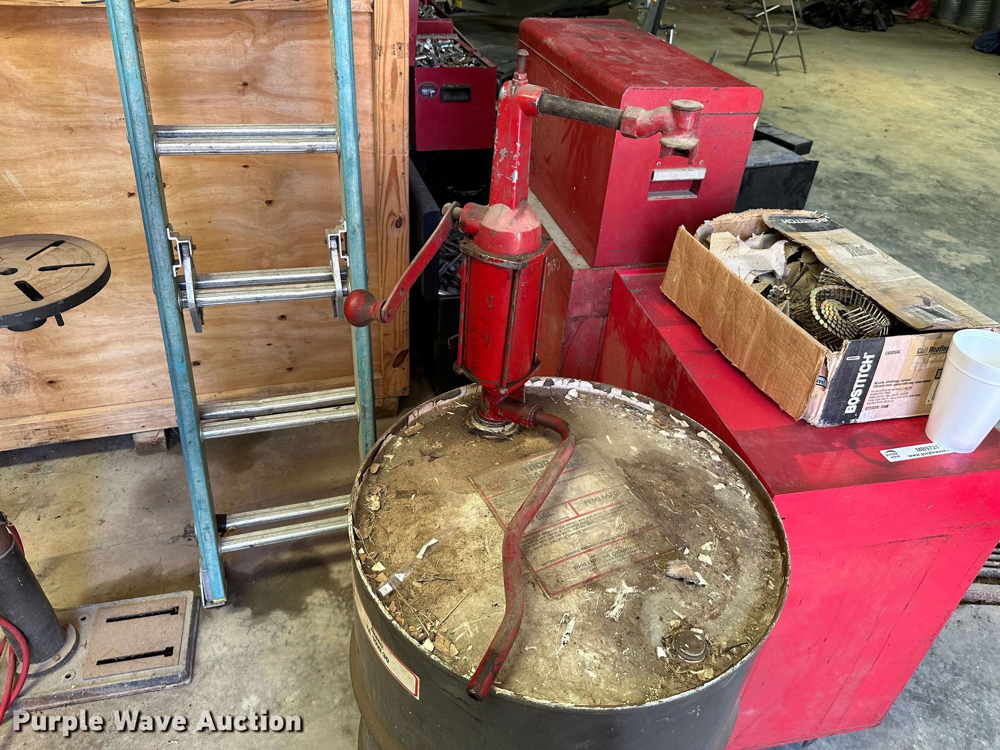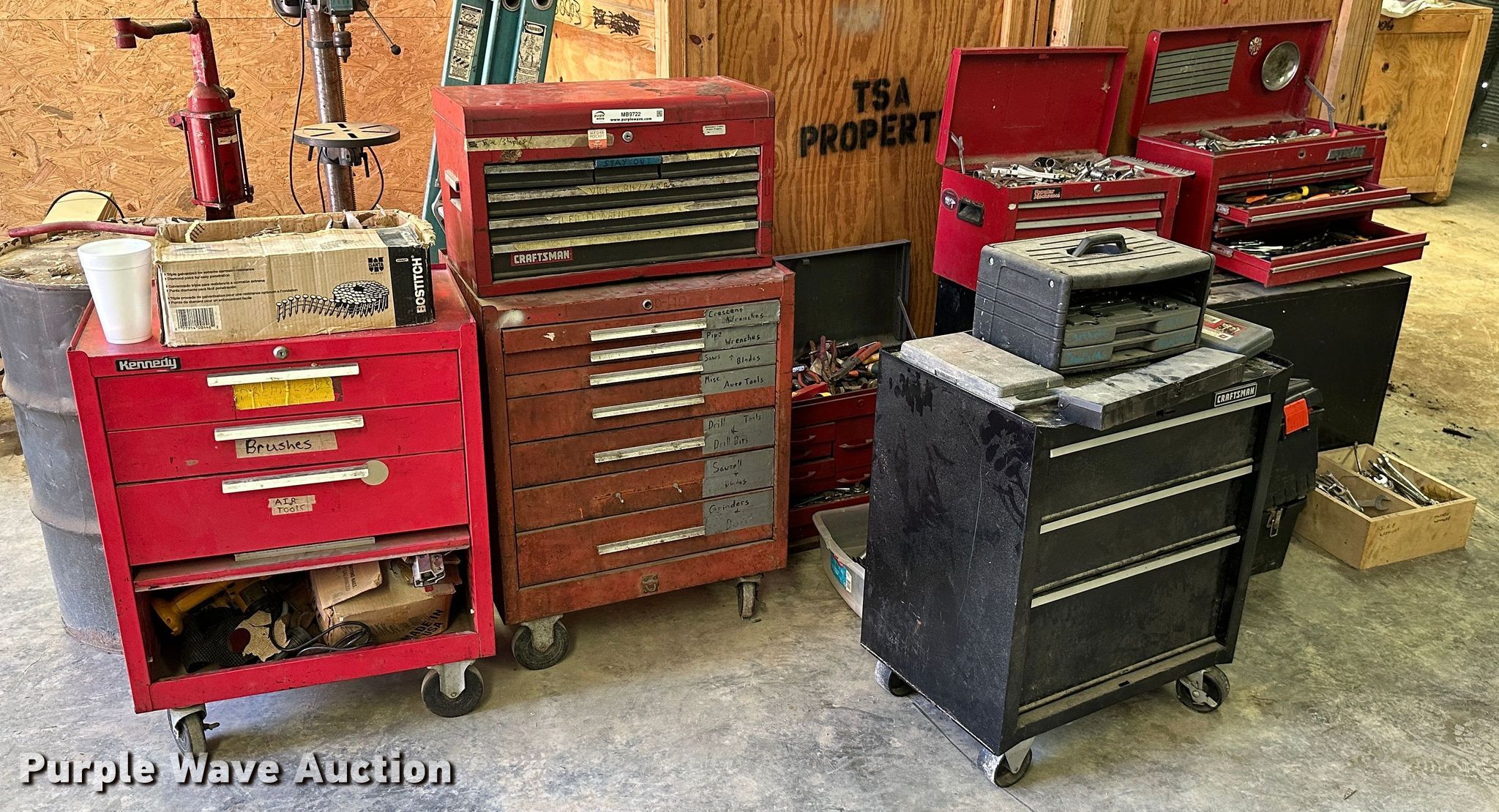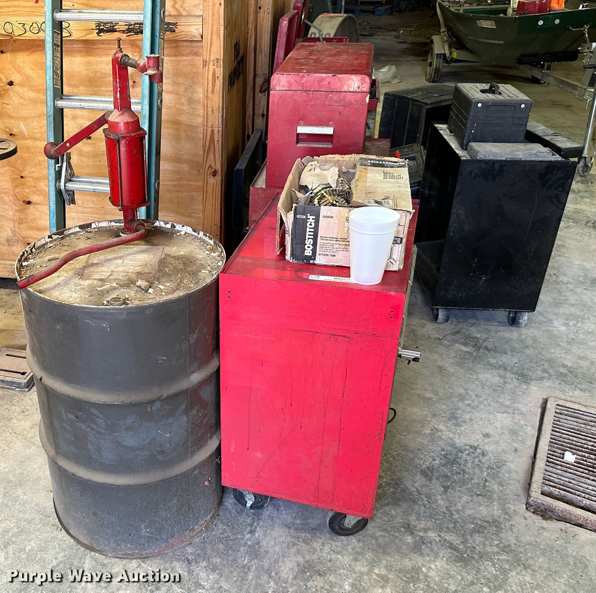 Purple Wave is selling a used Tools in Kansas. This item is a (9) toolboxes with the following: Tools, 55 gallon drum with pump