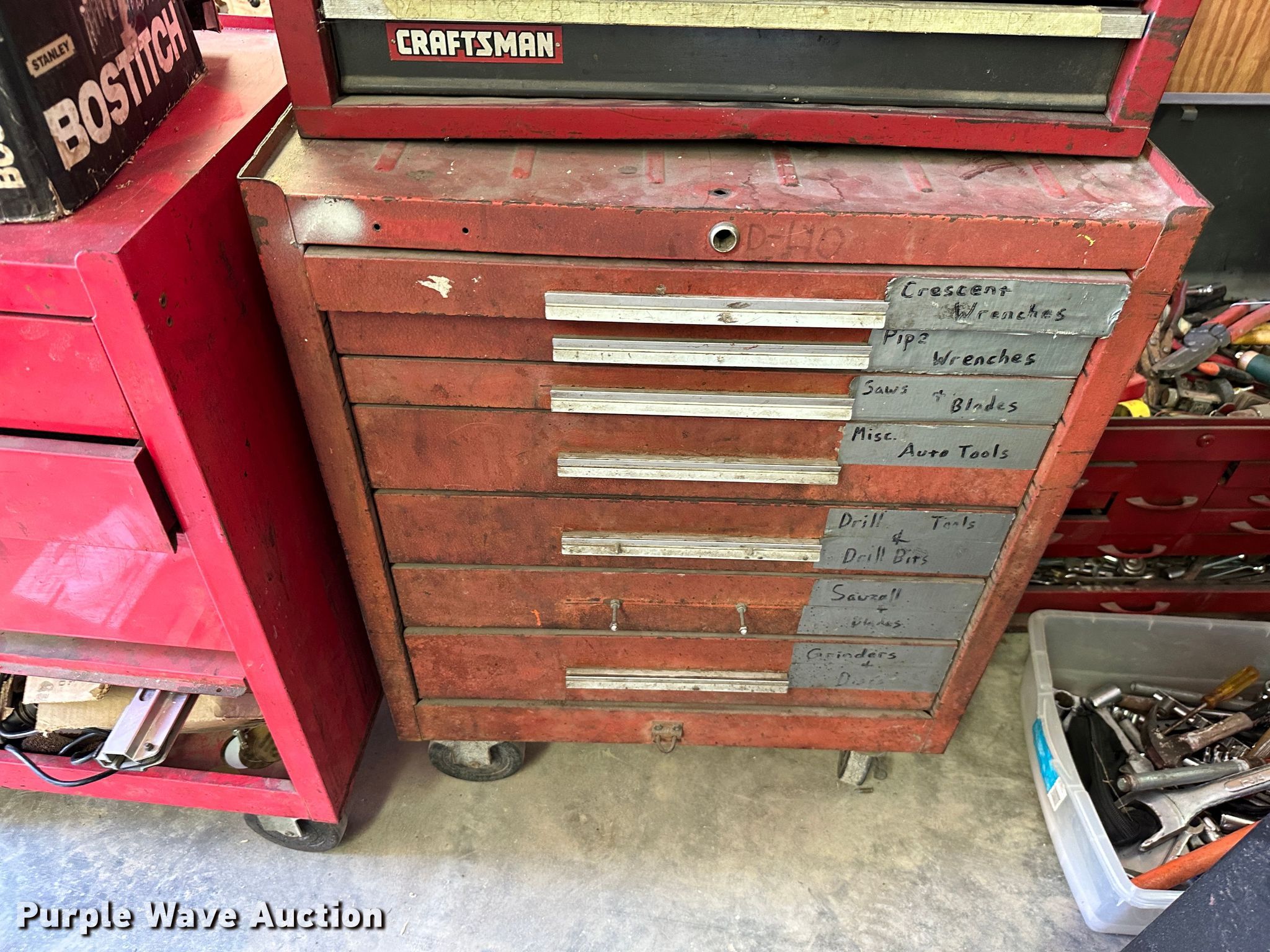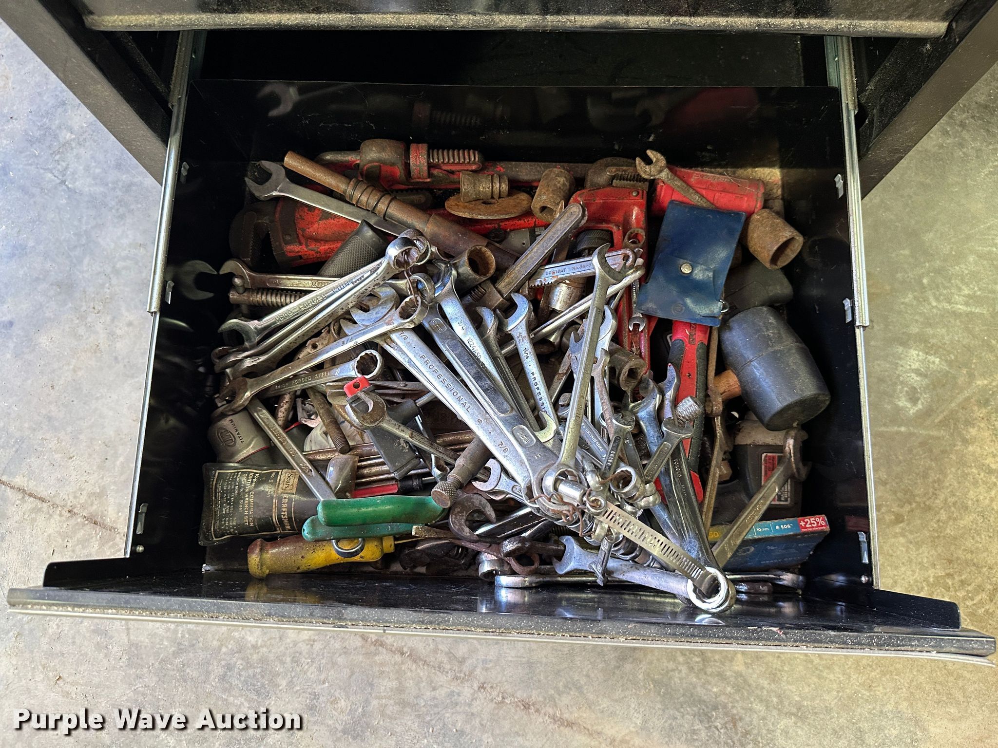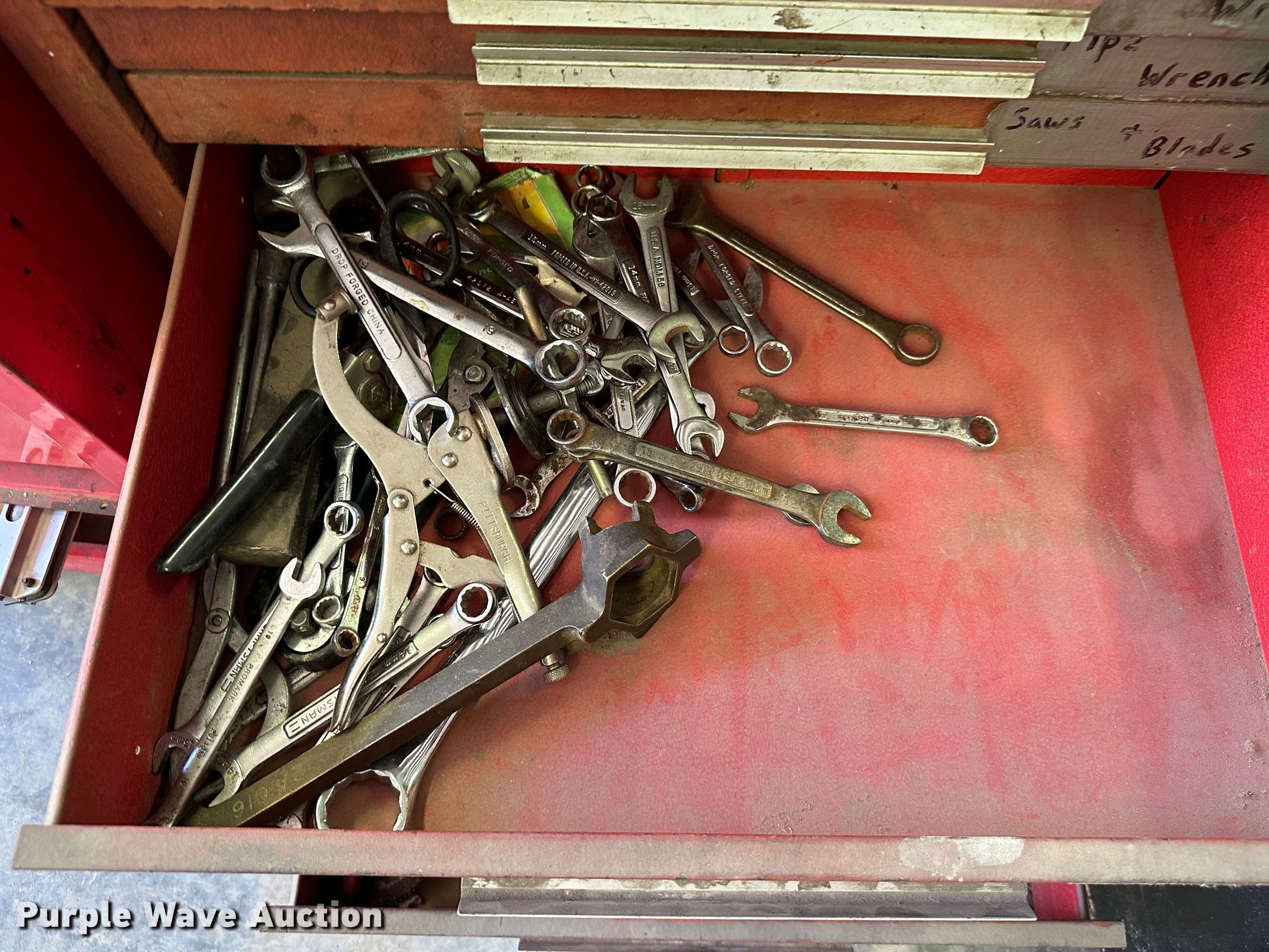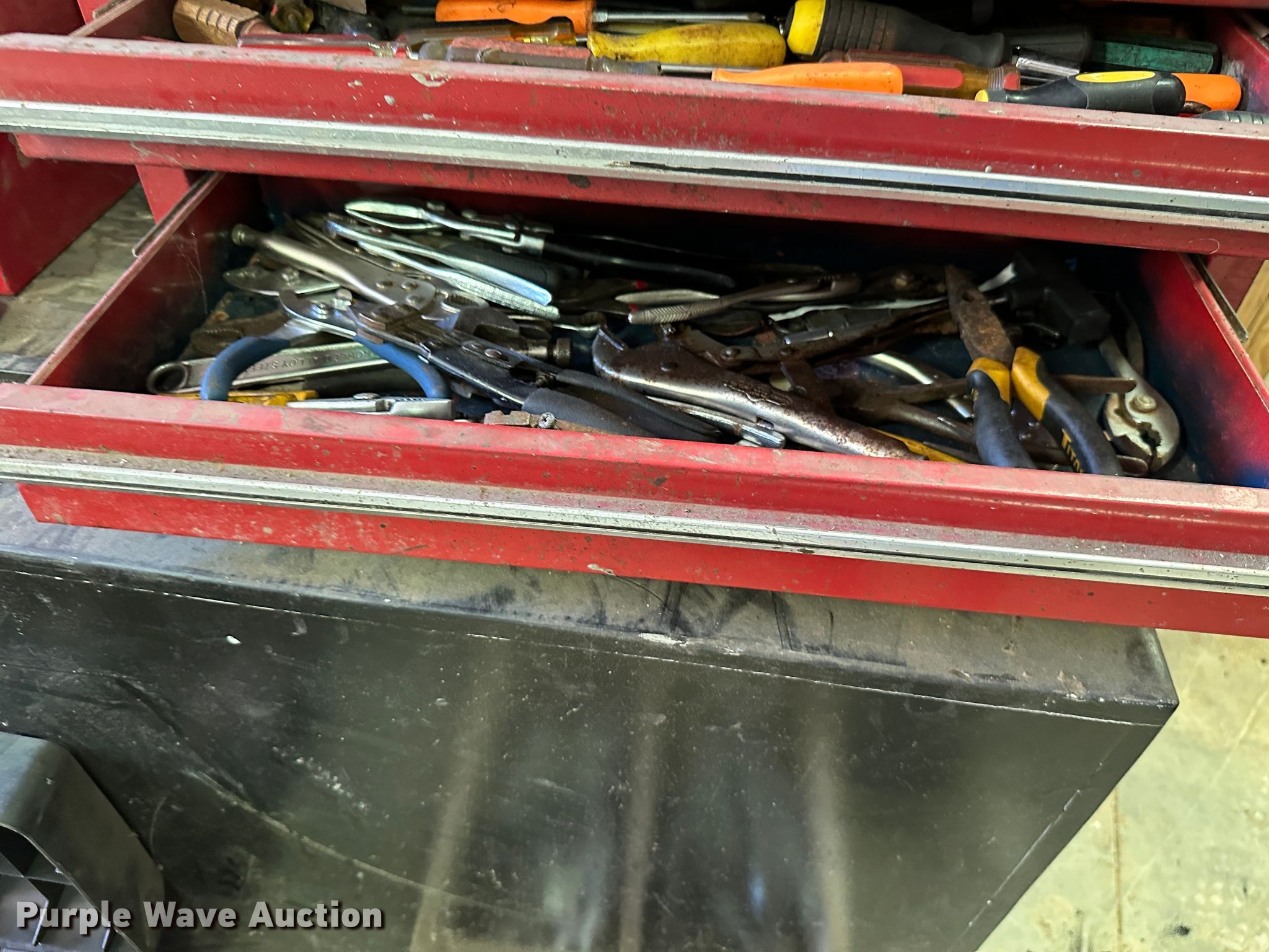 Purple Wave is selling a used Tools in Kansas. This item is a (9) toolboxes with the following: Tools, 55 gallon drum with pump