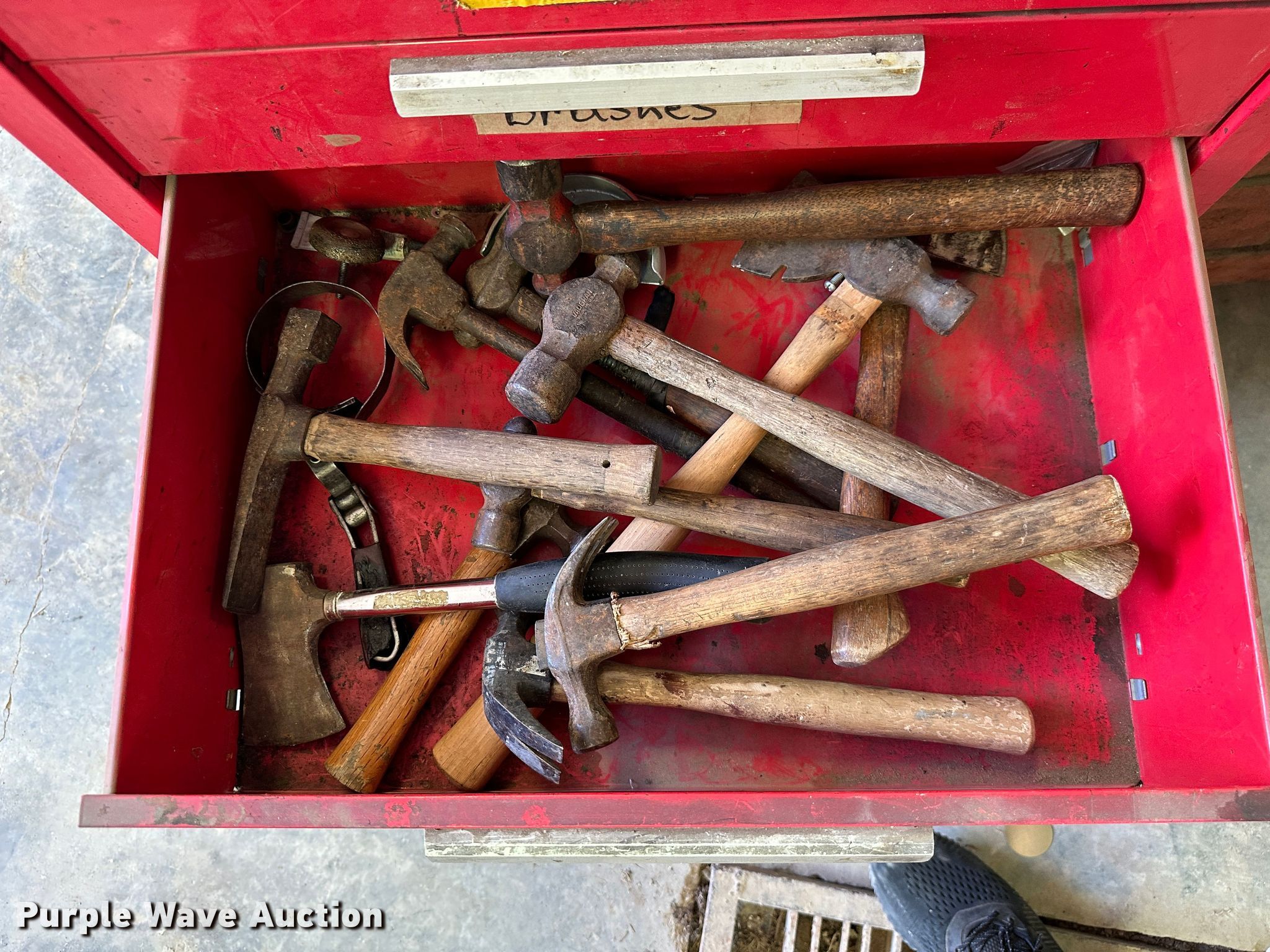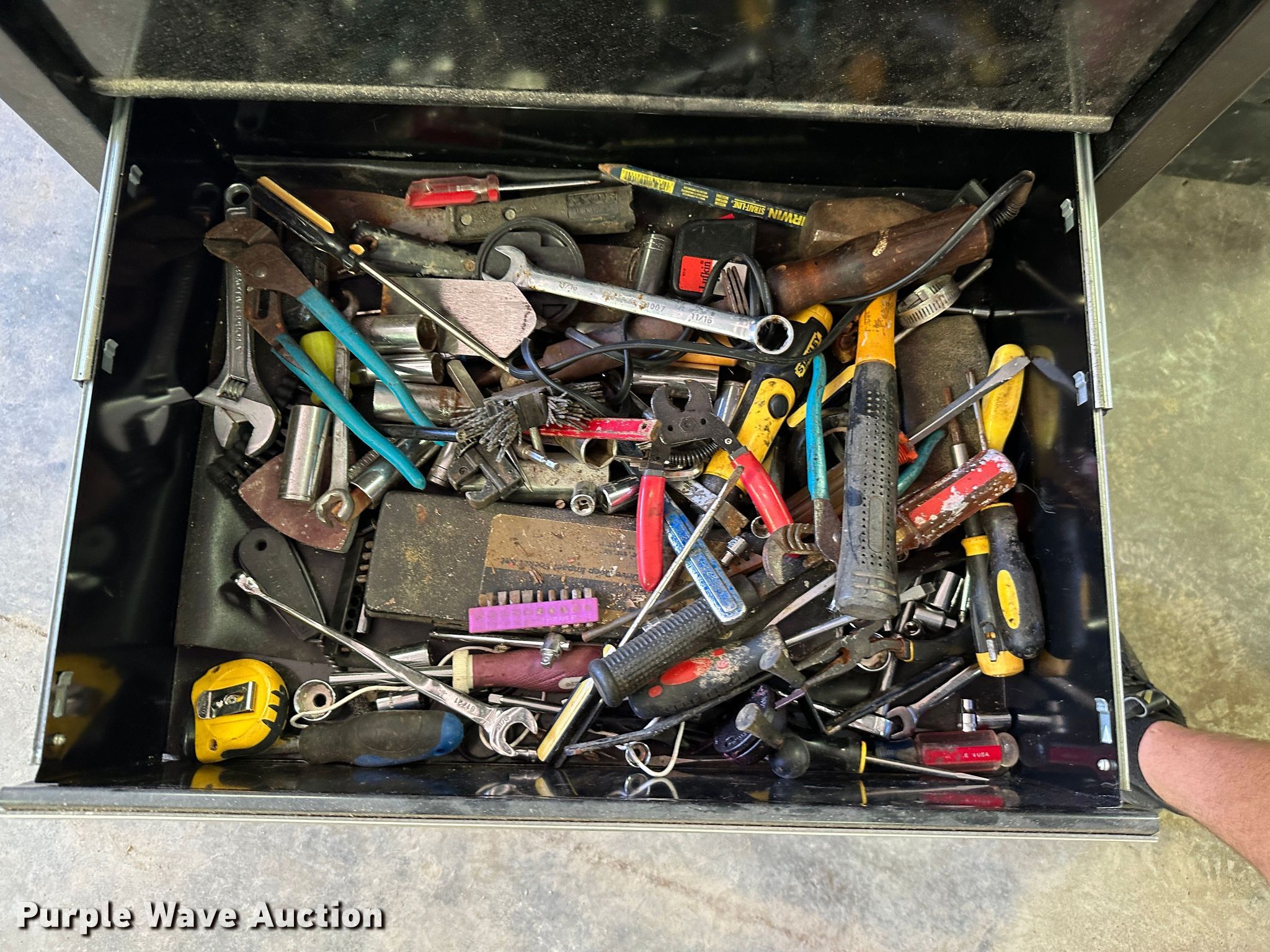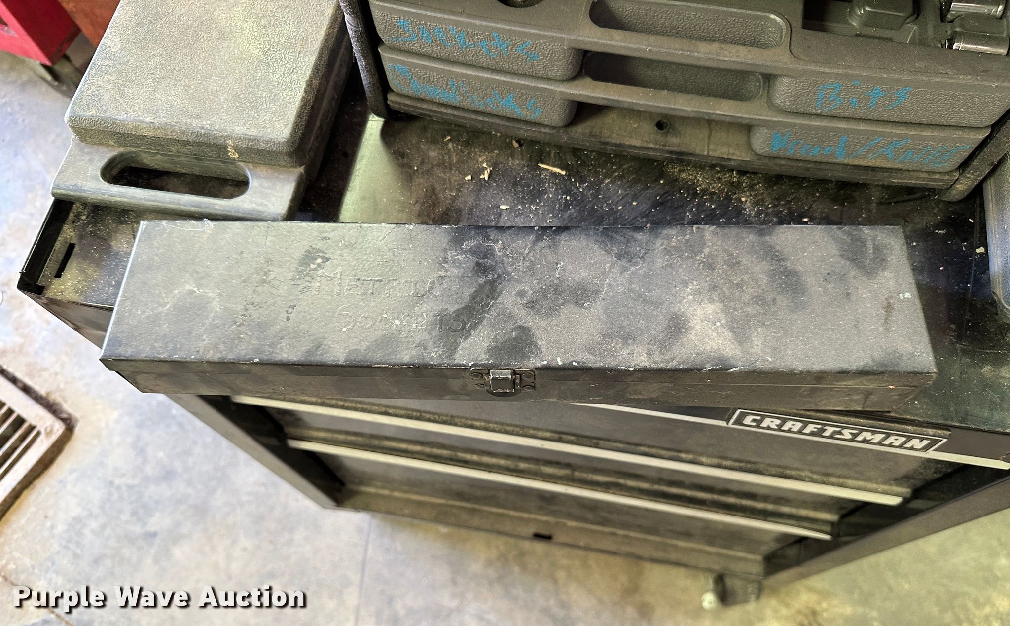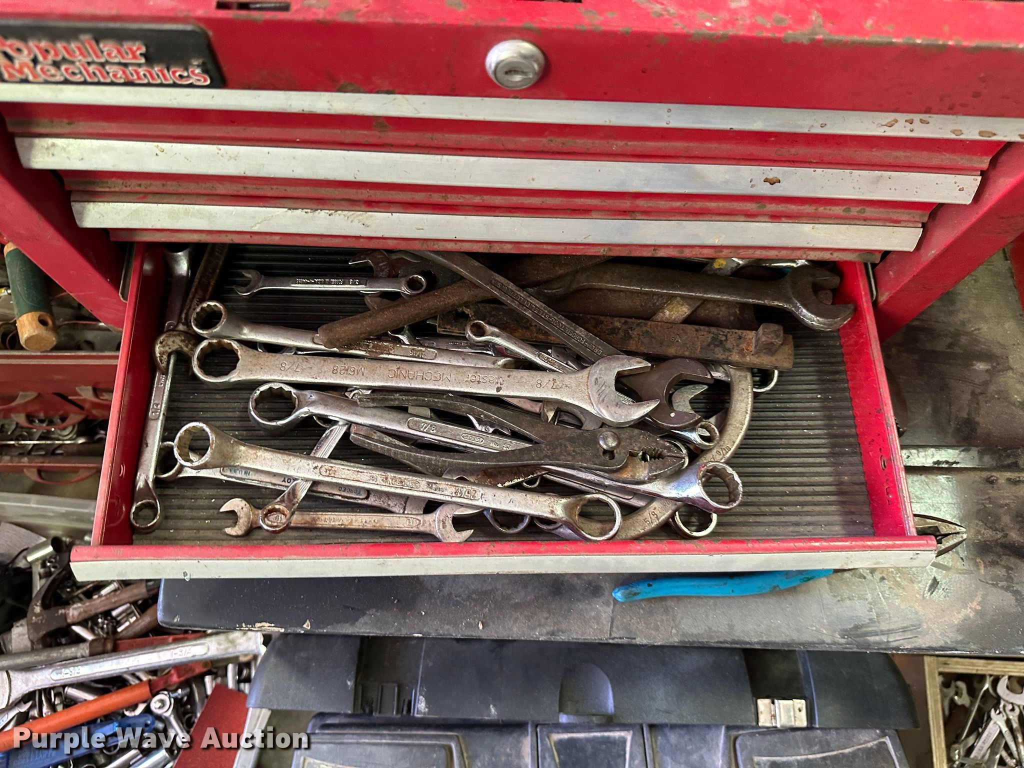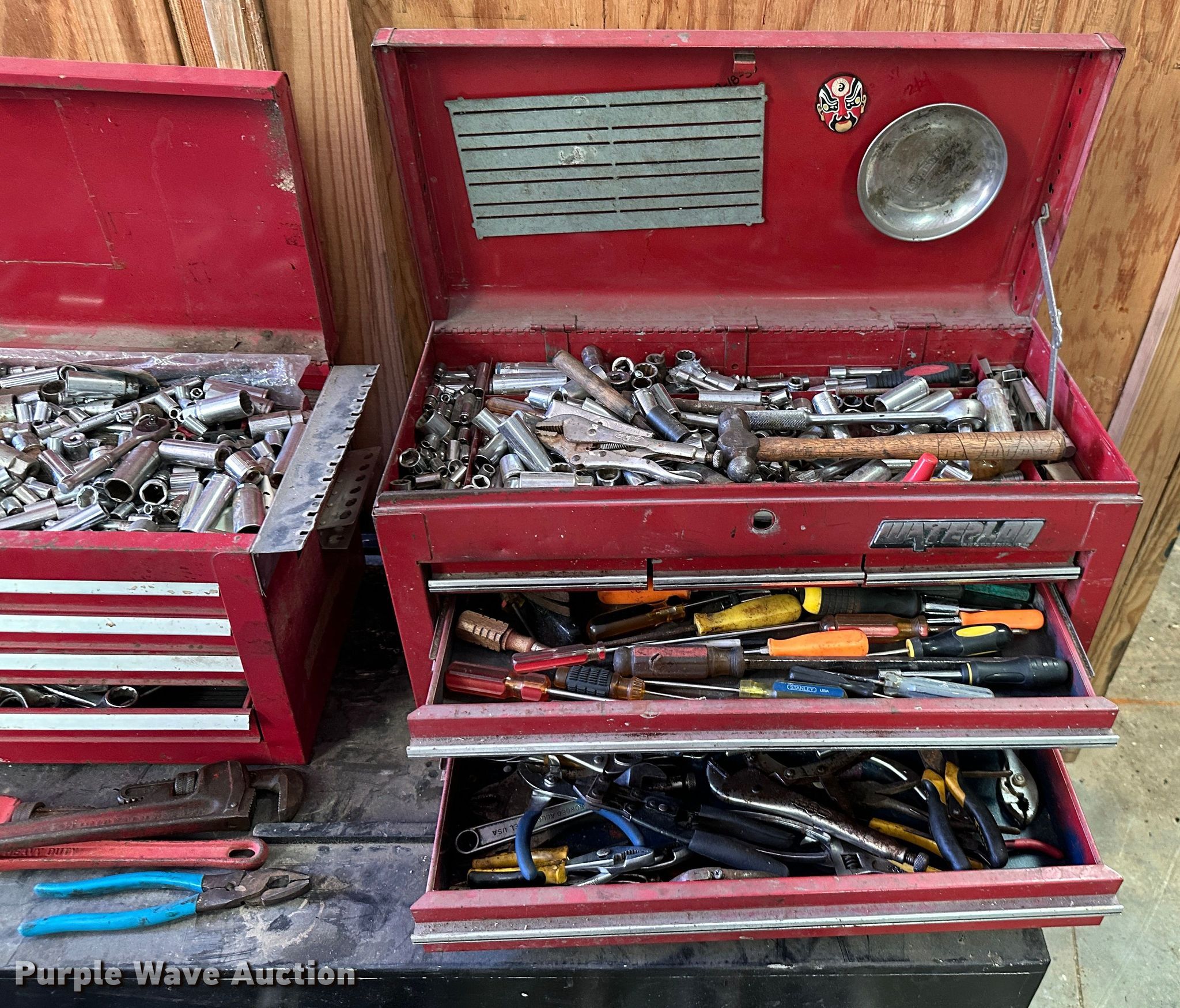 Purple Wave is selling a used Tools in Kansas. This item is a (9) toolboxes with the following: Tools, 55 gallon drum with pump