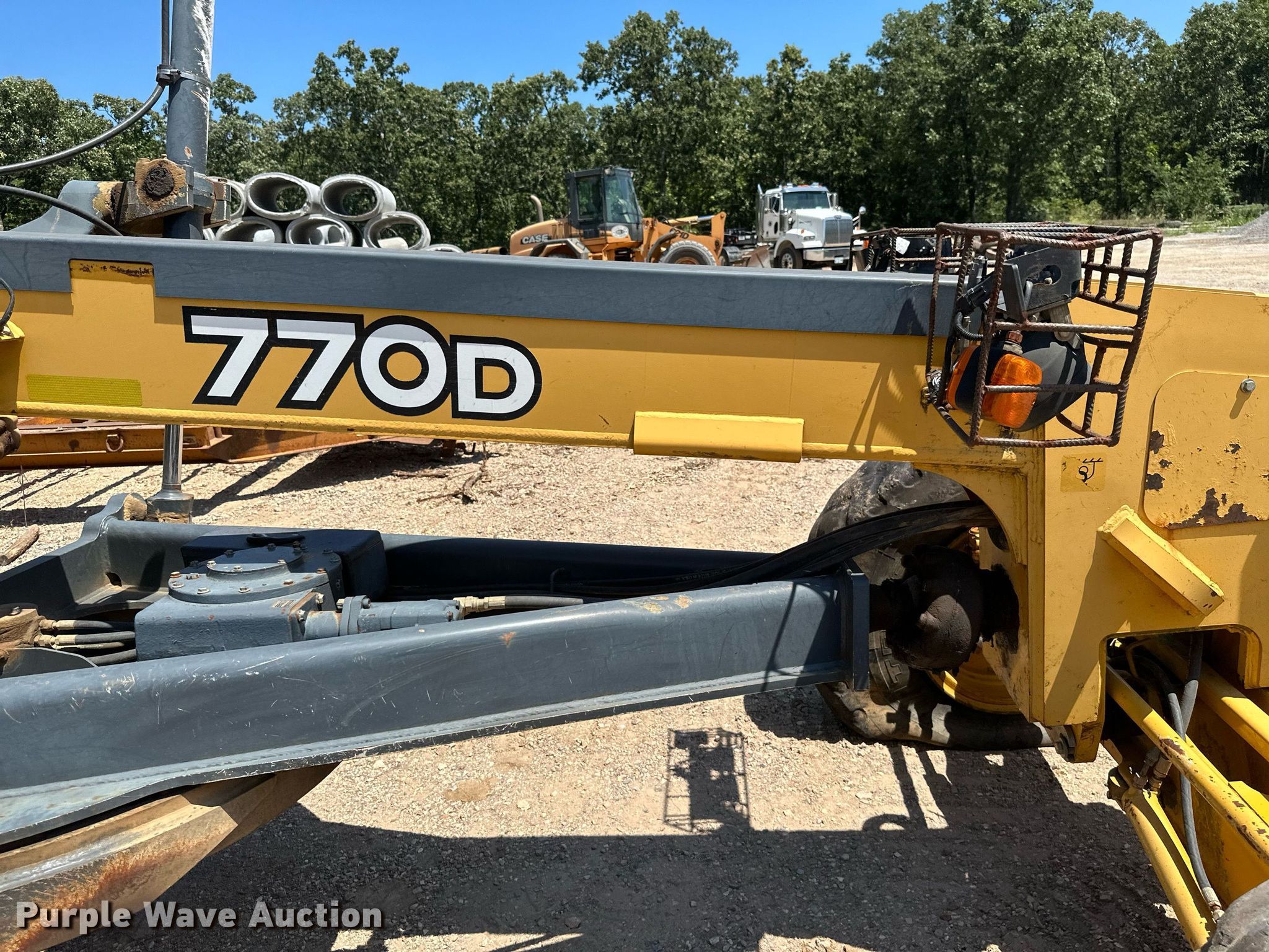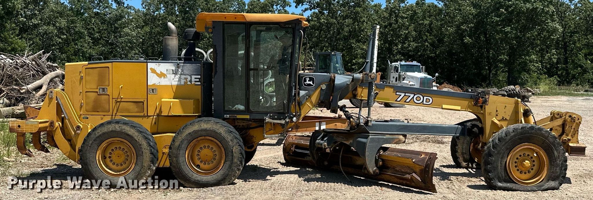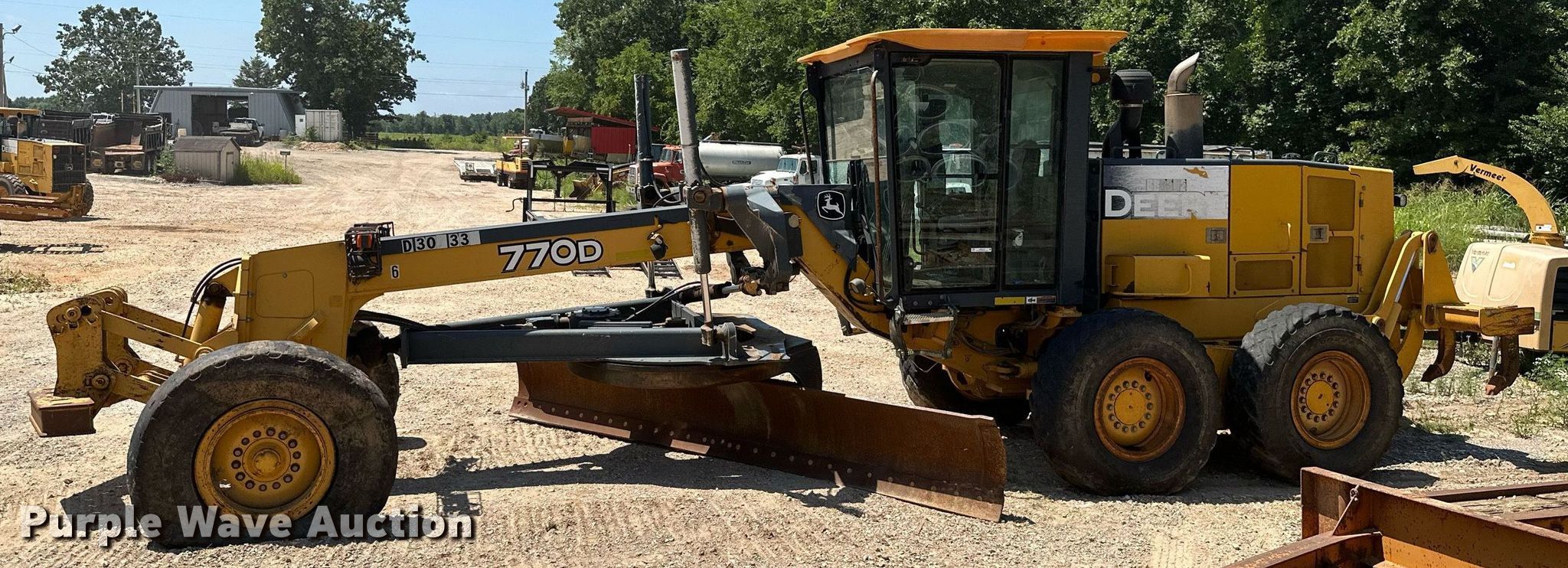 Purple Wave is selling a used Motor Grader in Oklahoma. This item is a 2009 John Deere 770D motor grader with the following: Hours: Unknown, Serial: DW770DX623762