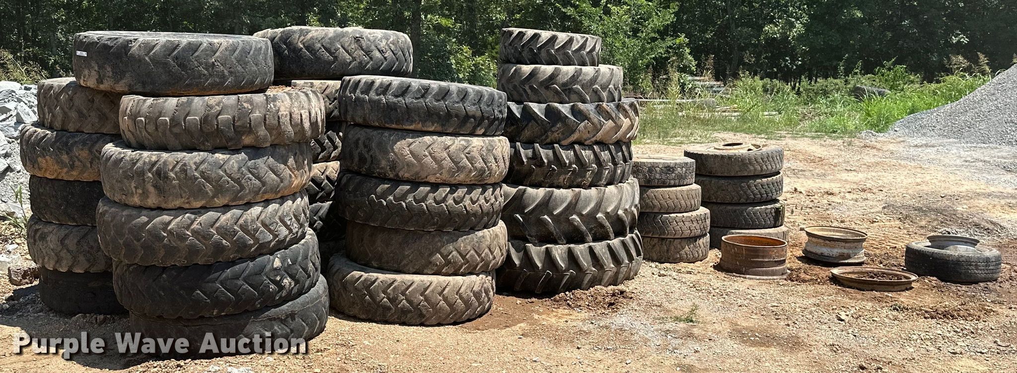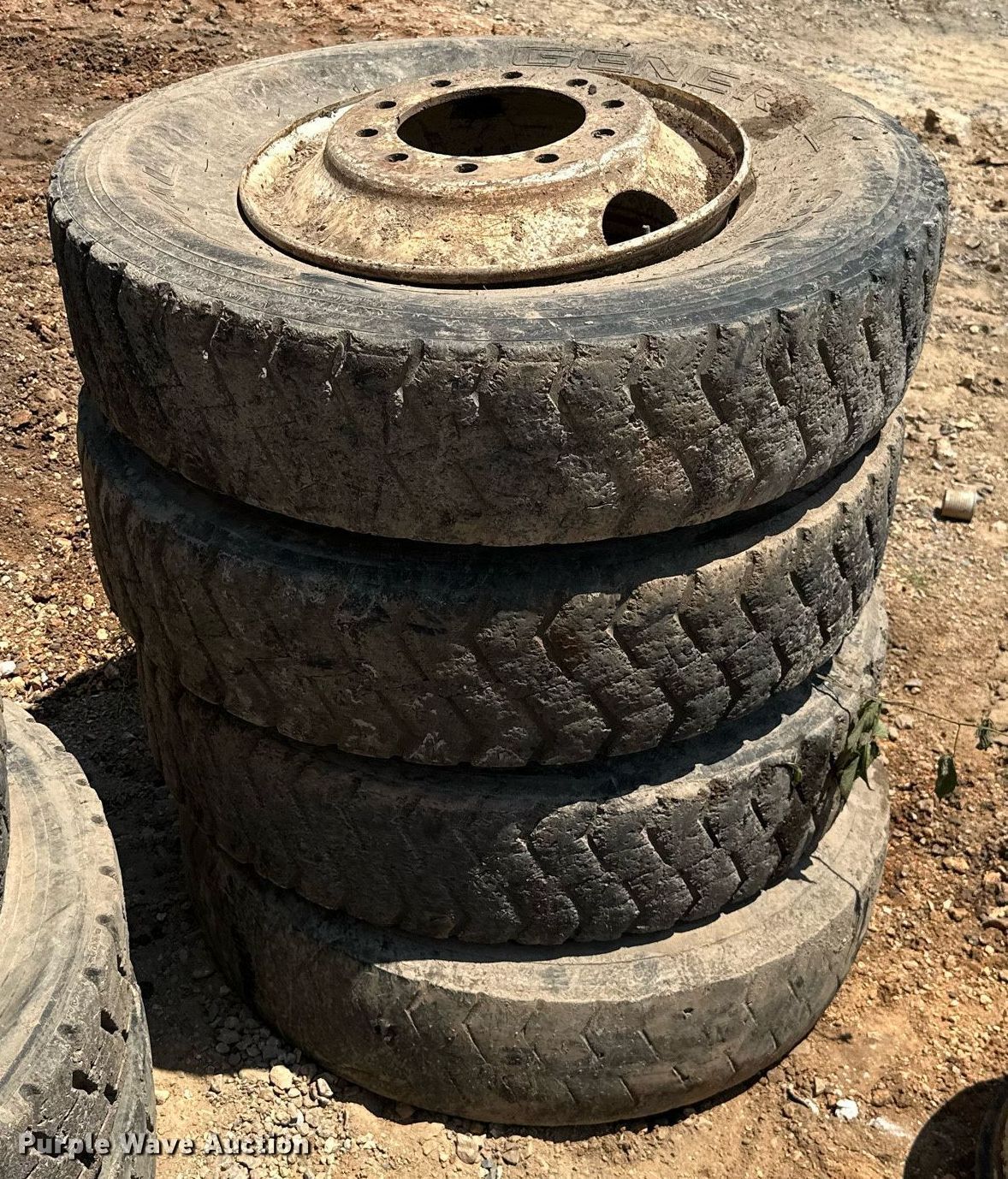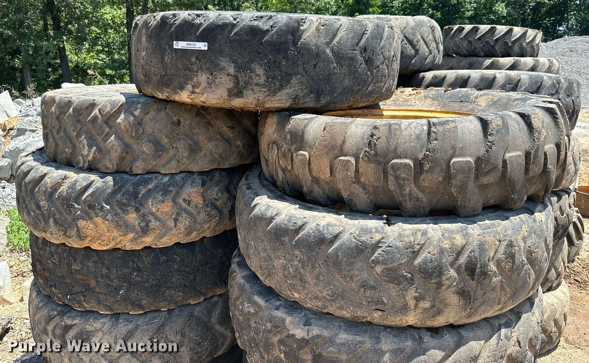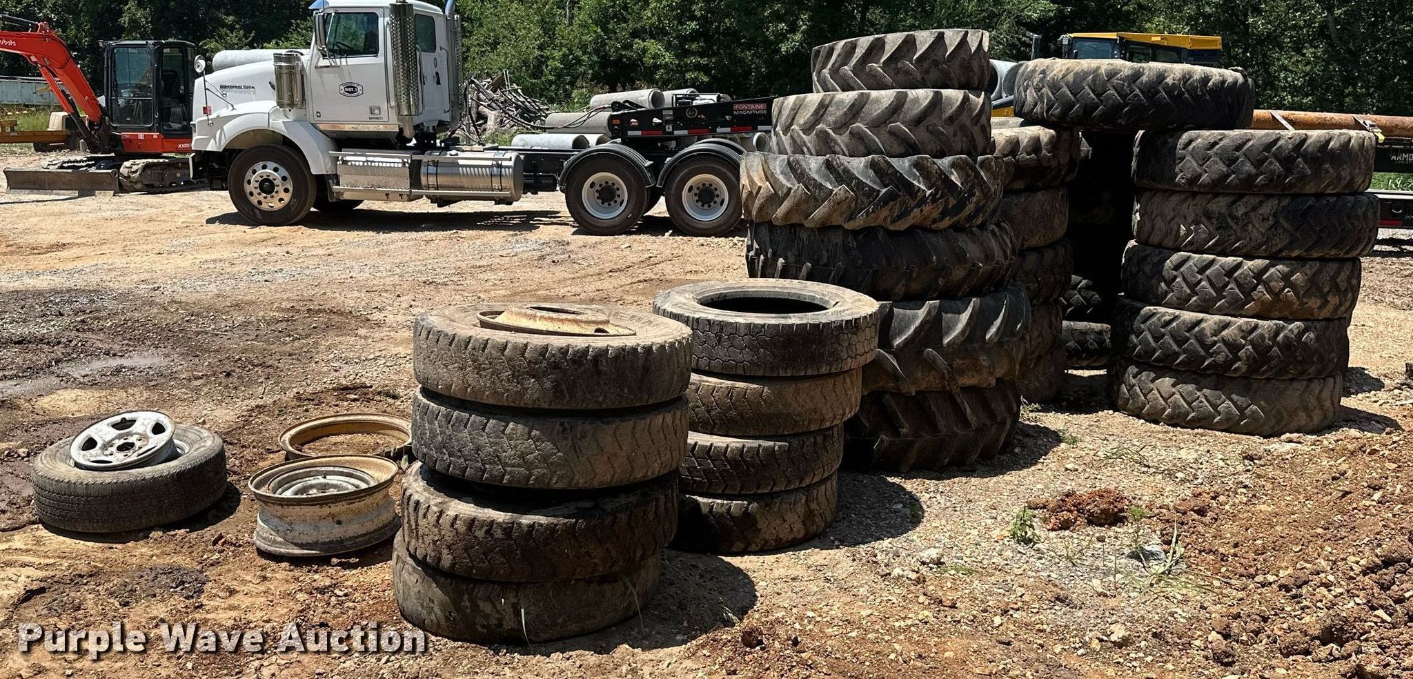 Wheels and tires. (11) 14.00R24 tires, (11) 14.00R24 wheels and tires, 24" wheel, 22.5" wheel, (4) 11R22.5 wheels and tires, (4) 285/75R24.5 wheels and tires. Delaware County Dist. #3. Kansas, OK 74347