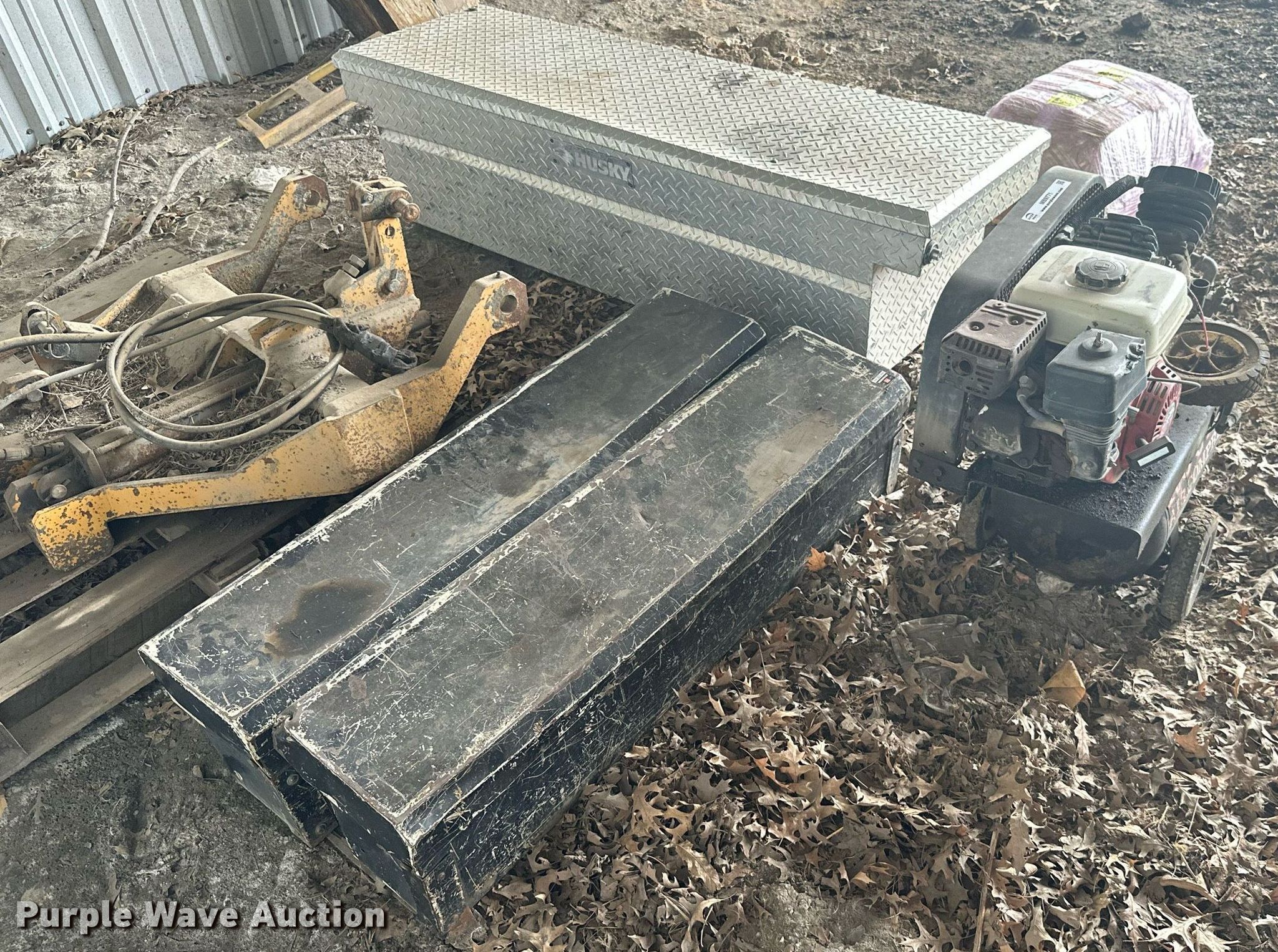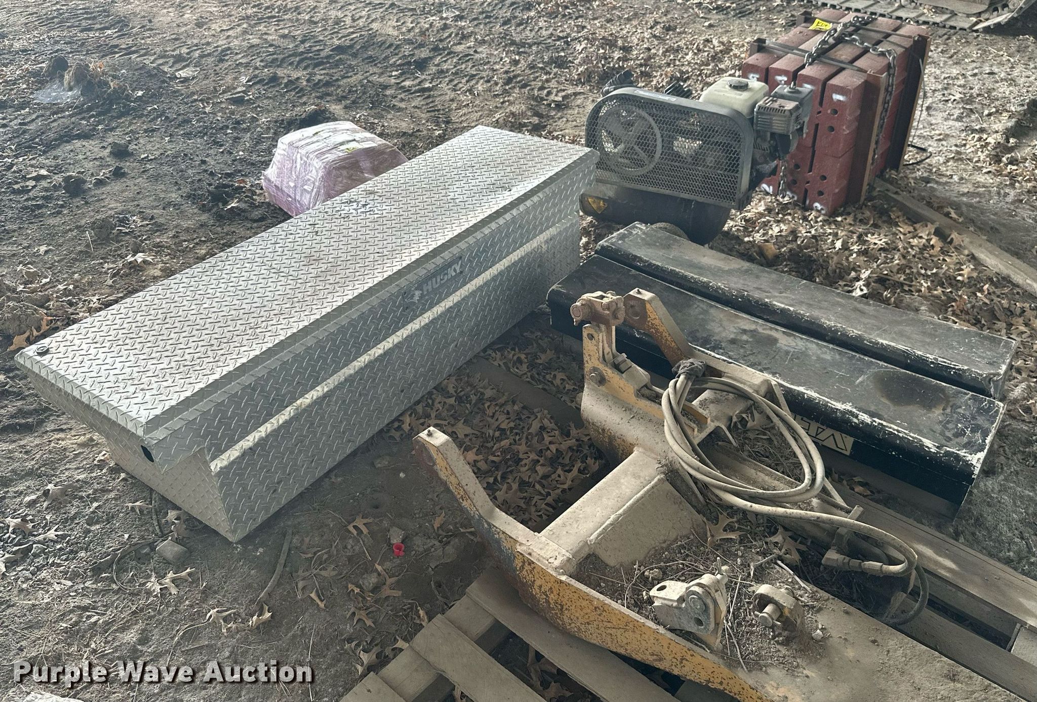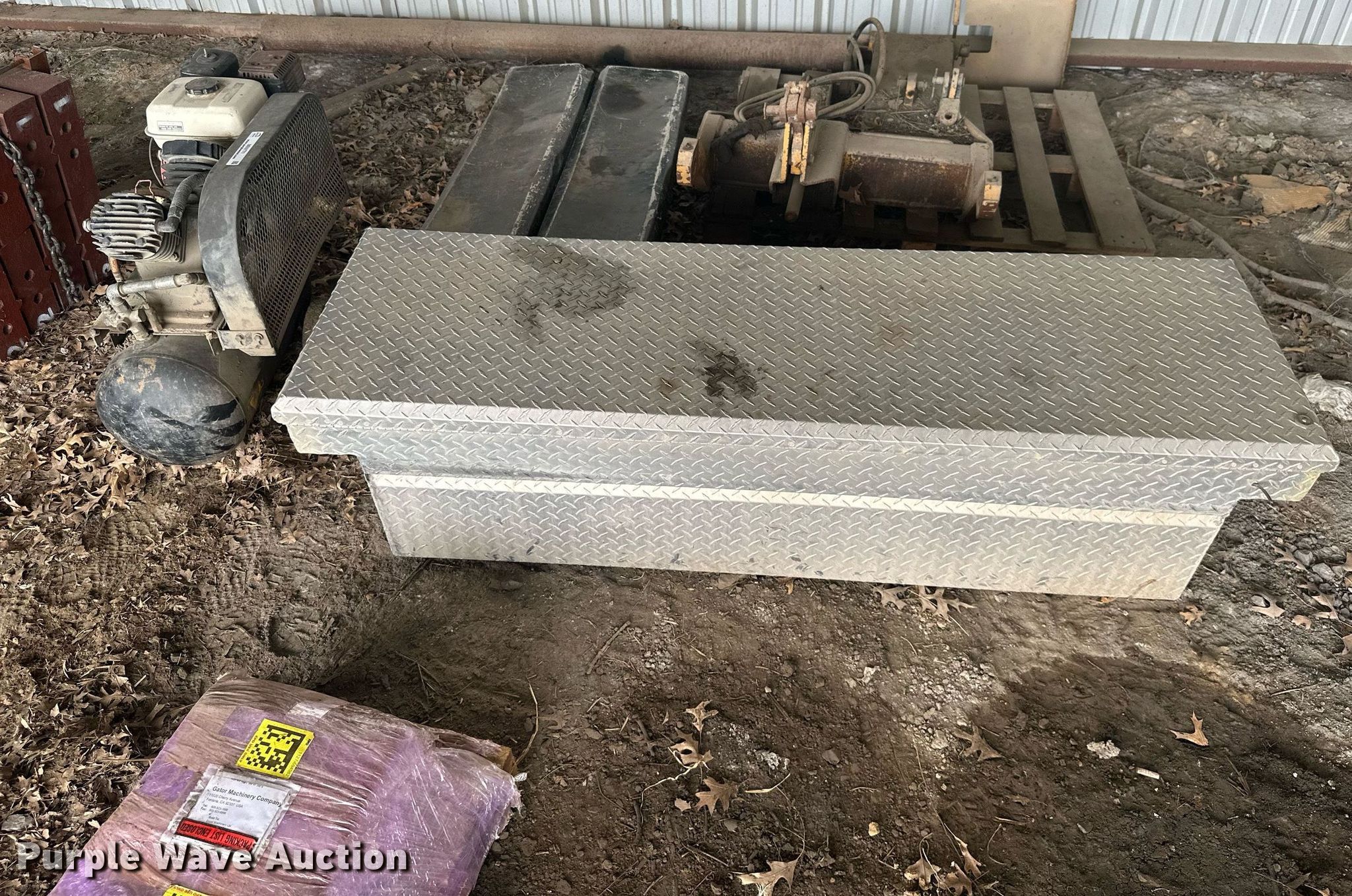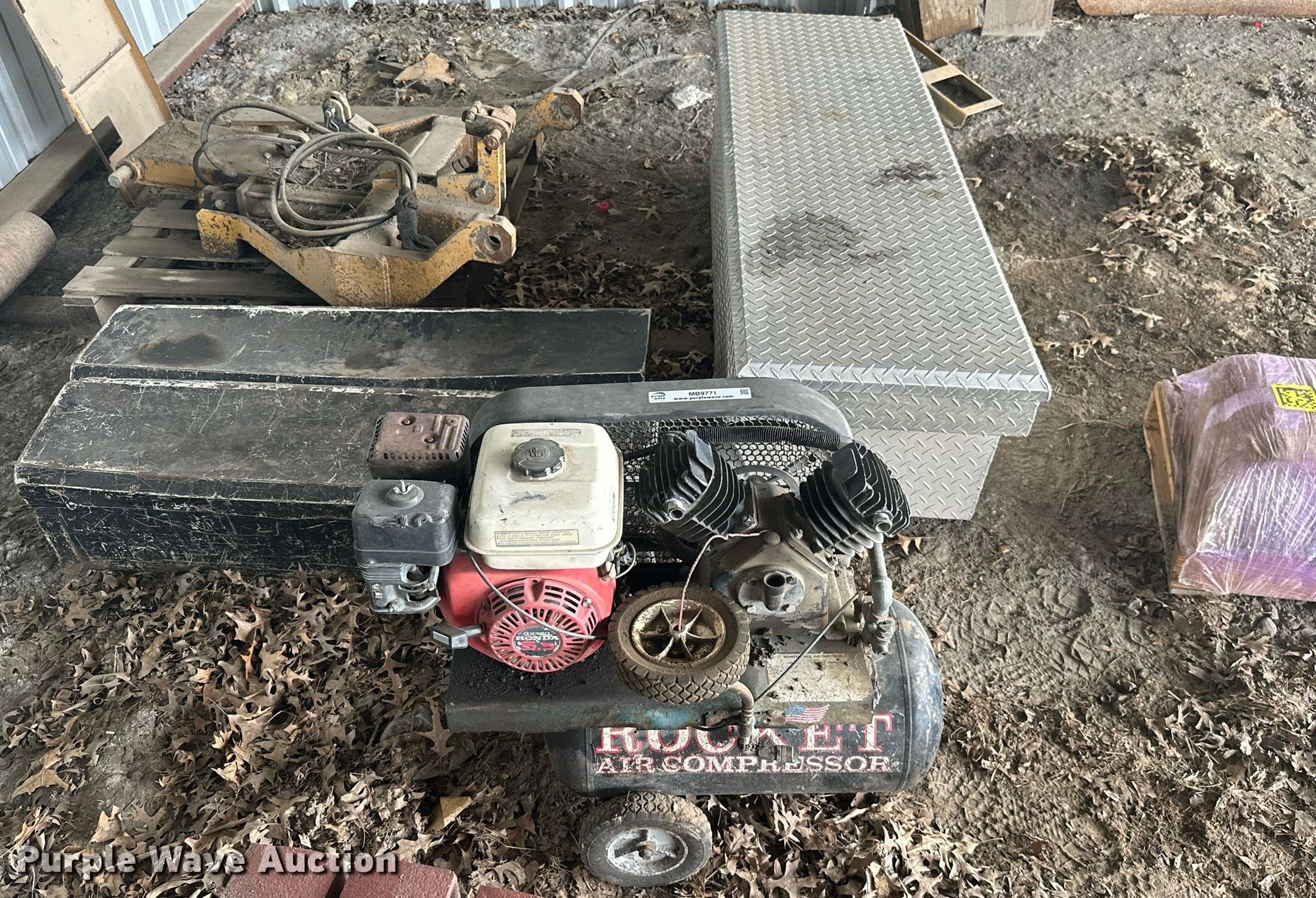 Purple Wave is selling a used Tools in Oklahoma. This item is a Tools with the following: Rocket air compressor, Honda GX160 5.5hp gas engine, (2) 4' W toolboxes, 5' W toolbox, Sockets and more
