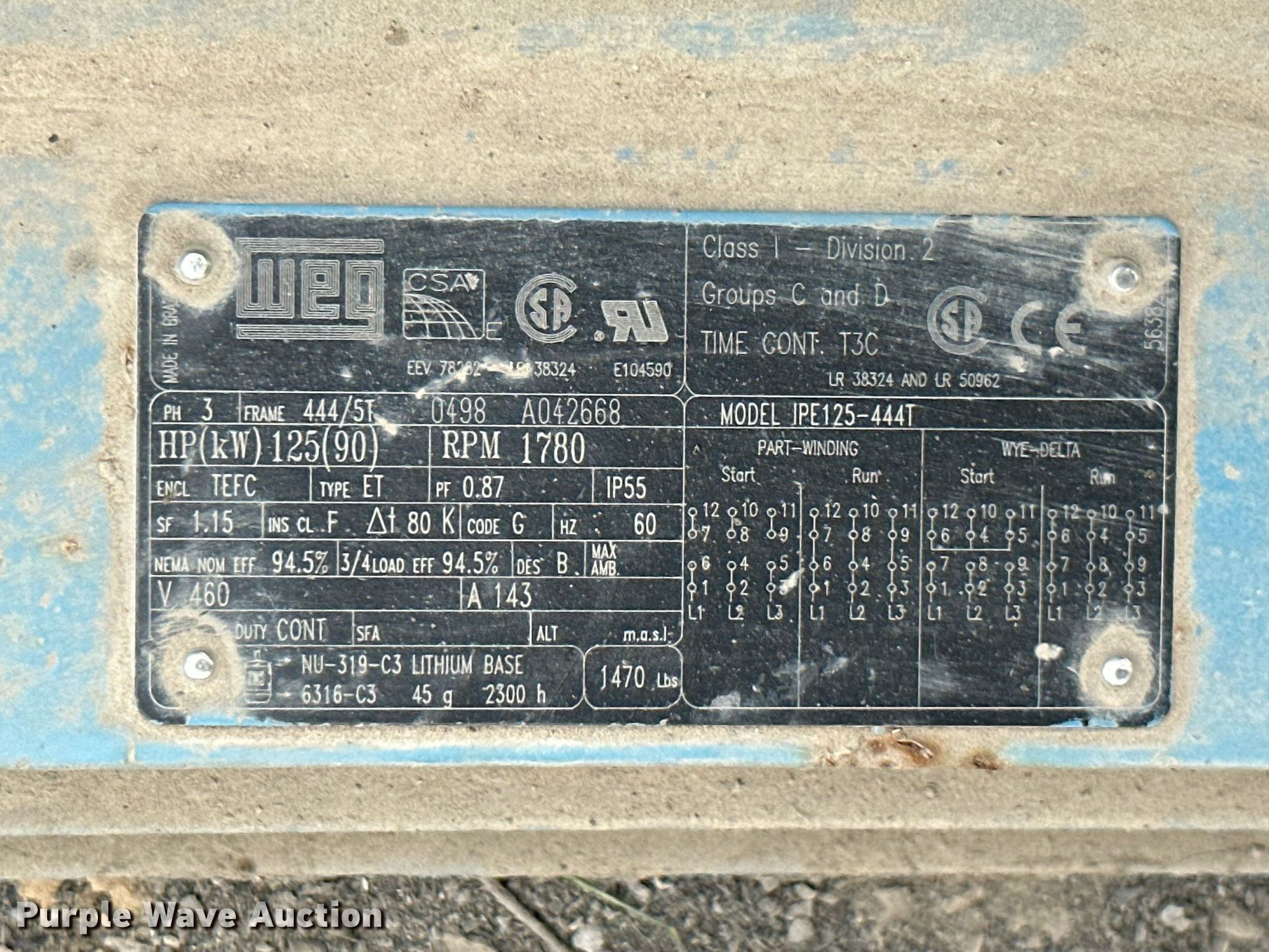 (4) electric motors. SEMC. HP: 200, Volts: 460, Phase: Three. Notes Unknown operating condition. WEG IPE125-444T HP: 125, kW: 90, Volts: 460, Phase: Three. Notes Unknown operating condition. WEG BL60-9-405T HP: 60, kW: 45, Volts: 208-230/460, Phase: Three. Notes Unknown operating condition. Baldor Serial: 37G813T977H1, HP: 10, Volts: 208-230/460, Phase: Three. Notes Unknown operating condition. Craig County District 2. 9133 S. 4440 Rd. Welch, OK 74369