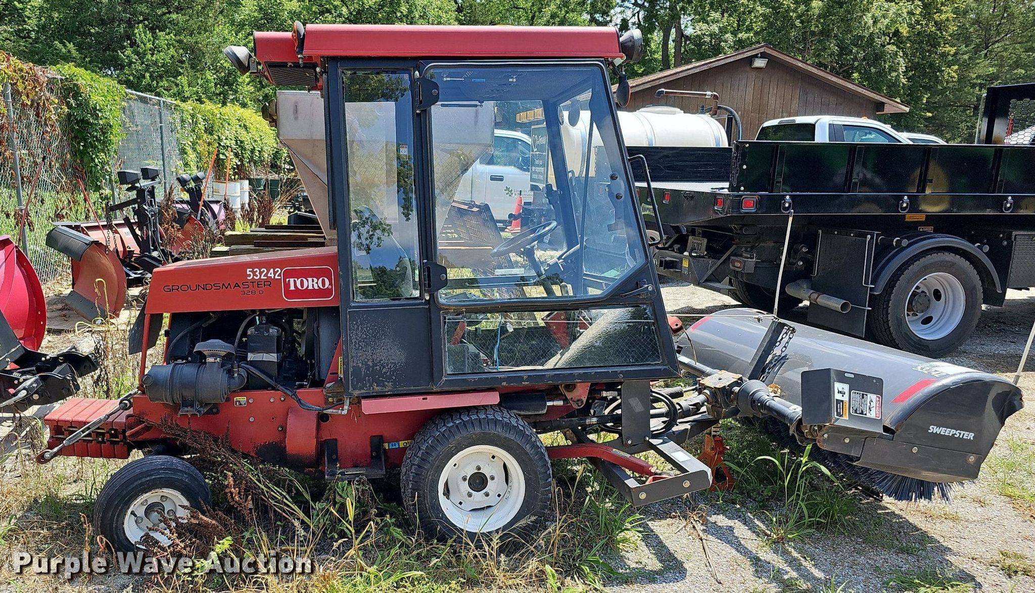 2005 Toro Ground Master 328D lawn mower. Hours: 1,790 on meter, Serial: 30826 250000456. Engine Kubota, Cylinders: 3, Fuel type: Diesel. Transmission Hydrostatic. Operators station EROPS. Features Snow blower Width: 54", Loftness, Broom Width: 63", Sweepster M24P5A, Serial: 0544006, Rear weights. Tires Front: 23x10.50-12, Rear: 16x6.50-8. Notes Flat tire, PTO issues, Unknown operating condition. City of Lincoln- Pioneers Park. 3201 South Coddington Avenue. Lincoln, NE 68522