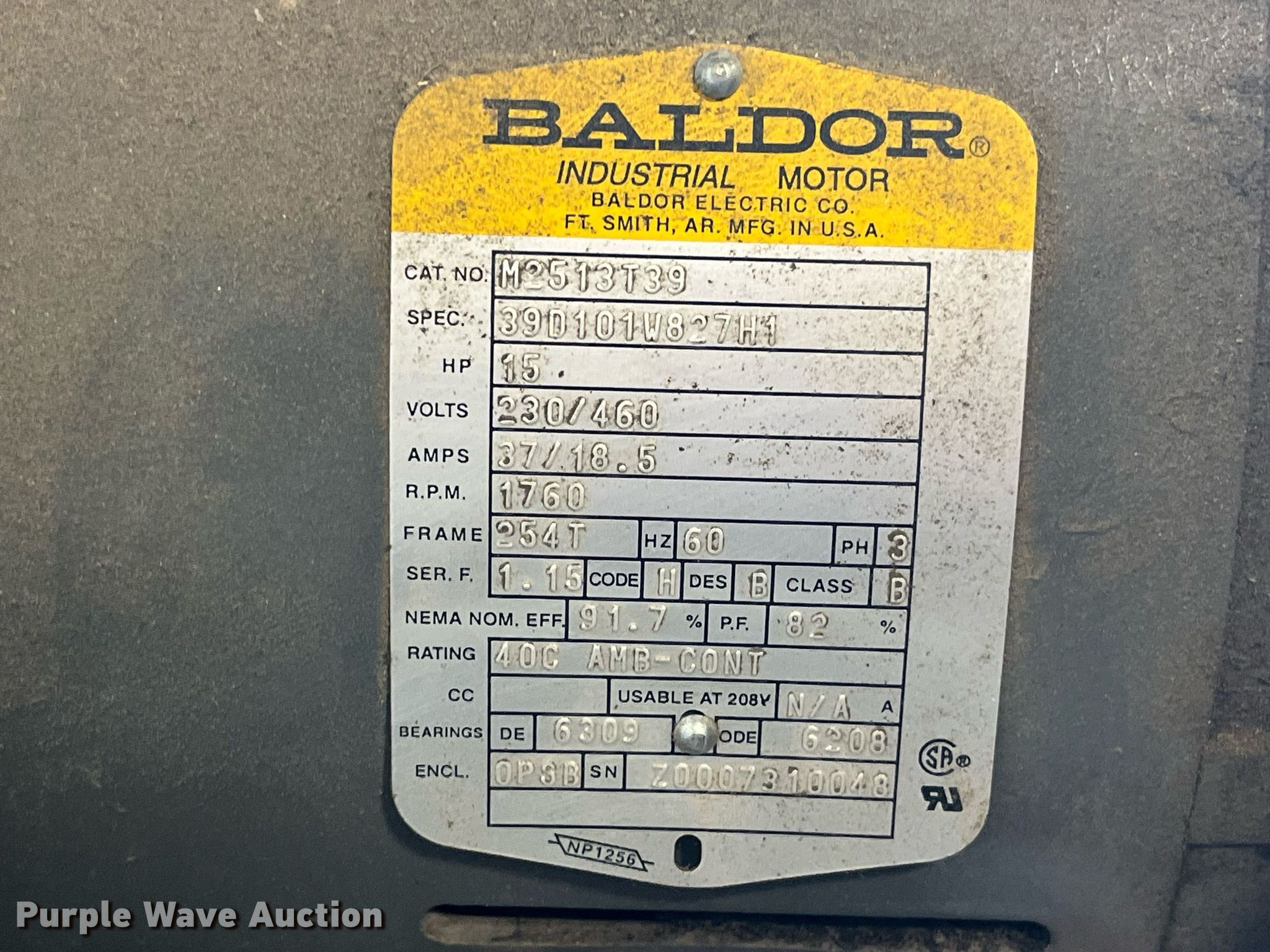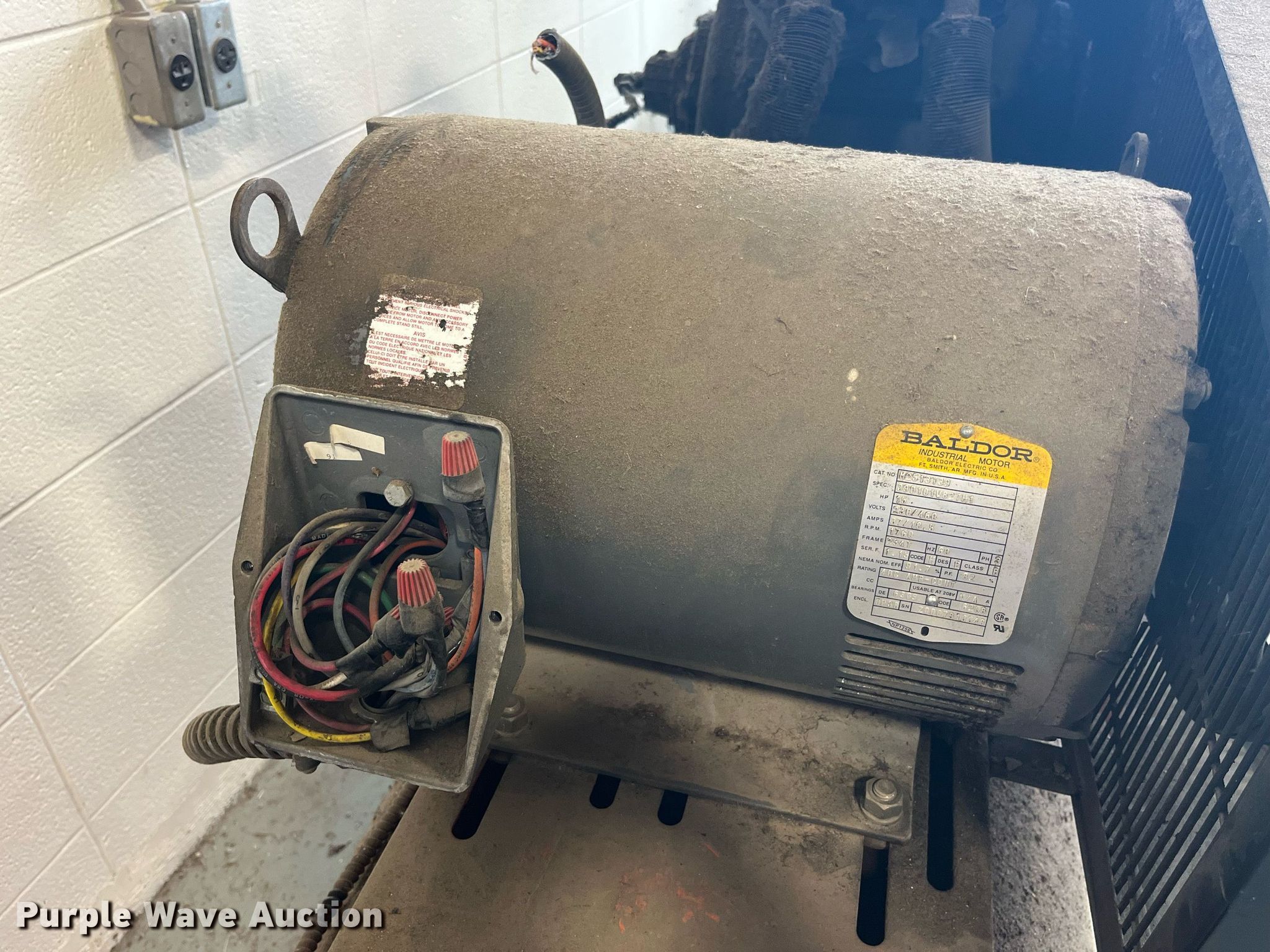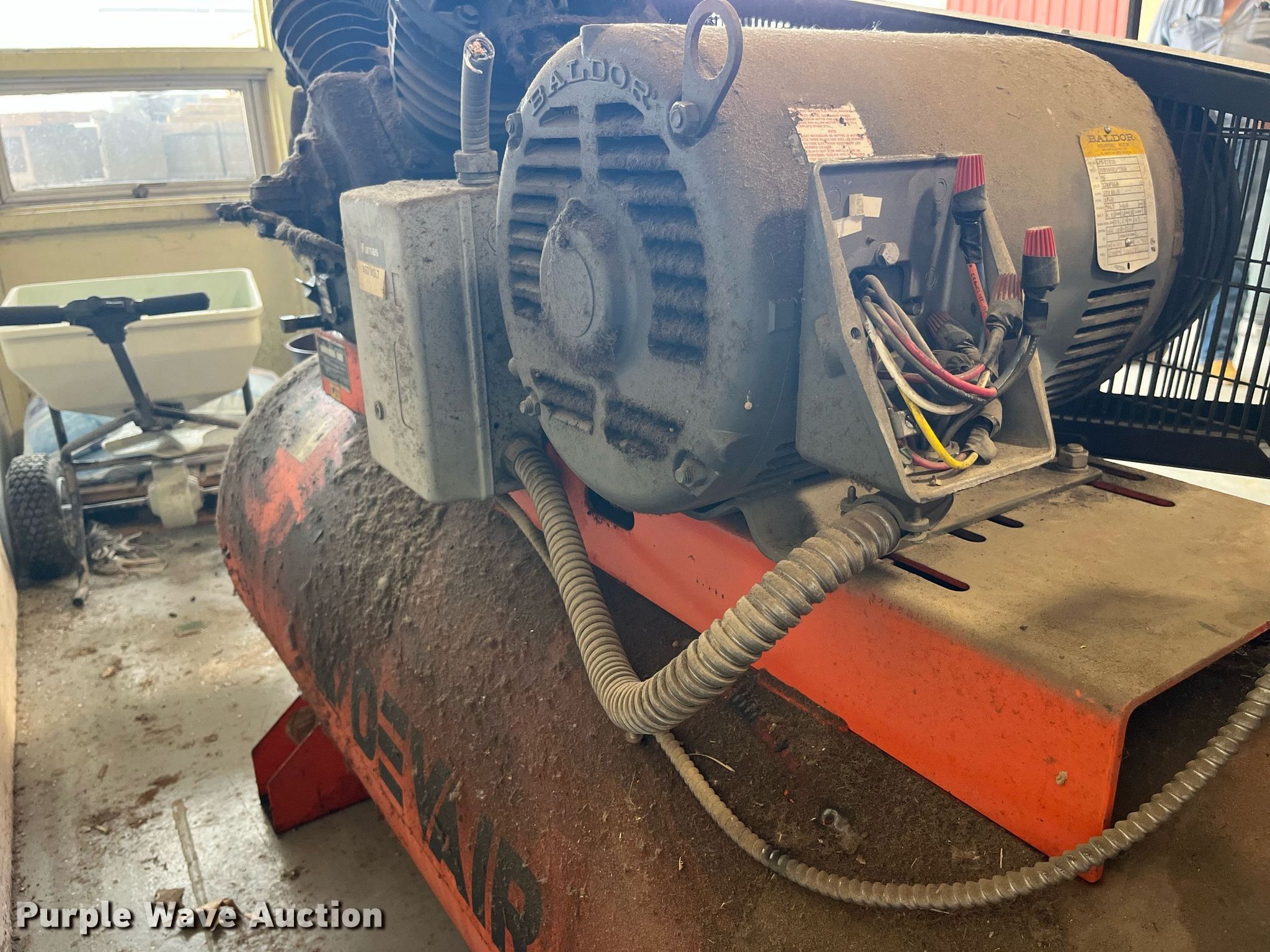 Devair VAV-5062 air compressor. Serial: 41390NK. Electric Motor Baldor Serial: Z0007310048, Volts: 230/460, Phase: Three. Features Air compressor Devair 447, PSI: 200, Tank capacity: 120 gallons. Notes Electrical wiring has been cut-off, Unknown operating condition. Boonville R1 School District. 1694 W Ashley Rd. Boonville, MO 65233