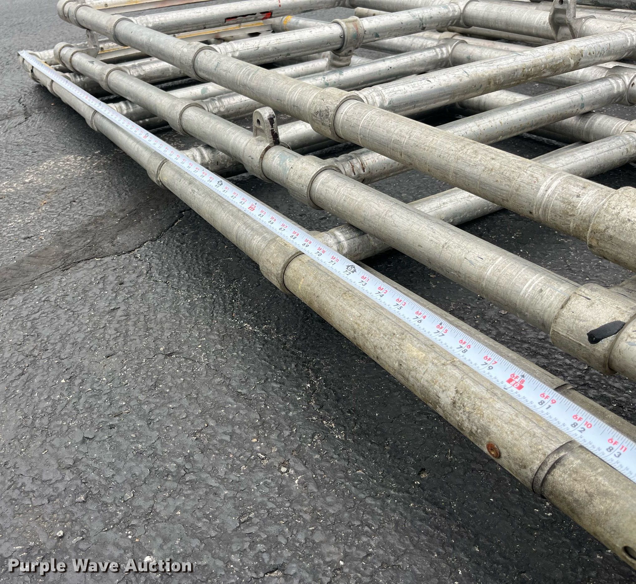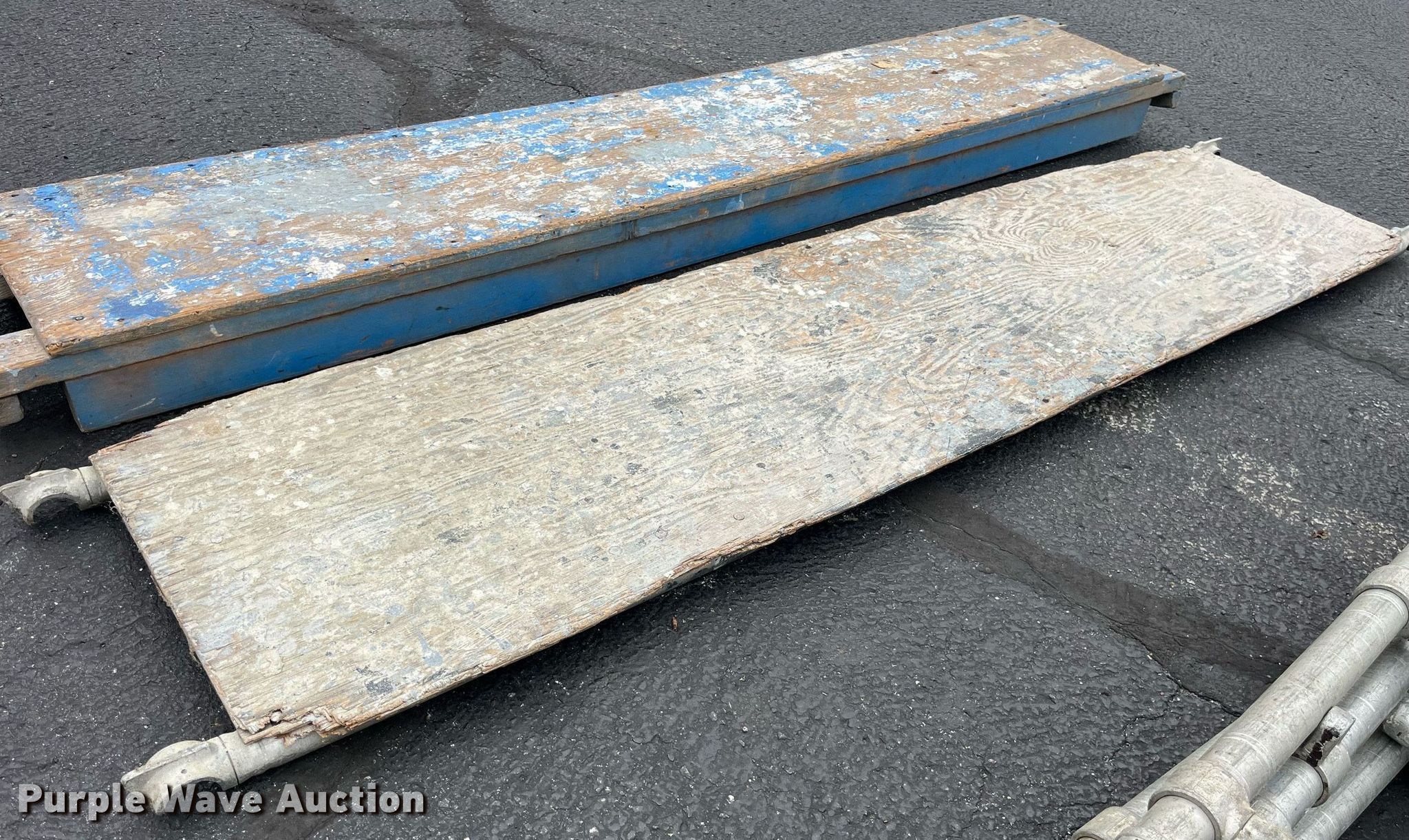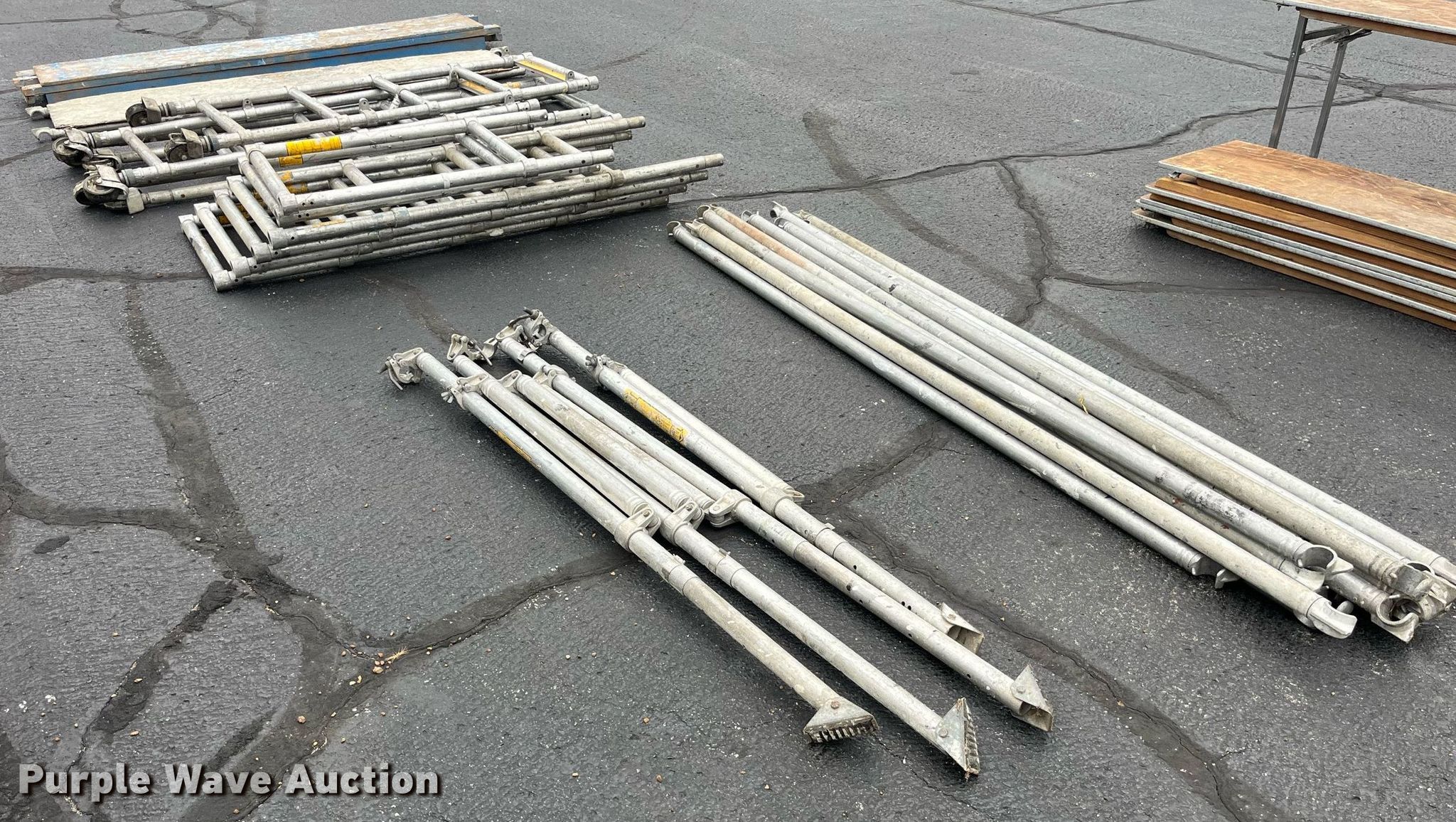 Purple Wave is selling a used Tools in Missouri. This item is a Scaffolding with the following: (2) planks, 8' L x 18" W, 7' 10" L, (10) uprights, (2) 29" W x 79" H, (2) 29" W x 91" H, (2) 29" W x 46" H, (4) 29" W x 68" H, (15) 107" L cross-members