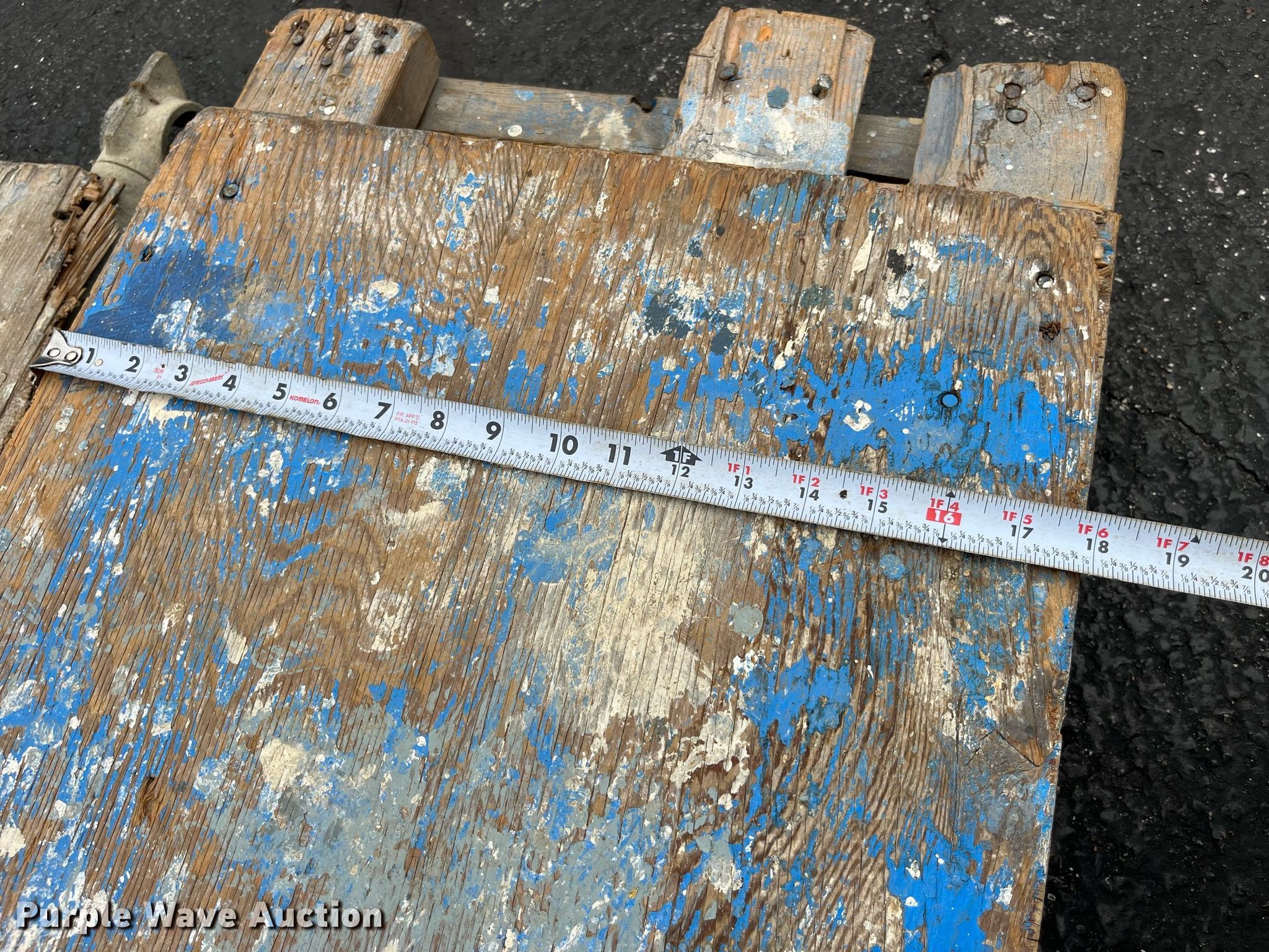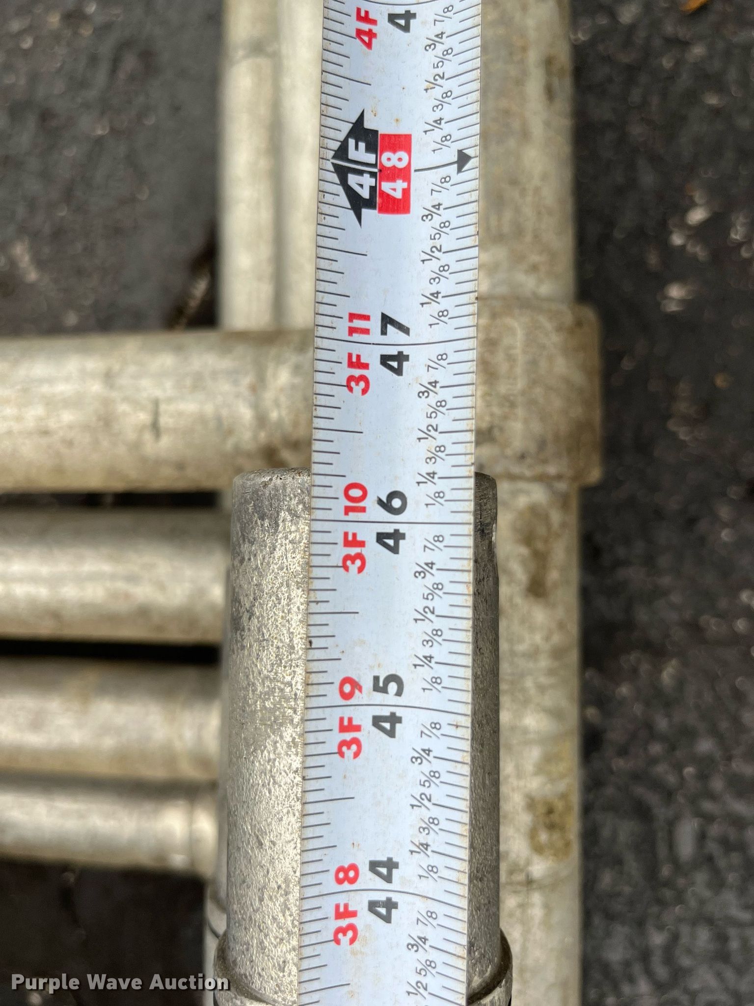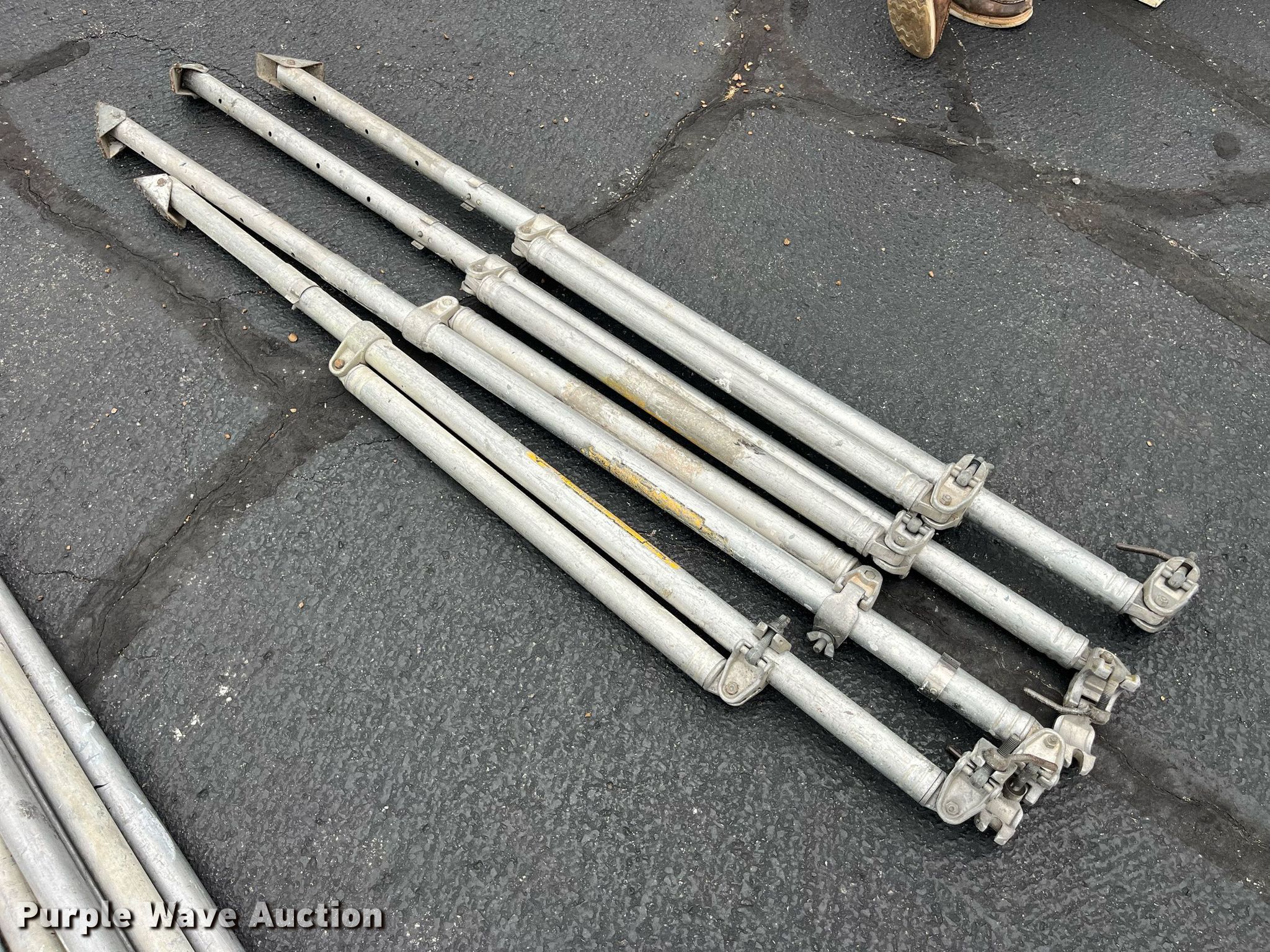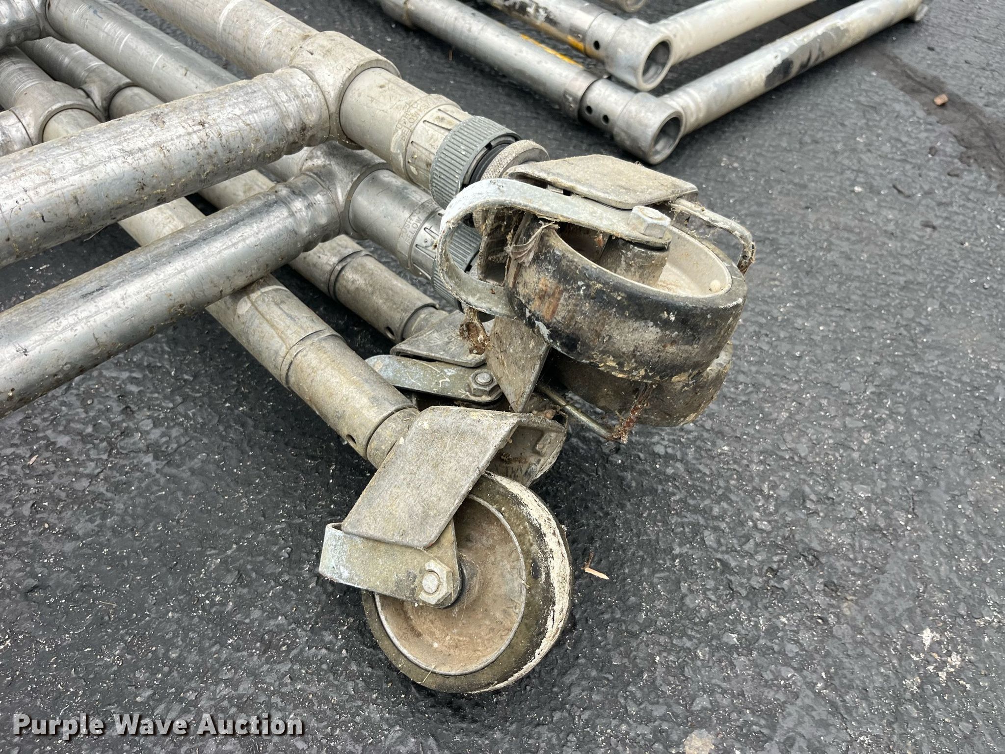 Purple Wave is selling a used Tools in Missouri. This item is a Scaffolding with the following: (2) planks, 8' L x 18" W, 7' 10" L, (10) uprights, (2) 29" W x 79" H, (2) 29" W x 91" H, (2) 29" W x 46" H, (4) 29" W x 68" H, (15) 107" L cross-members