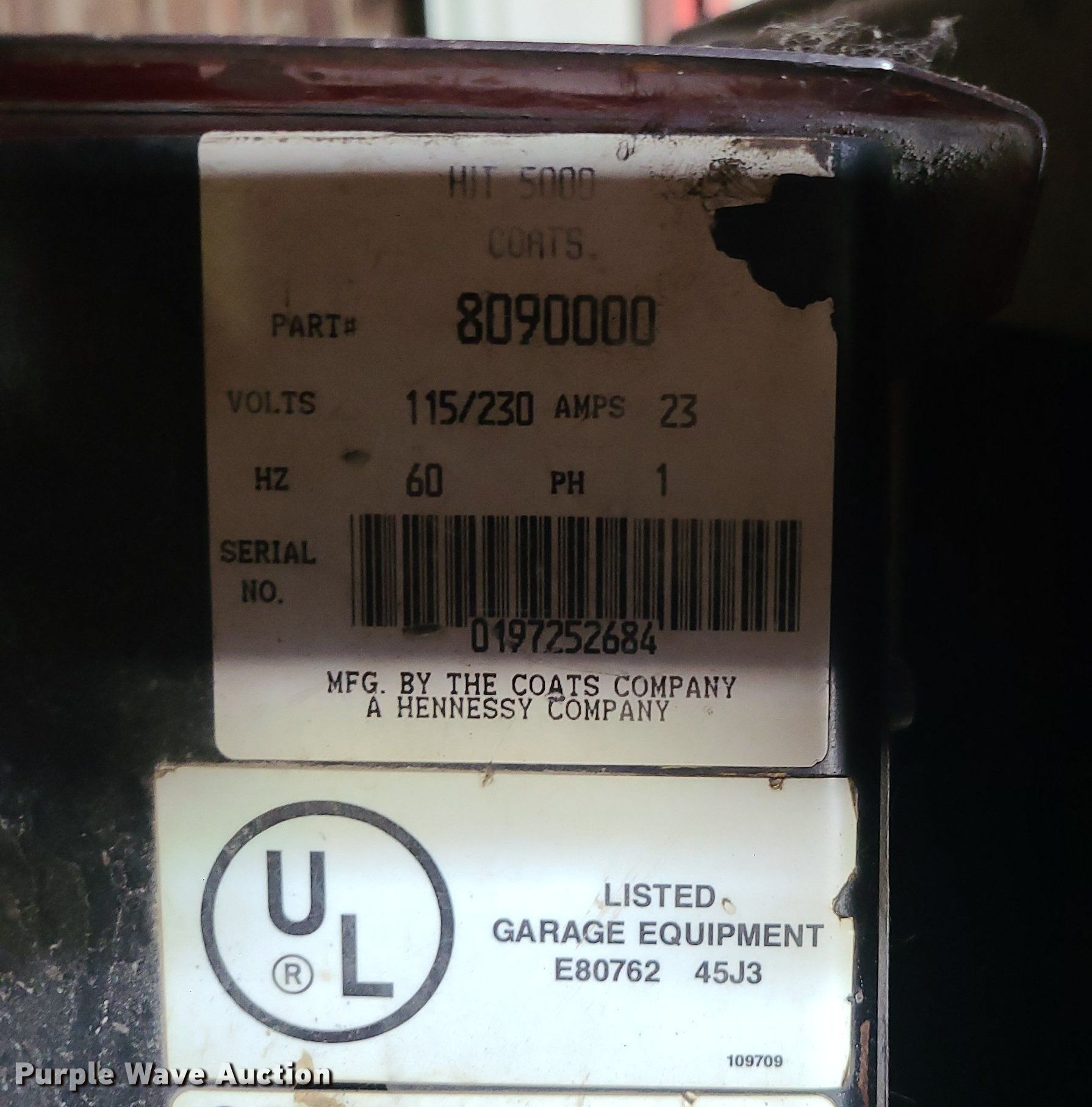 Purple Wave is selling a used Tools in Missouri. This item is a Coat Hit 5000 tire machine with the following: Volts: 115/230, Serial: 0197252684