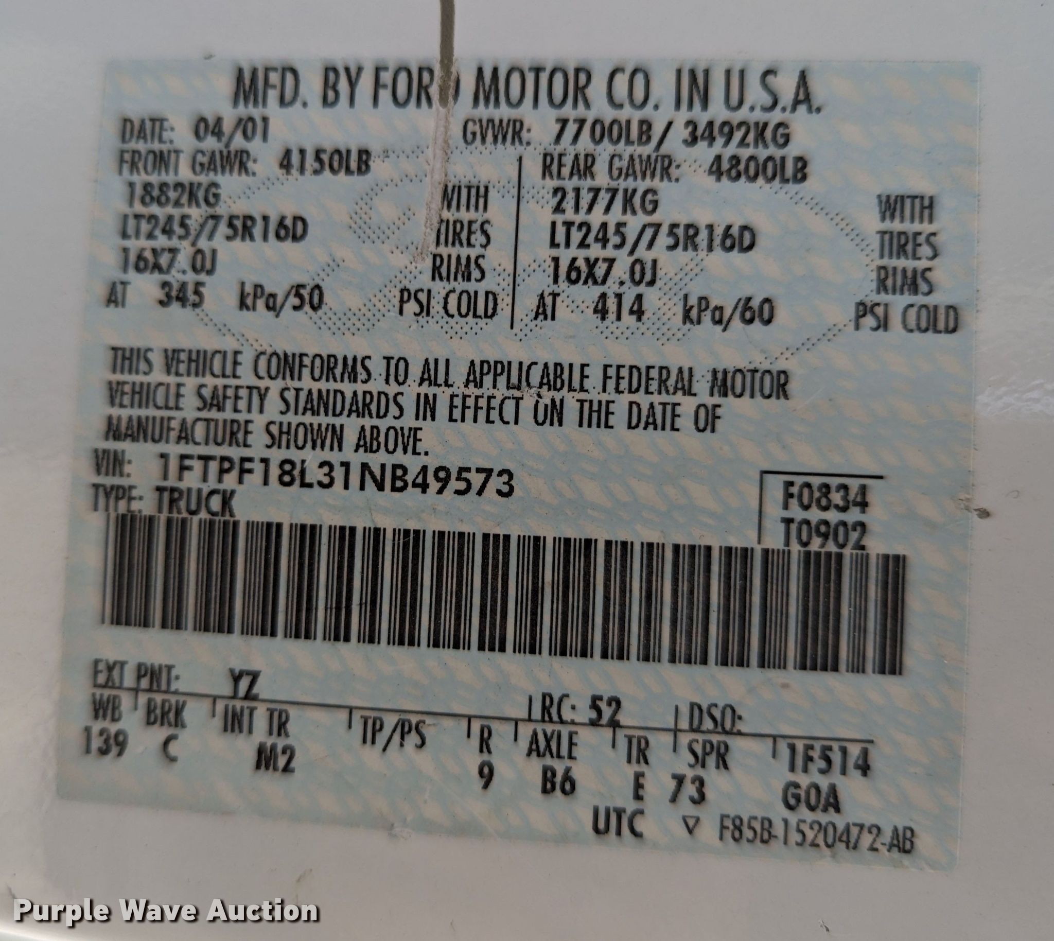 Purple Wave is selling a used 1/2 Ton Pickup or Van in Oklahoma. This item is a 2001 Ford F150 pickup truck with the following: Miles: 133,069 on odometer, VIN: 1FTPF18L31NB49573