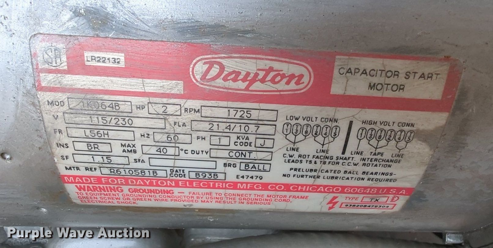 Quincy 310 air compressor. Electric Motor. Dayton 1K064B, HP: 2, Volts: 115/230, Phase: Single. Notes Unknown operating condition. Oklahoma County. 11500 North Hudson Avenue. Oklahoma City, OK 73114