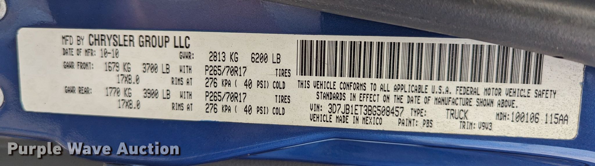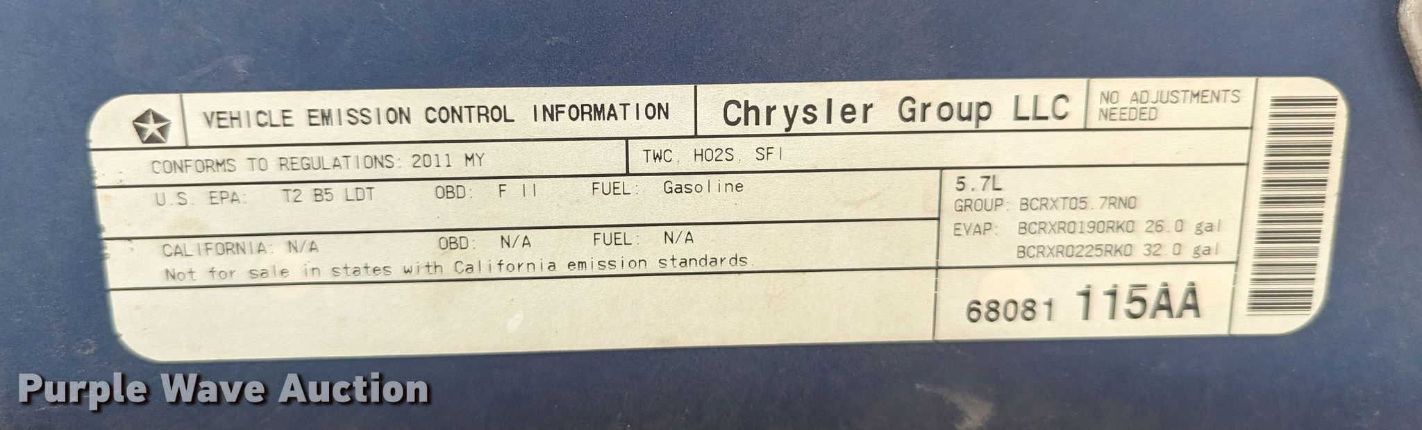 2011 Dodge Ram 1500 pickup truck. Miles: 155,065 on odometer, VIN: 3D7JB1ET3BG508457. Engine Displacement: 5.7L V8 OHV, Cylinders: 8, Fuel type: Gas. Transmission Automatic. Interior AC, Heat, Cruise control. Tires Size: 265/70R17. Notes Dash warning indicator: Check engine, TPMS. Oklahoma title. Title distribution may be delayed up to 30 days from verification of funds. Oklahoma County. 11500 North Hudson Avenue. Oklahoma City, OK 73114