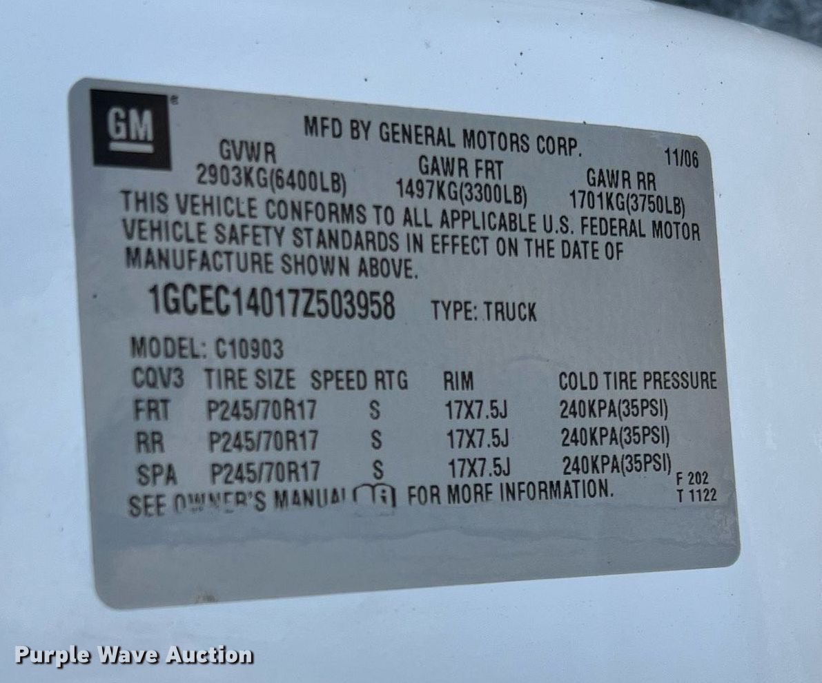 Purple Wave is selling a used 1/2 Ton Pickup or Van in Missouri. This item is a 2007 Chevrolet Silverado 1500 pickup truck with the following: Miles: 181,574 on odometer, VIN: 1GCEC14017Z503958, Unit #: B6078