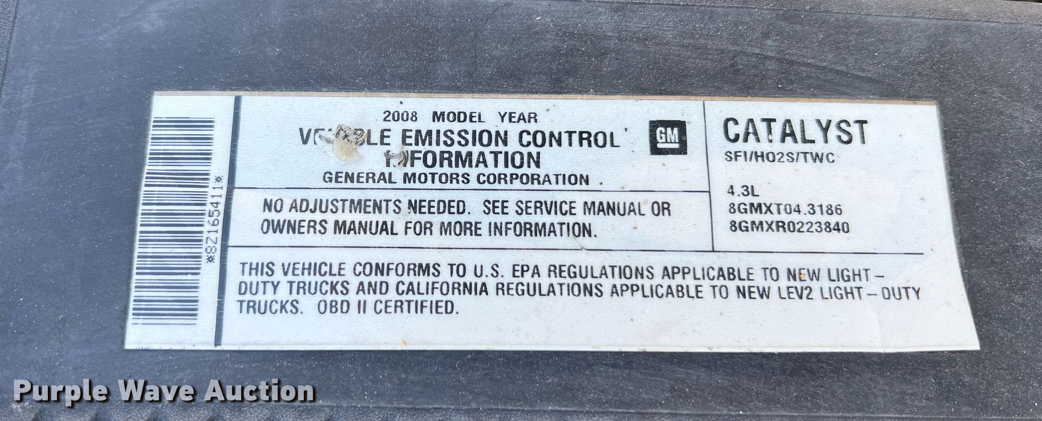 2008 Chevrolet Silverado1500 pickup truck. Miles: 136,308 on odometer, VIN: 1GCEC14X88Z165411, Unit #: B6594. Engine Displacement: 4.3L V6 OHV, Cylinders: 6, Fuel type: Gas. Transmission Automatic. Interior AC, Heat, Cruise control. Tires Size: LT245/75R17. Notes Dash warning indicator: Check engine. Missouri title. Title distribution may be delayed up to 14 days from verification of funds. 8267 Old Hwy 54. New Bloomfield, MO 65063