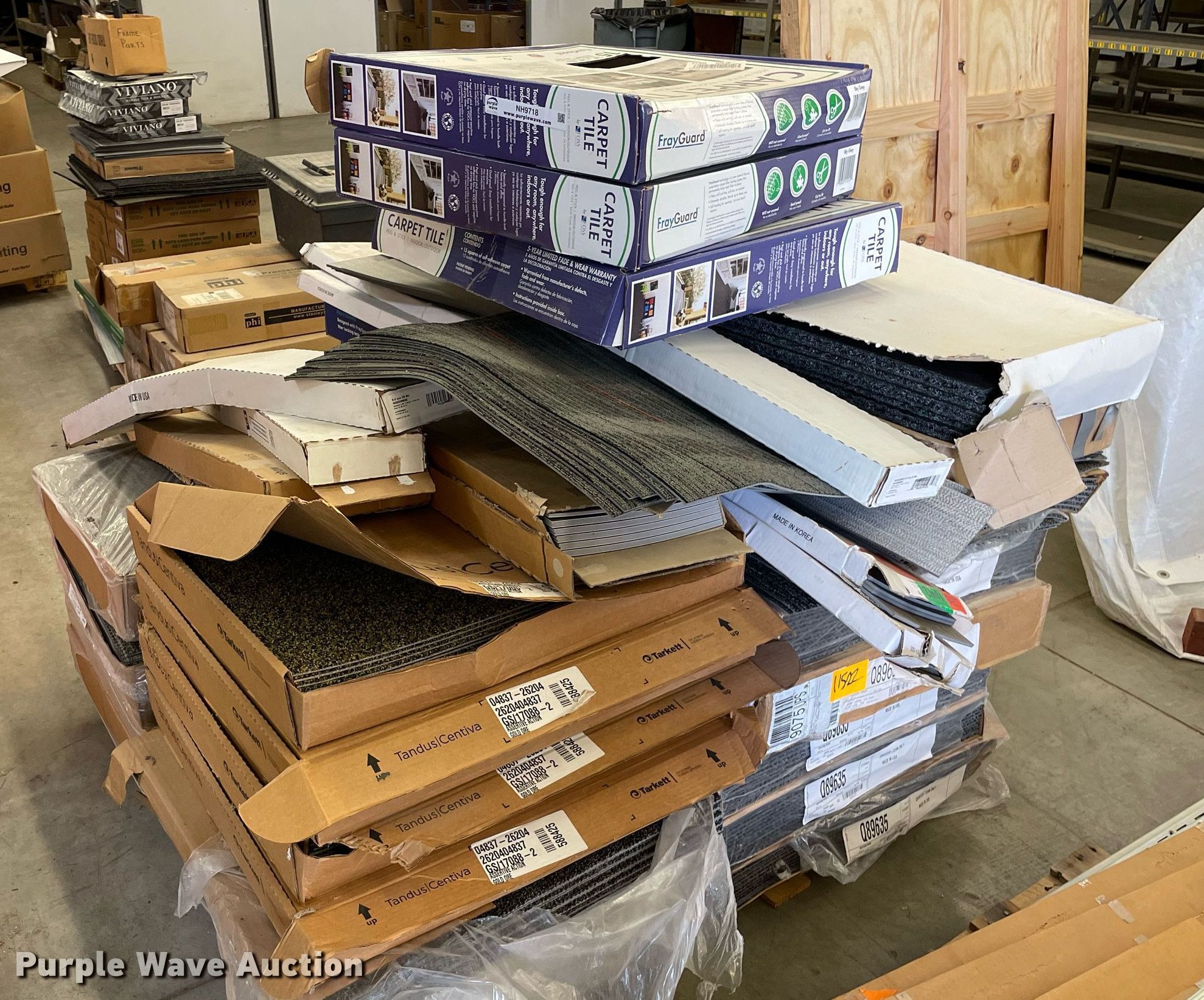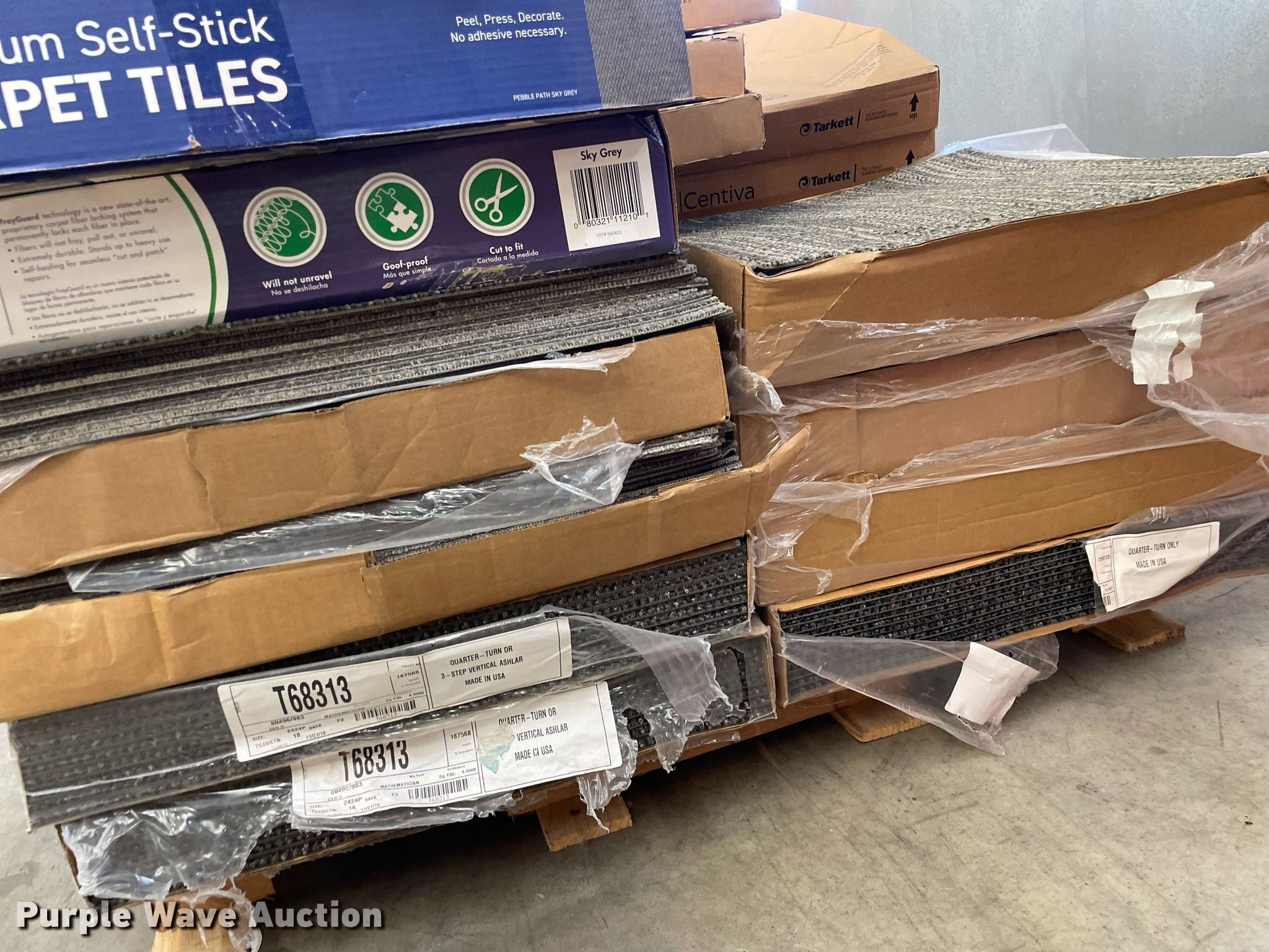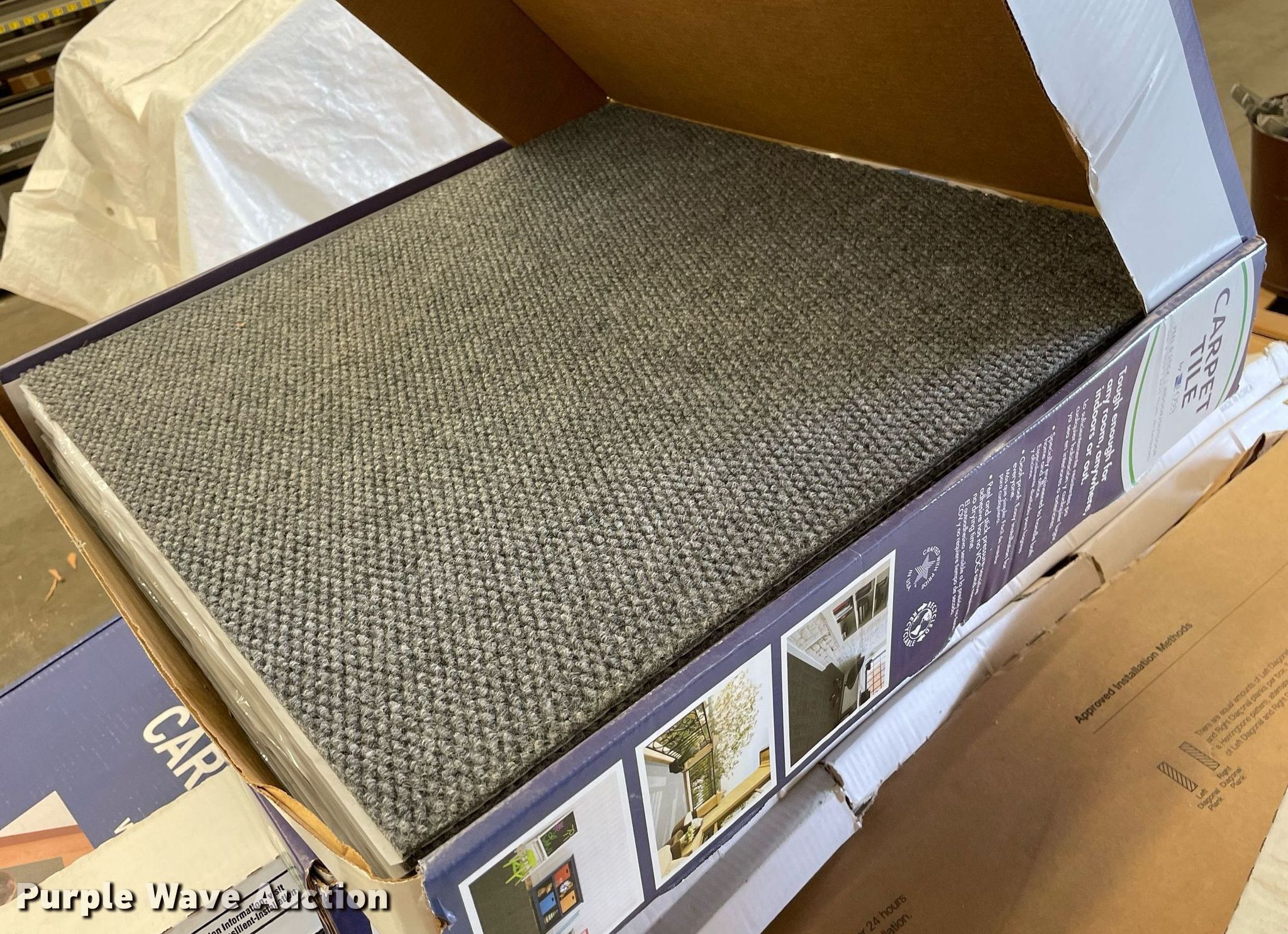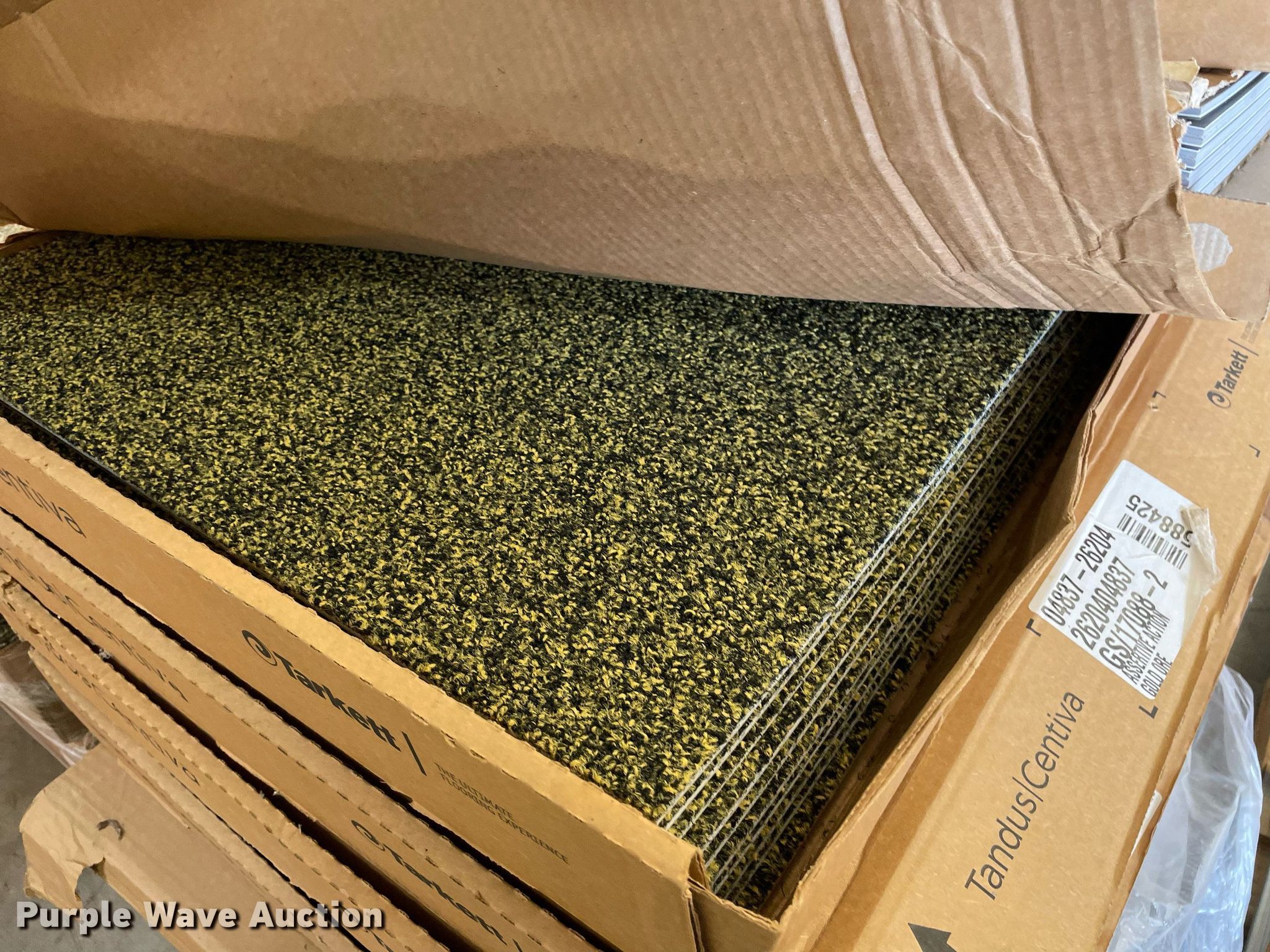 Purple Wave is selling a used Building Materials in Kansas. This item is a Pallet of carpet tiles with the following: Unused