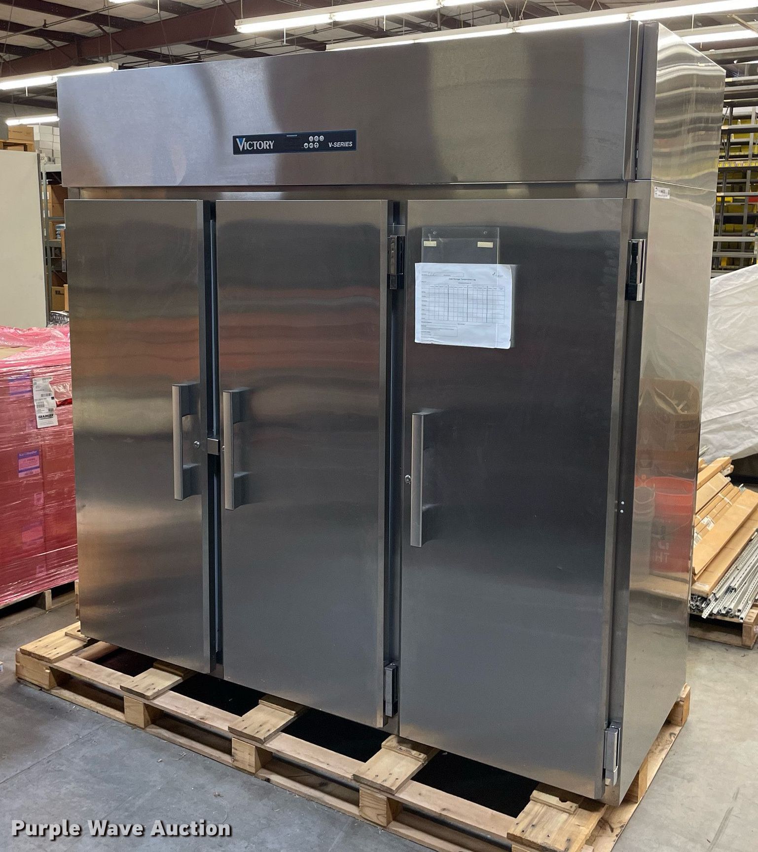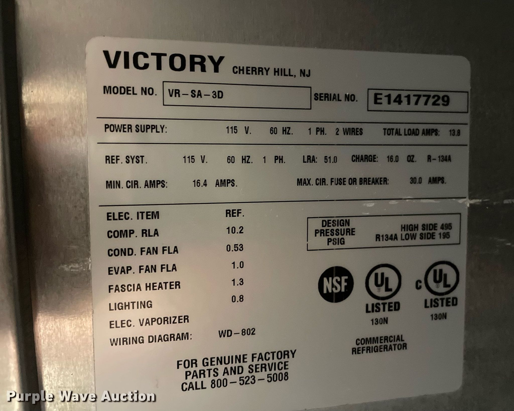 Purple Wave is selling a used Restaurant Equip. in Kansas. This item is a Victory VR-SA-3D refrigerator with the following: Serial: E1417729, Phase: Single, Volts: 115