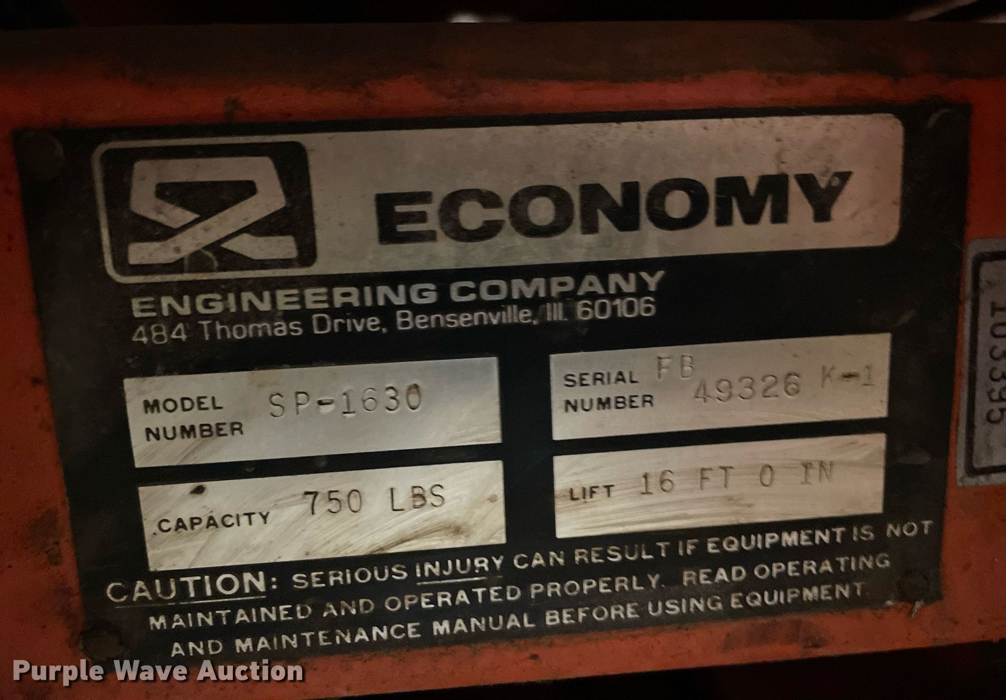 Purple Wave is selling a used Scissor or Vertical Lift in Kansas. This item is a Economy SP-1630 scissor lift with the following: Serial: FB49326K-1