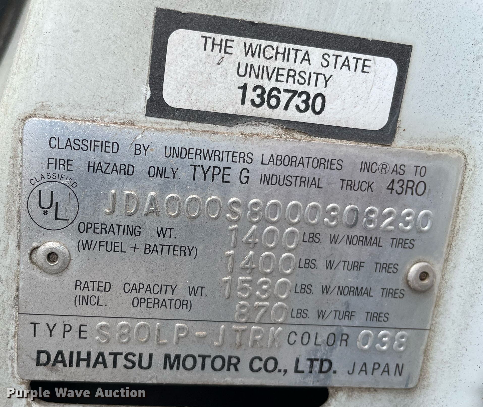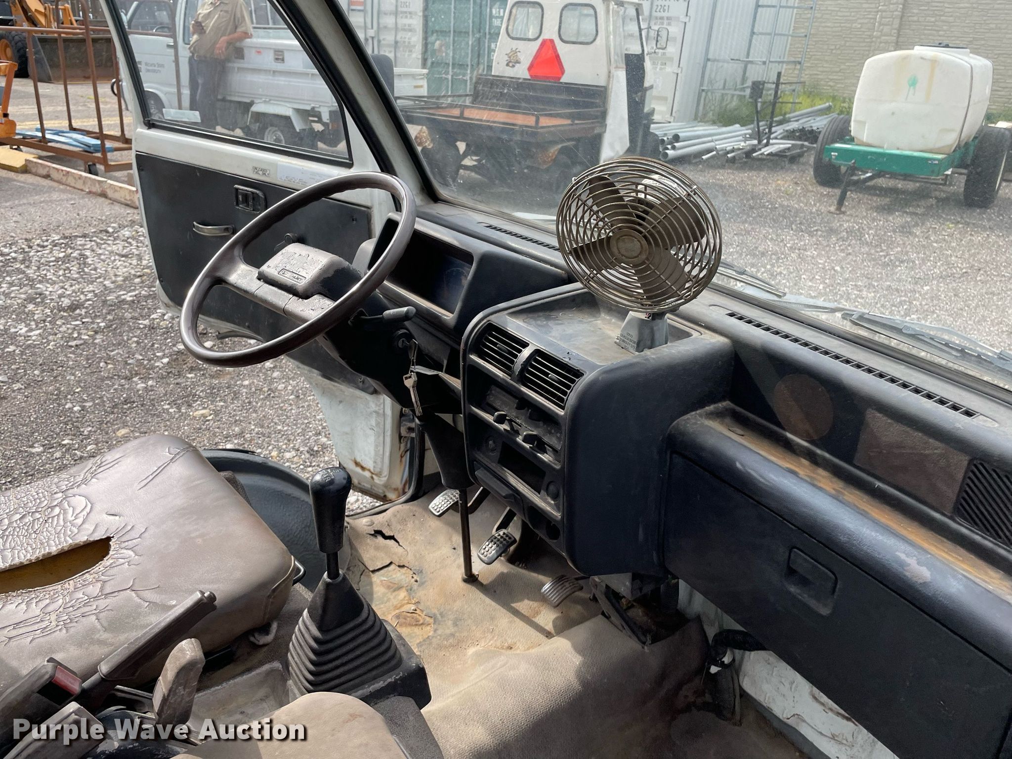1992 Daihatsu S80LP-JTRK mini truck. Miles: 44,058 on odometer, VIN: JDA000S8000308230. Engine Cylinders: 3, Fuel type: Gas, Electric start. Transmission Manual. Operators station Enclosed cab, Heat, Passengers: 2. Features Bed 66" L x 55" W. Tires Size: 20x8.00-10. Kansas Non-Highway title. Title distribution may be delayed up to 14 days from verification of funds. Wichita State University. 1845 N Fairmount Box 23. Wichita, KS 67260