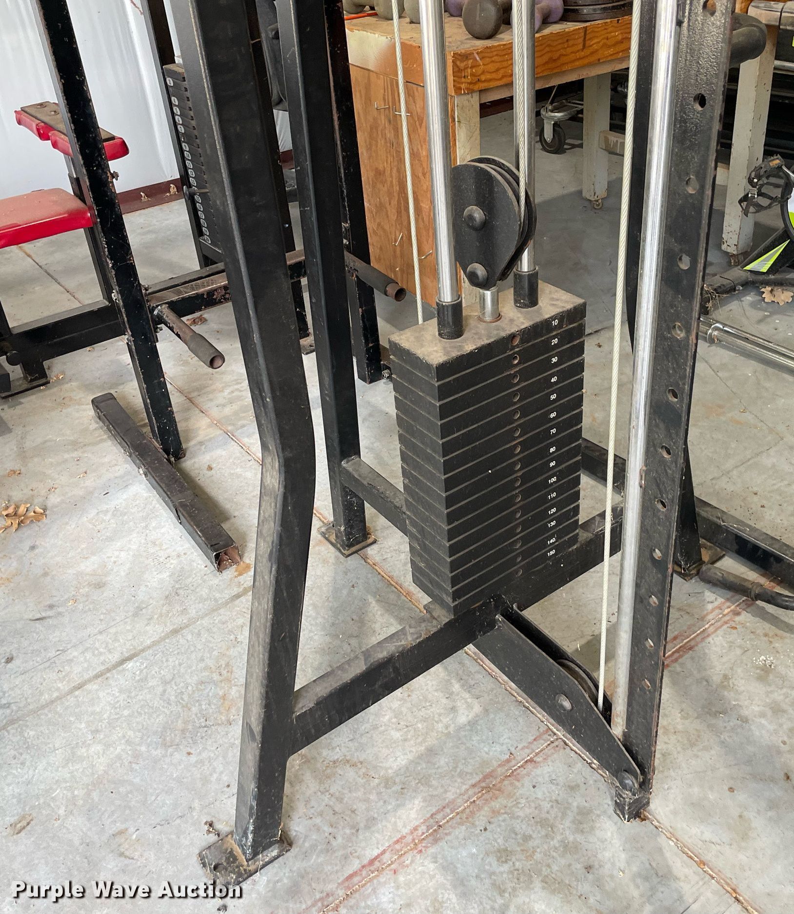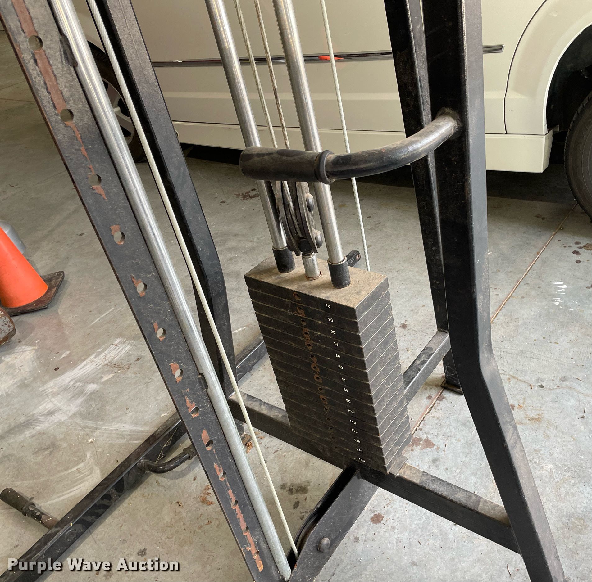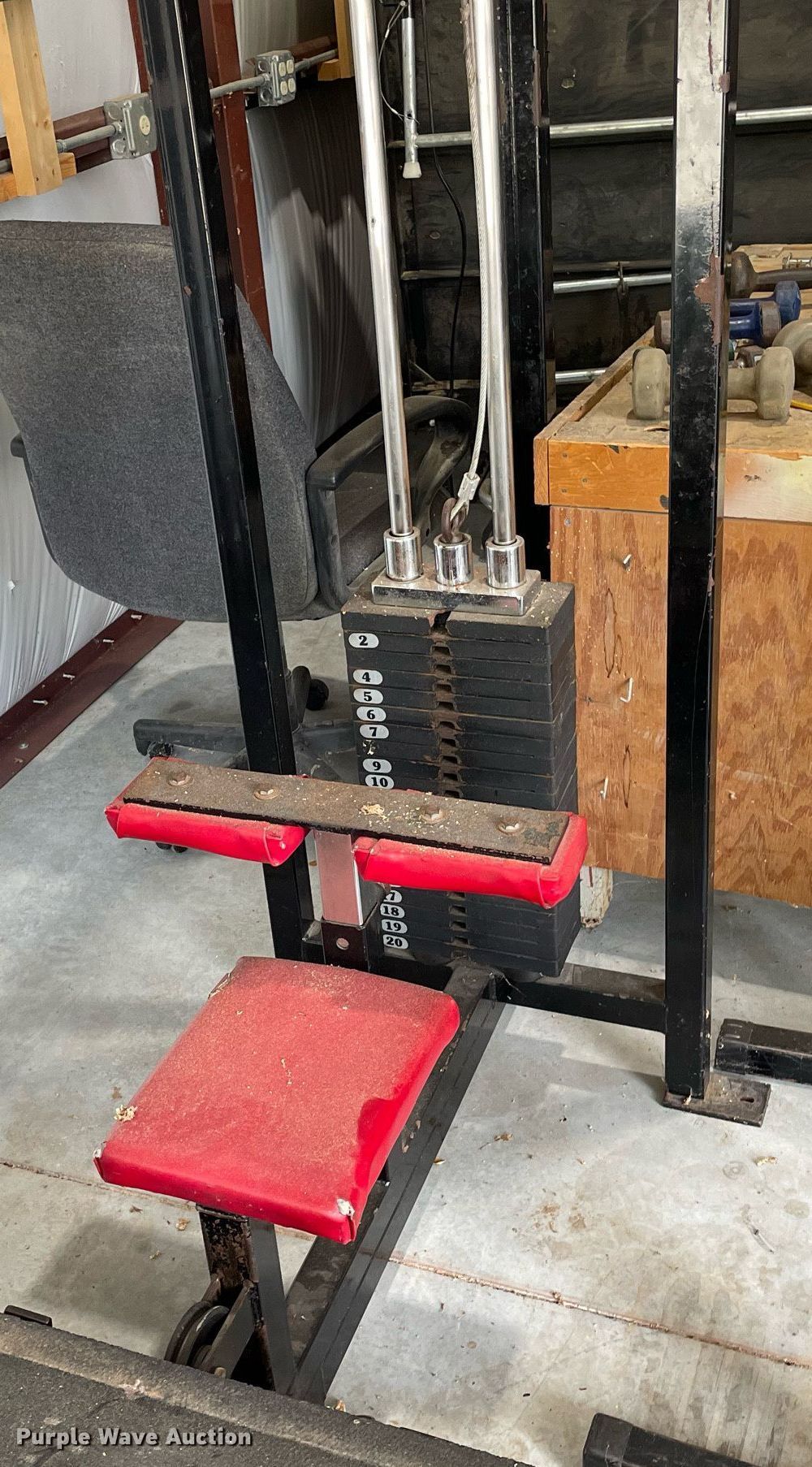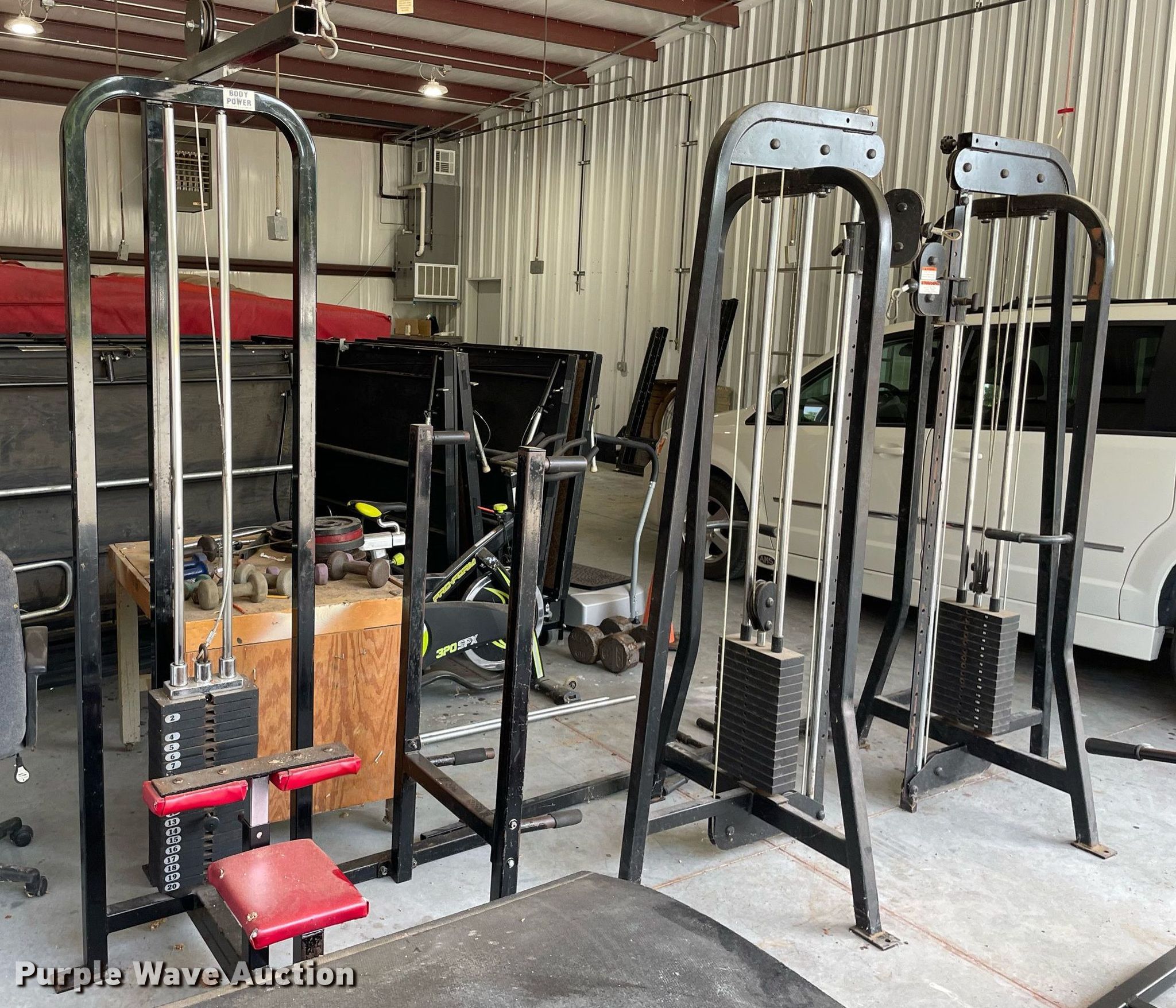 Purple Wave is selling a used Sporting Goods in Kansas. This item is a Exercise equipment with the following: Body Power lat pull down machine, Cable crossover machine, Pro form 320 SPX spin bike, Dip station, Weight plates:, (5) 10 lbs, (6) 5 lbs, (5) 35 lbs, (10) dumbbells, (2) 80lb dumbbells not included