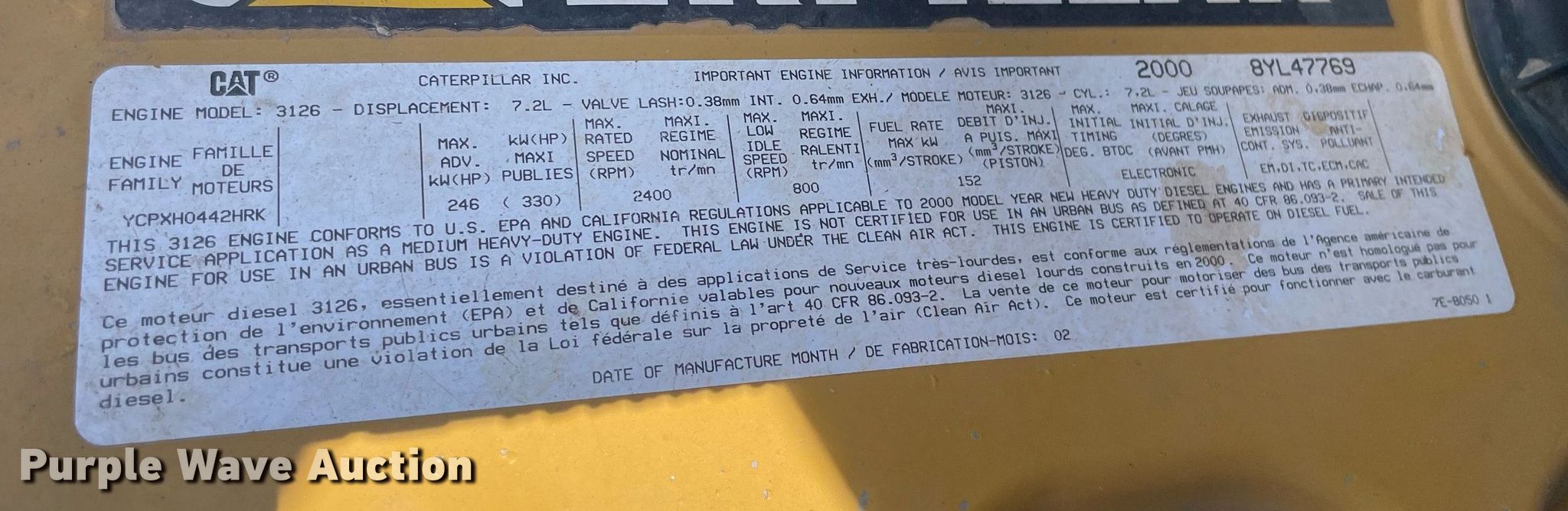 2000 Blue Bird school bus. Miles: 219,391 on odometer, VIN: 1GBL7T1C4YJ517055, Unit #: 22. Engine Caterpillar 3126, Displacement: 7.2L, Cylinders: 6, Fuel type: Diesel. Transmission Automatic. Chassis Axles: Single, Suspension: Spring, Brakes: Hydraulic, GVWR: 27,960 lbs. Interior Heat, Heated mirrors, Passengers: 59. Tires Front: 10R22.5, Rear: 11R22.5. Notes Engine issues Compression issues , Smokes. Kansas title. Title distribution may be delayed up to 14 days from verification of funds. USD 312 Haven. 414 West Main Street. Haven, KS 67543