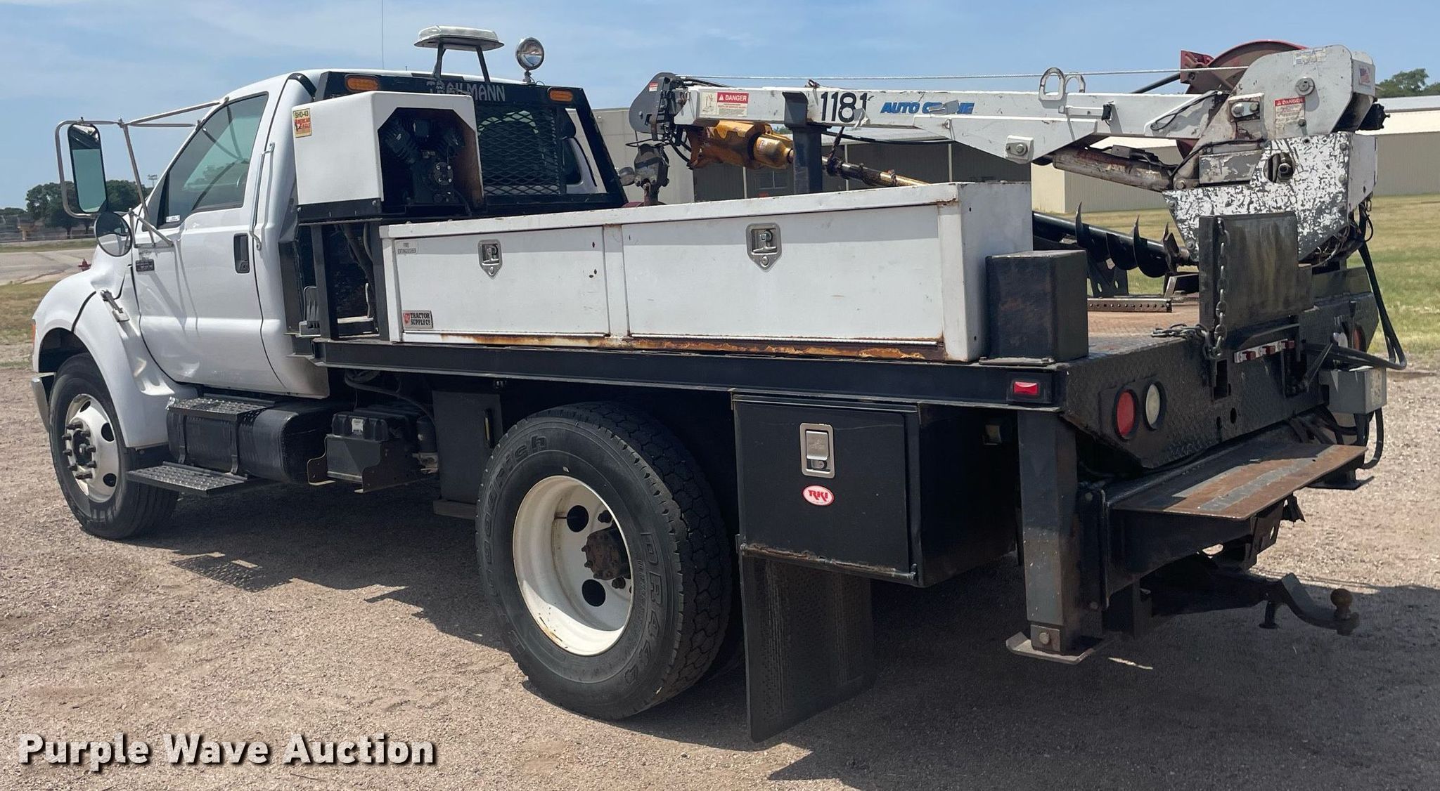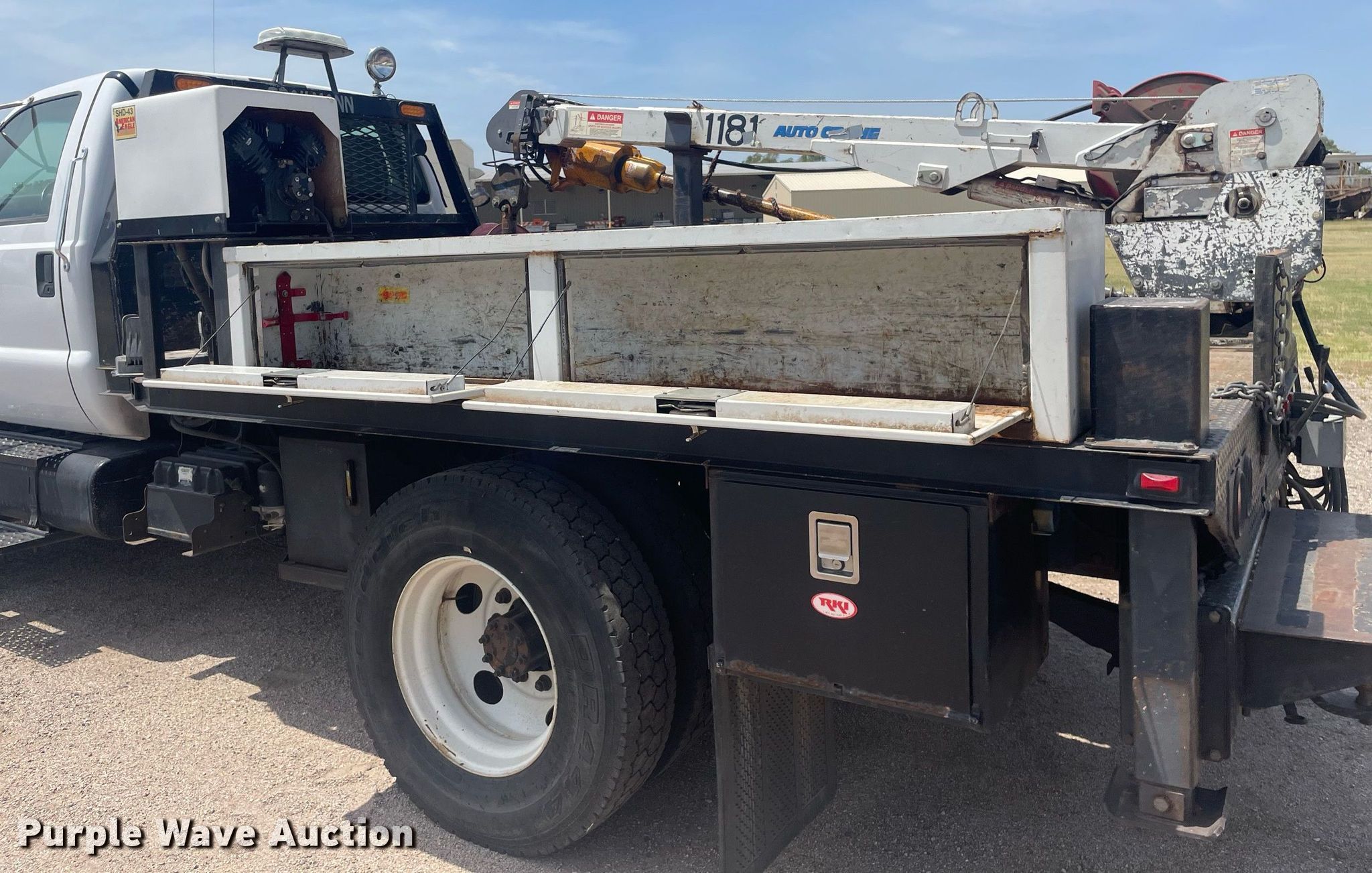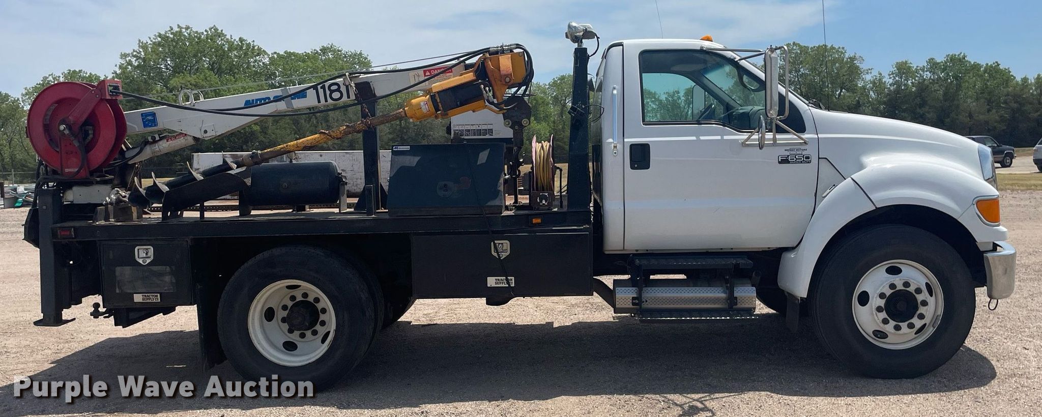 2008 Ford F650 Super Duty XL flatbed truck. Miles: 340,428 on odometer, VIN: 3FRWF65F78V688349. Engine Cummins, Displacement: 6.7L, Cylinders: 6, Fuel type: Diesel. Transmission Automatic. Chassis Axles: Single, Suspension: Spring, Brakes: Air, PTO, GVWR: 26,000 lbs FAWR: 8,500 lbs, RAWR: 1,750 lbs. Interior AC, Heat, Cruise control. Features Flatbed Mann Made Products , 12' 7" L x 96" W, Crane Auto Crane 4004H, Boom Telescopic, Sections: 3, Maximum lift capacity: 4,000 lbs, Boom controls Ground, Remote control, Crane block, Lift chart, Danuser auger Diameter: 9", American Eagle SHD-43 air compressor. Tires Size: 11R22.5. Notes Intermittent gauge cluster issues. Kansas title. Title distribution may be delayed up to 14 days from verification of funds. Seller is a government entity who will be assigning and distributing the title. Please contact the seller for distribution questions. Reno County. 600 Scott Blvd. South Hutchinson, KS 67505