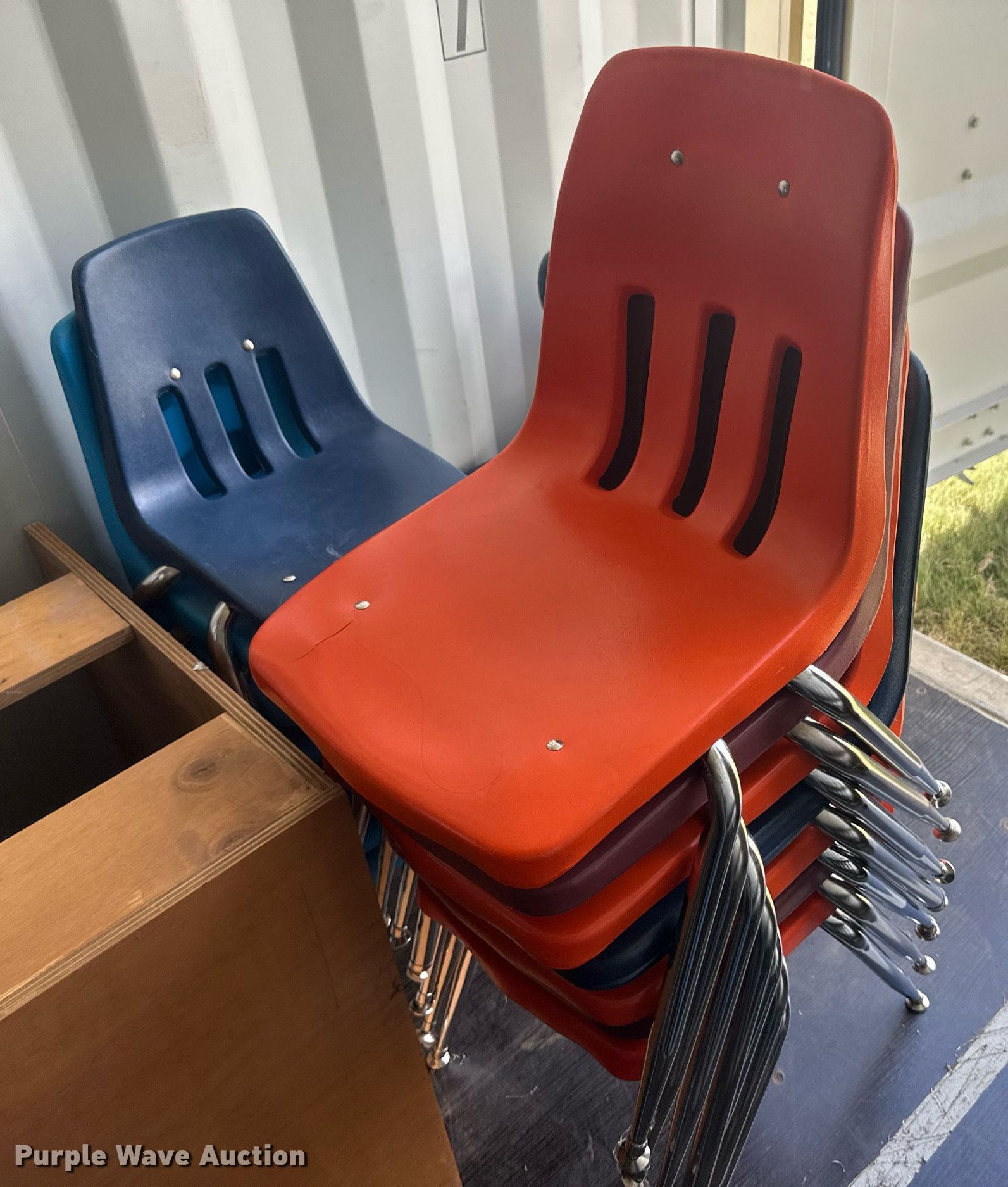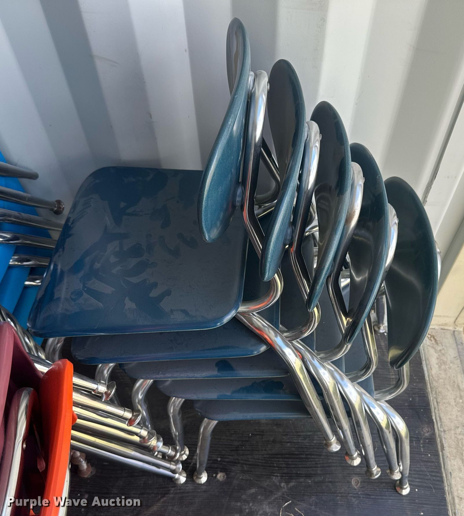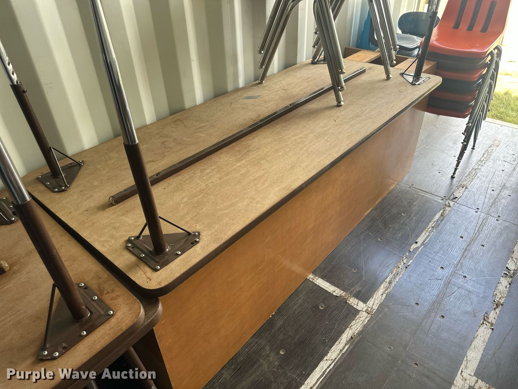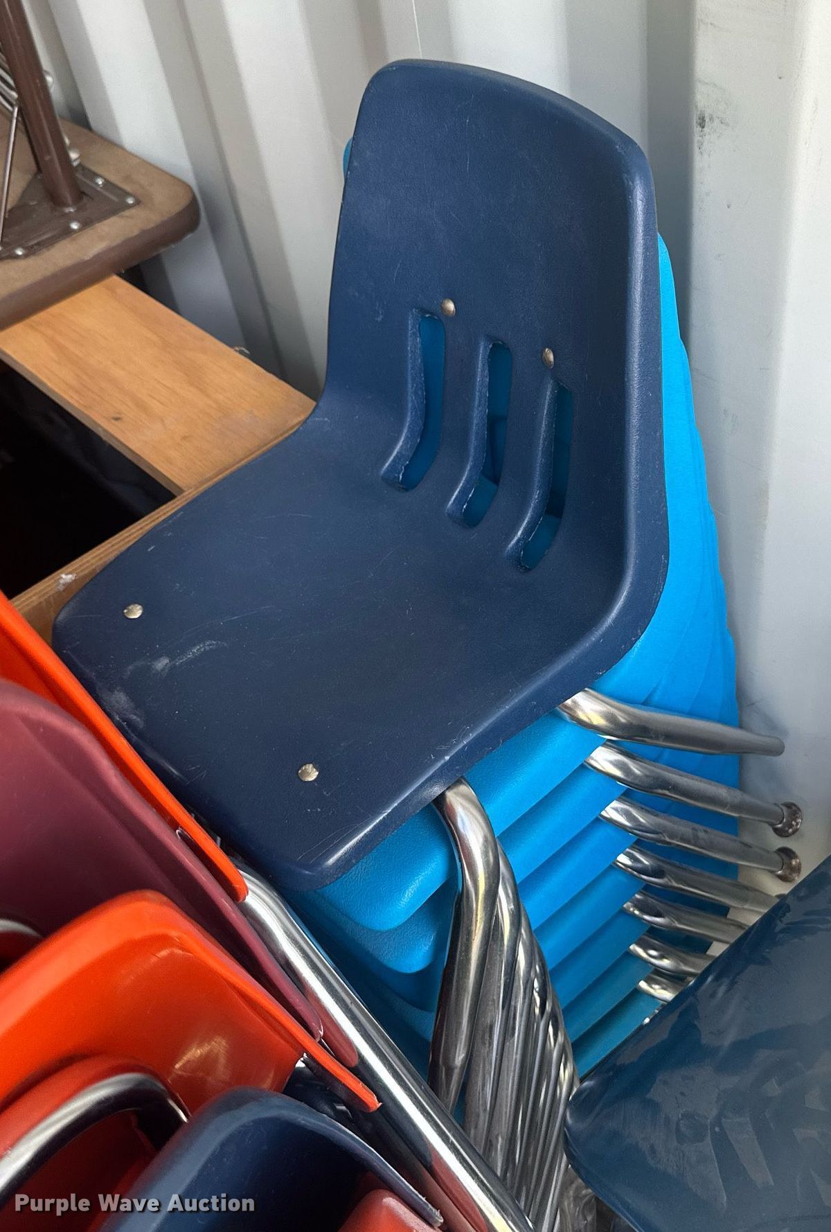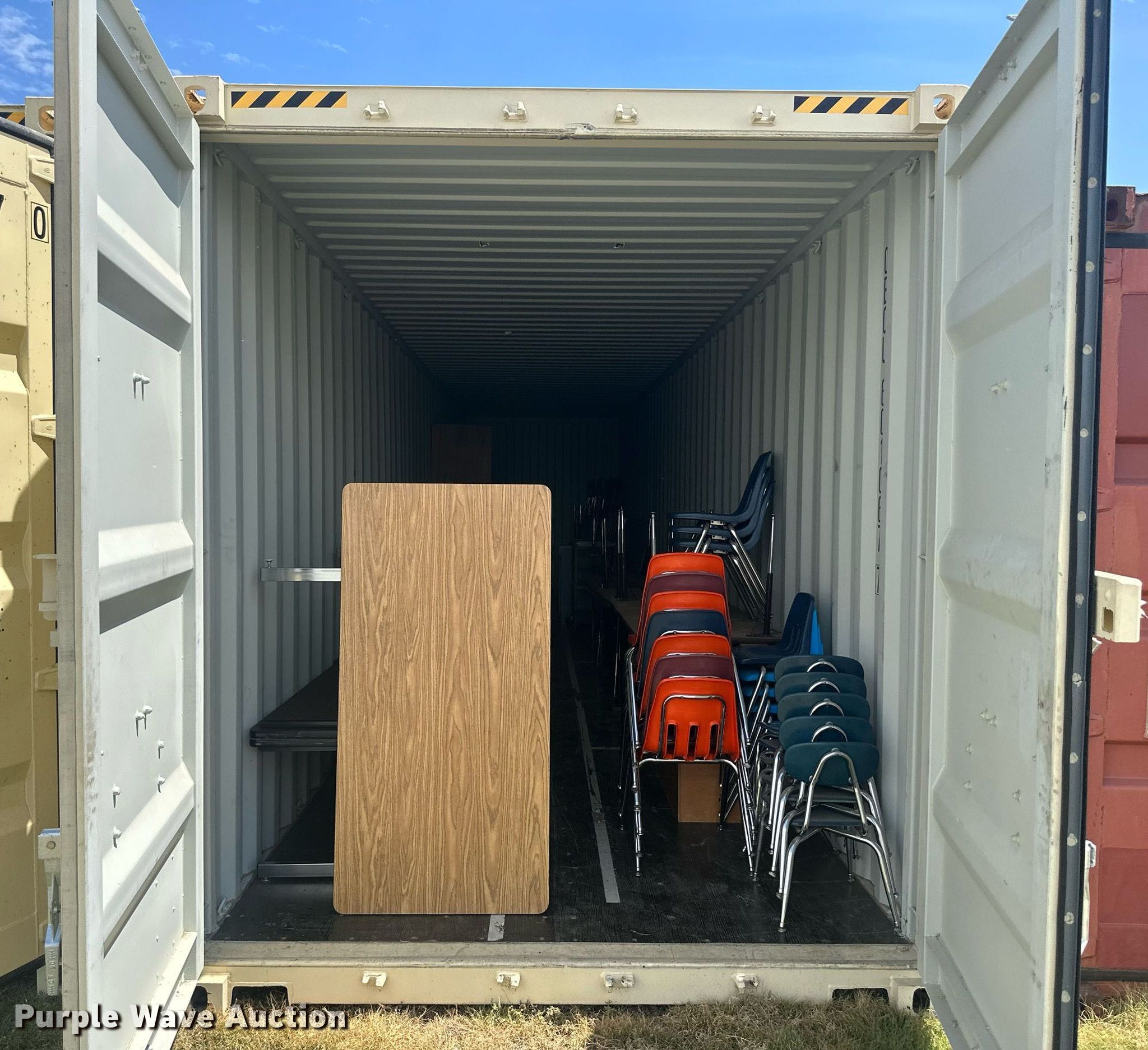 Purple Wave is selling a used Storage or Shipping Container in Kansas. This item is a Storage container with the following: 38' L x 8' W x 9' 6" H, Office furniture, (26) student chairs, (21) desks, (11) folding chairs, (3) filing cabinets, (2) whiteboards, Rolling carts