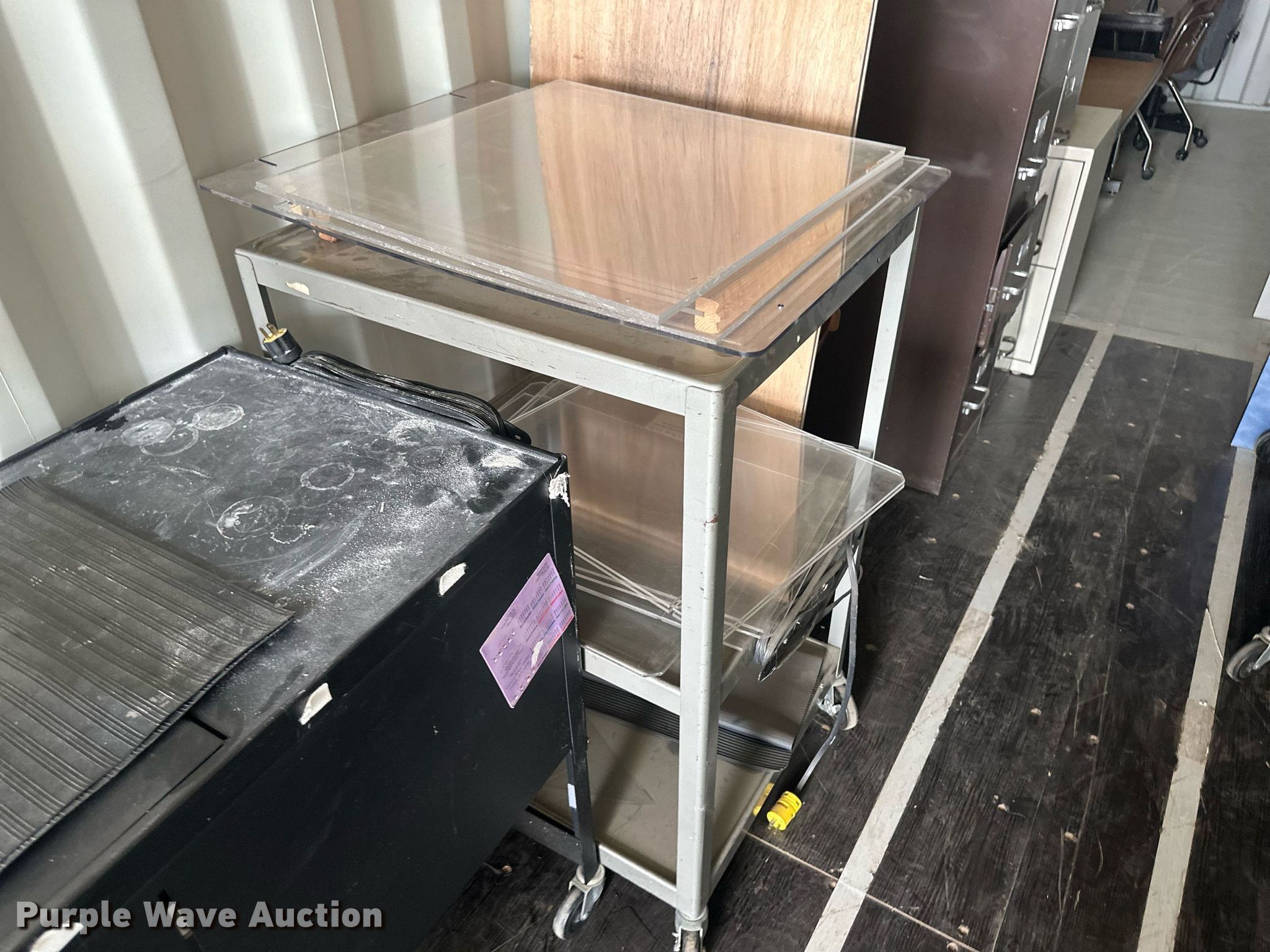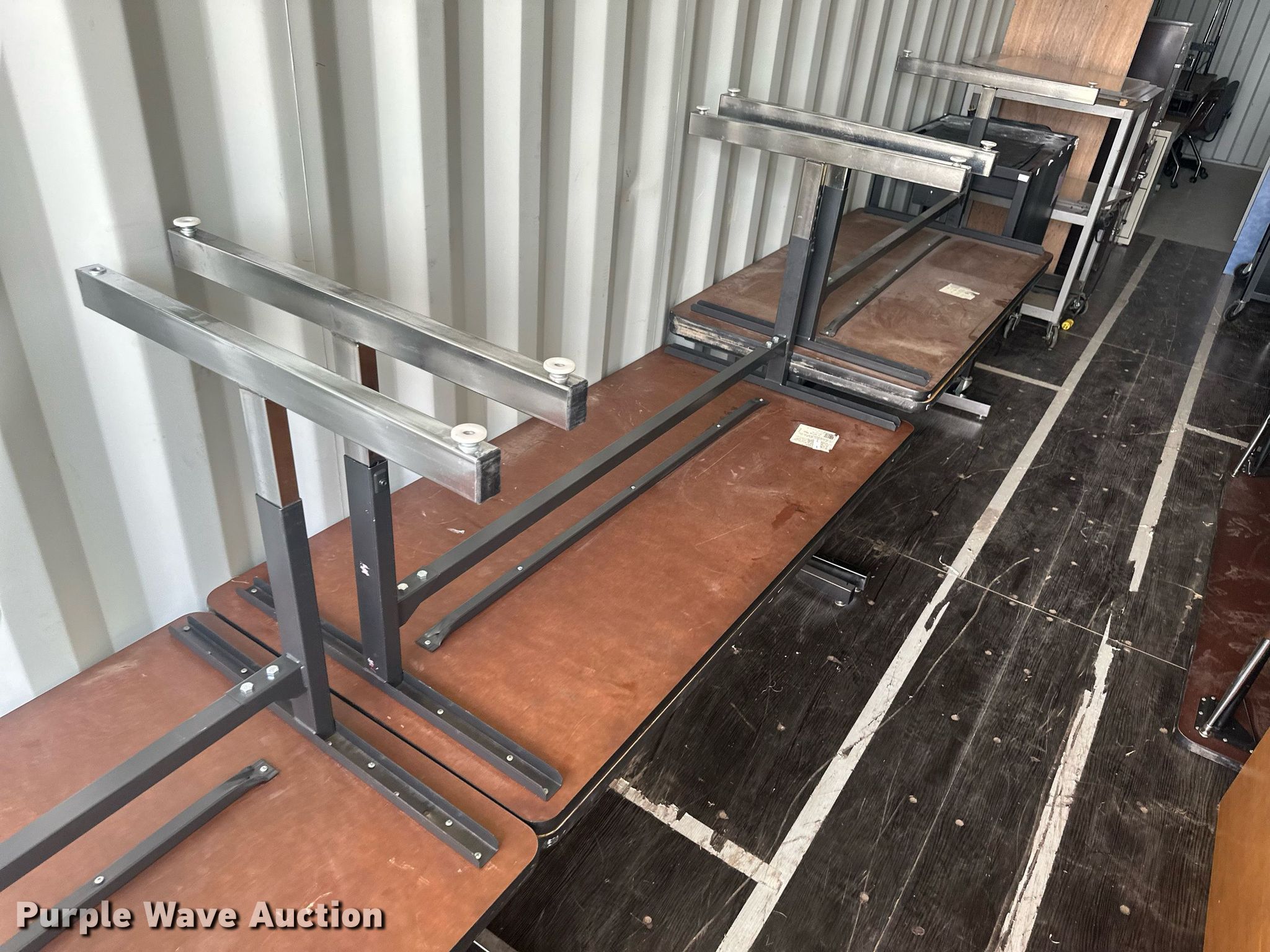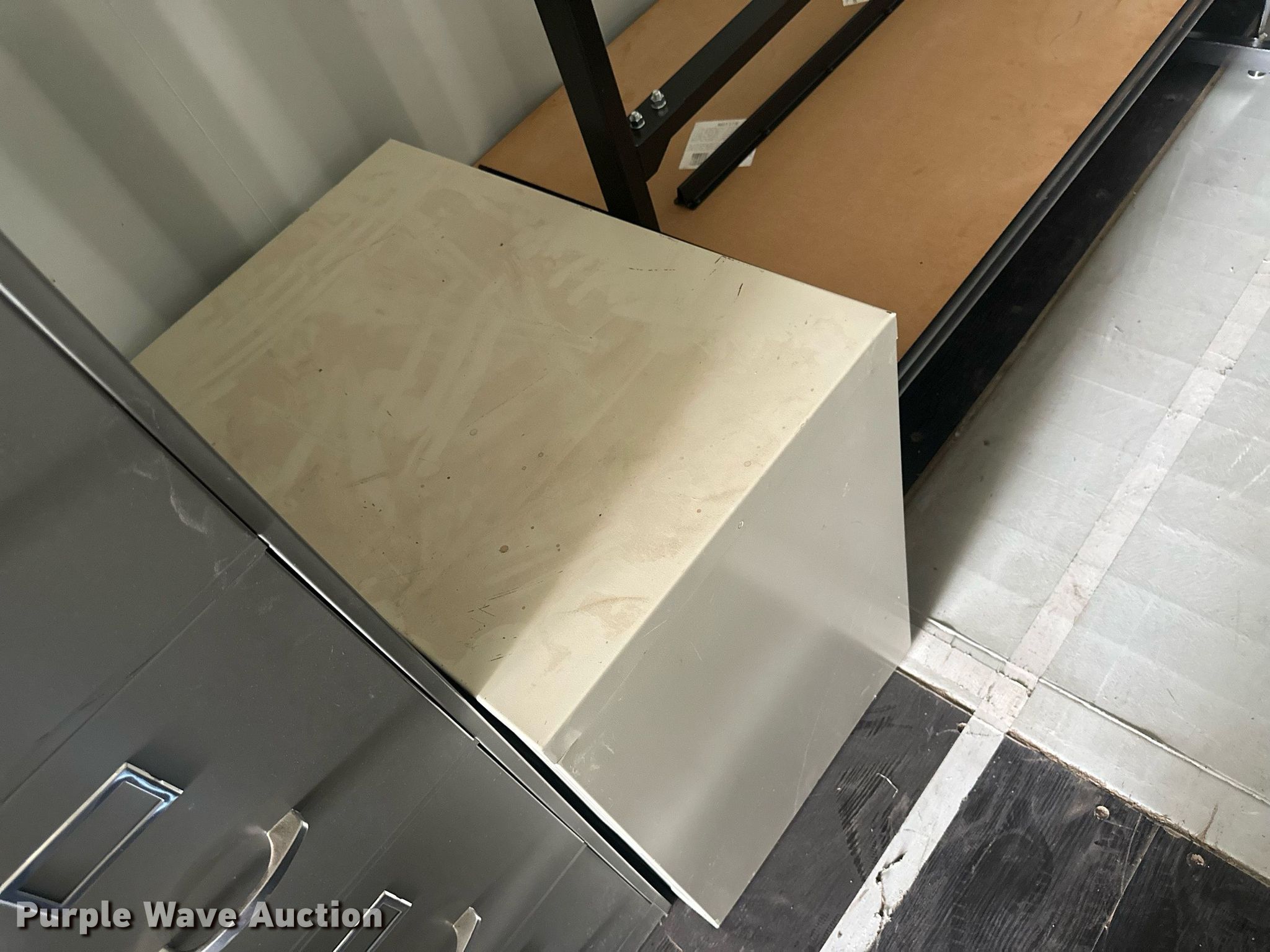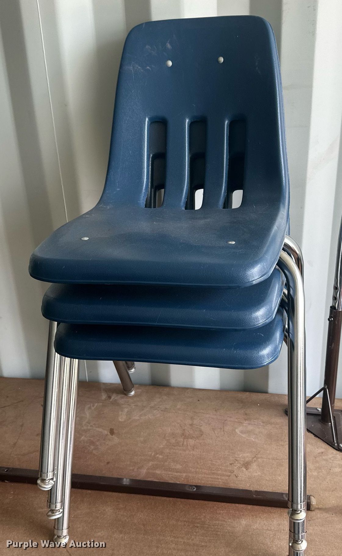 Purple Wave is selling a used Storage or Shipping Container in Kansas. This item is a Storage container with the following: 38' L x 8' W x 9' 6" H, Office furniture, (26) student chairs, (21) desks, (11) folding chairs, (3) filing cabinets, (2) whiteboards, Rolling carts