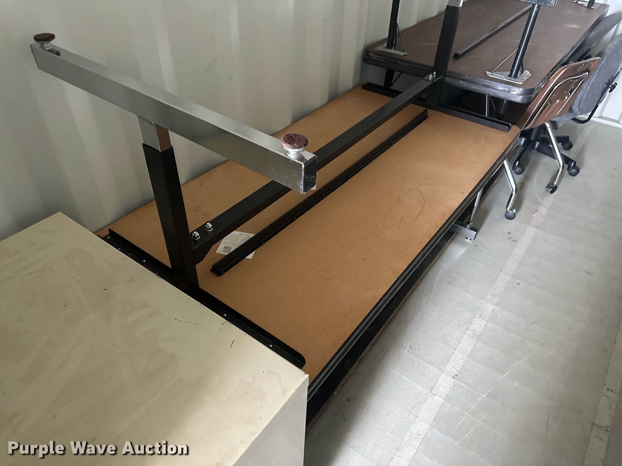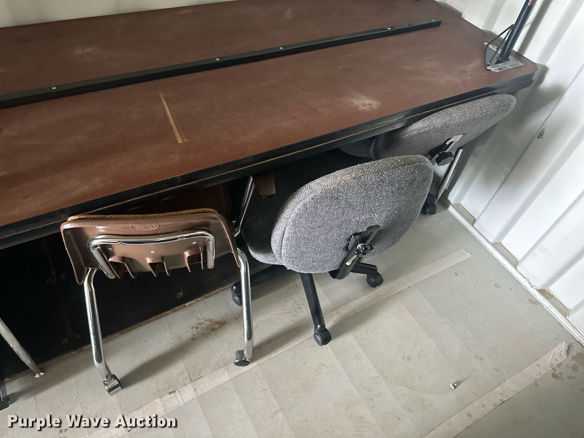 Storage container. 38' L x 8' W x 9' 6" H, Office furniture (26) student chairs, (21) desks, (11) folding chairs, (3) filing cabinets, (2) whiteboards, Rolling carts. USD 457. 4665 U.S. 50. Garden City, KS 67846