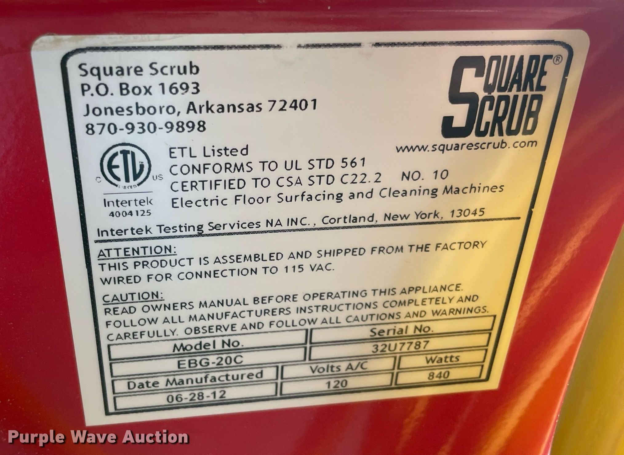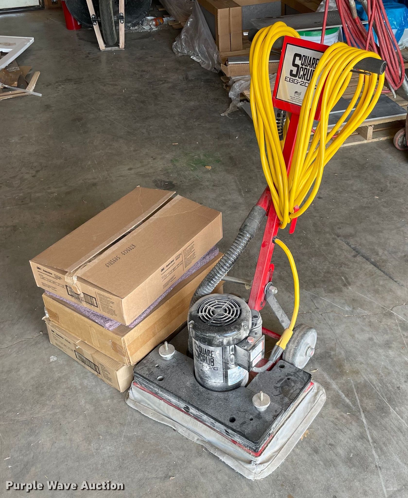 Purple Wave is selling a used All Other Household Items in Oklahoma. This item is a Square Scrub EBG-20/C floor scrubber with the following: Serial: 32U7787, Width: 18", Volts: 115