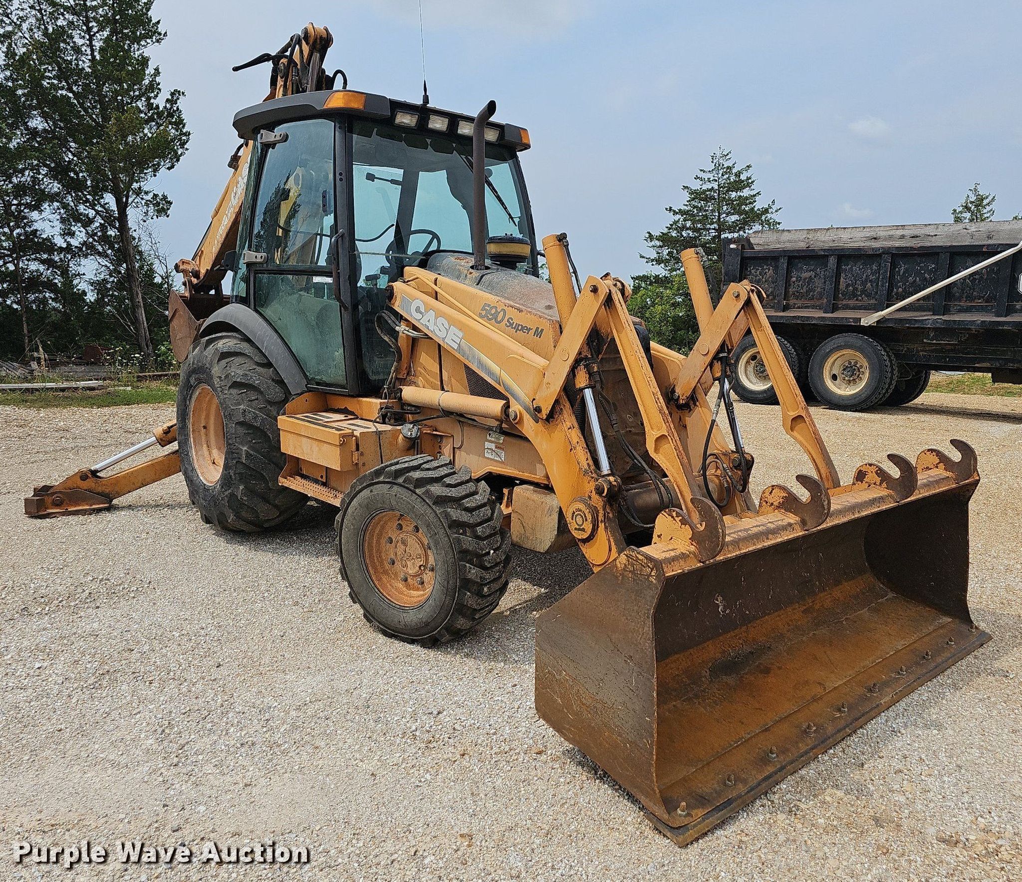 2002 Case 590 Super M backhoe. Hours: 4,844 on meter, Serial: JJG0287742. Engine Cylinders: 4, Fuel type: Diesel. Transmission Powershift, 4F - 4R. Operators station Enclosed cab, AC, Heat, Backhoe controls: Four stick Foot control. Features Loader Bucket Width: 94", Cutting edge: Bolt-on, Backhoe Extendable stick, Bucket Width: 24", Cutting edge: Weld-on, Teeth: 5.. Tires Front: 14-17.5, Rear: 21L-24. Miller County. 122 Doyle Rd. Eldon, MO 65026