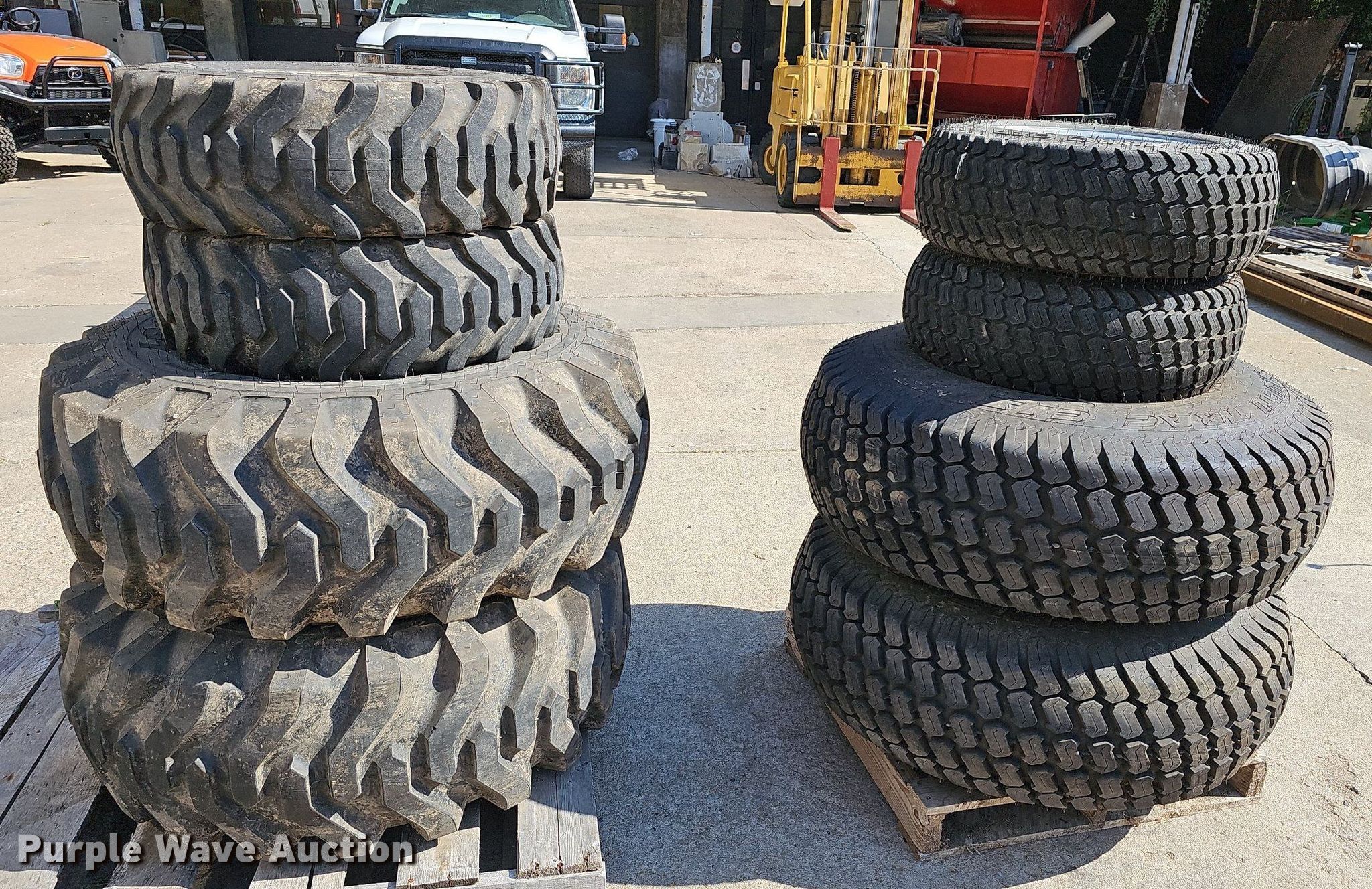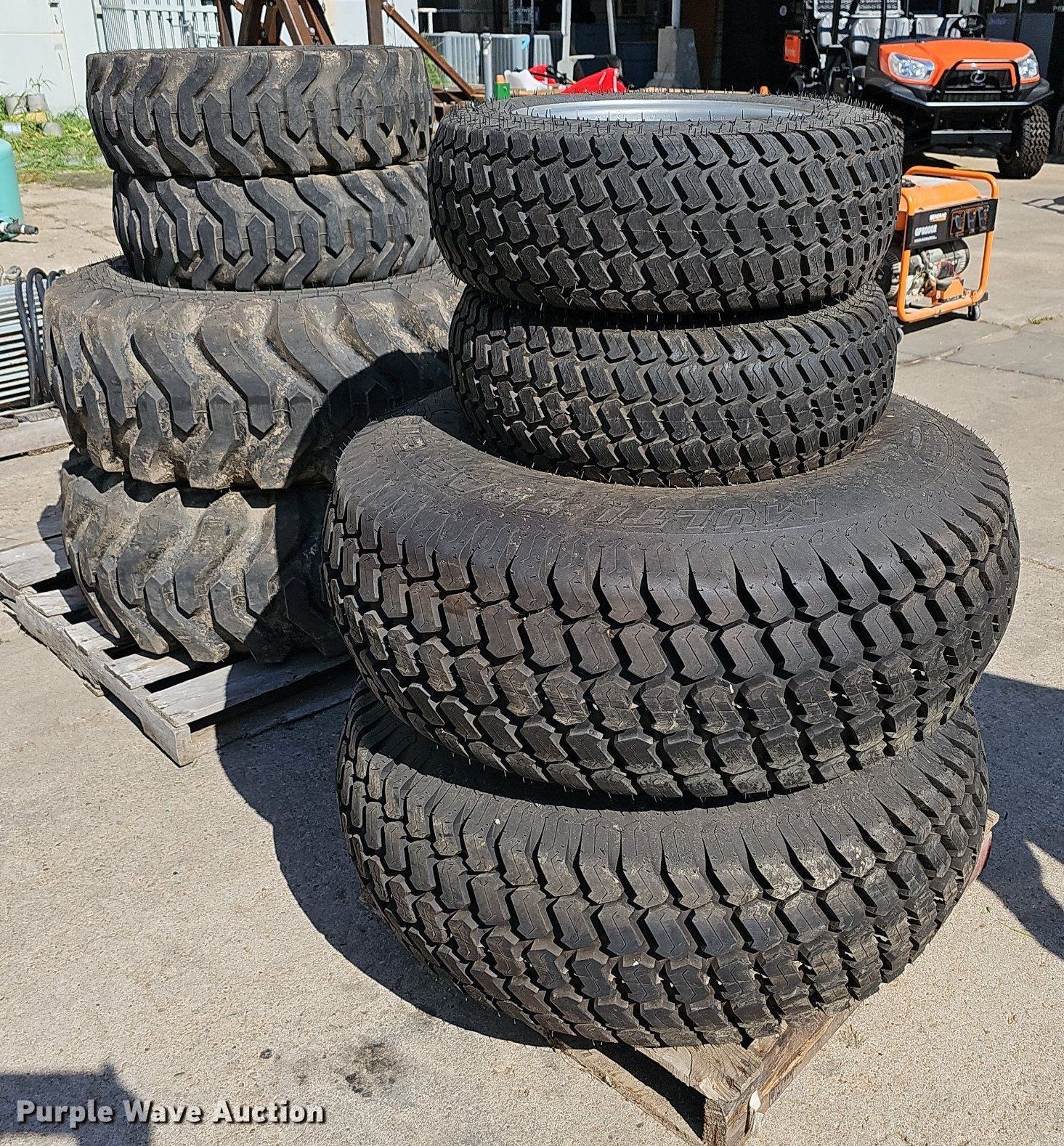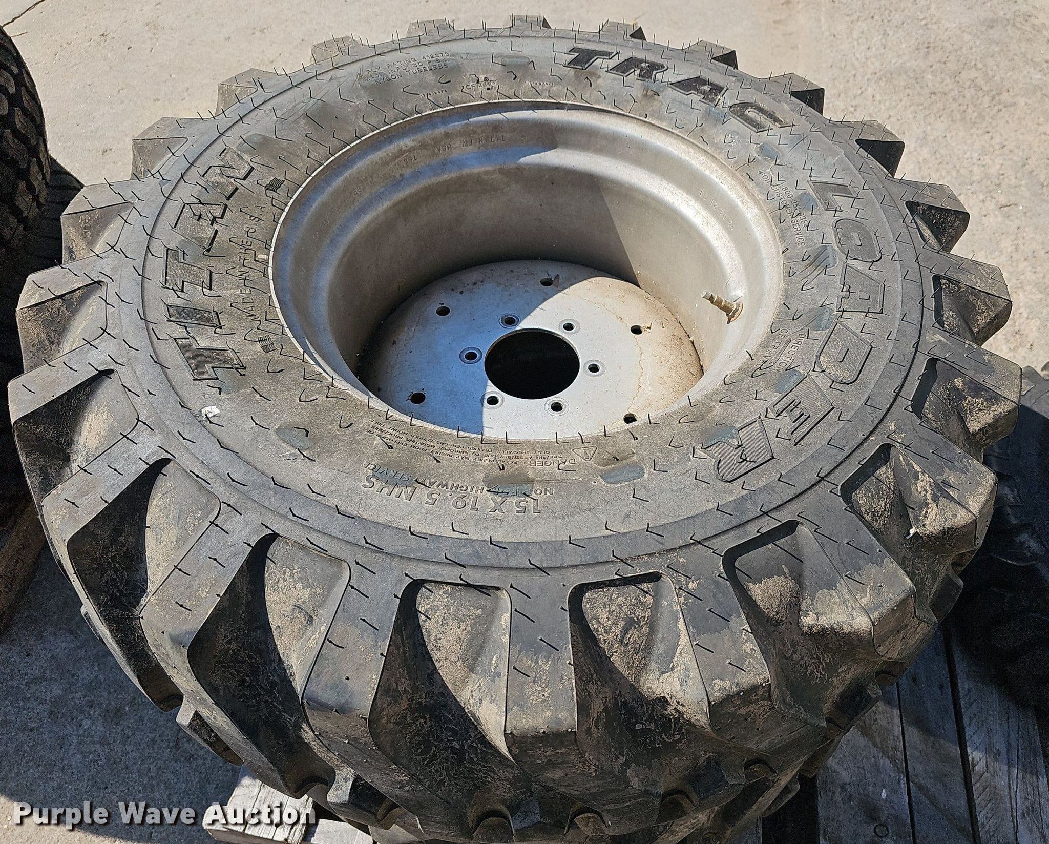 Purple Wave is selling a used Industrial Tires or Tracks in Kansas. This item is a (8) Titan tractor wheels and tires with the following: (2) 24x8.50-14, (2) 13.6-16, (2) 27x8.59-15, (2) 15x19.5