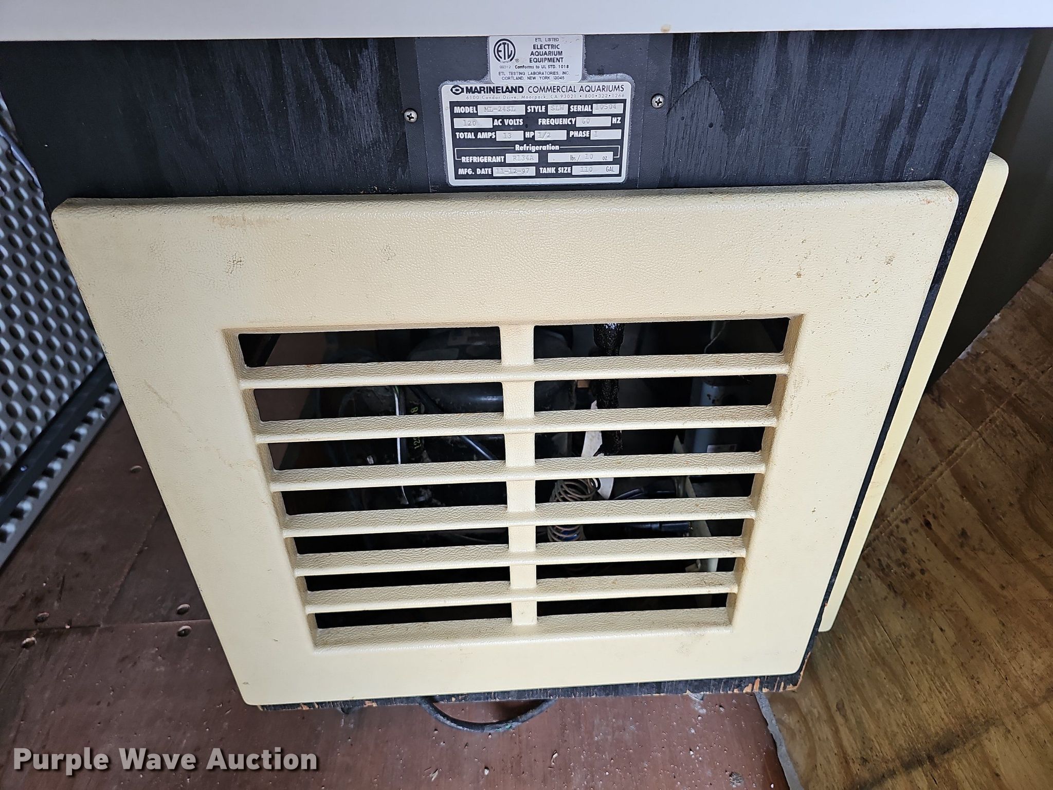 Purple Wave is selling a used All Other Household Items in Kansas. This item is a 1997 Marineland Commercial Aquariums ML24SL aquarium with the following: 50" L x 27" W 53" H, Phase: single, Capacity: 110 gallons