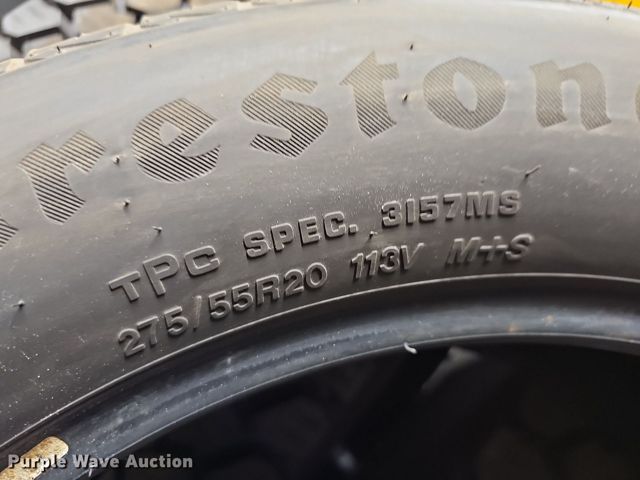 Purple Wave is selling a used Industrial Tires or Tracks in Kansas. This item is a (4) Firestone 275/55R20 tires with the following: (4) Firestone 275/55R20 tires. Olathe, KS 66061
